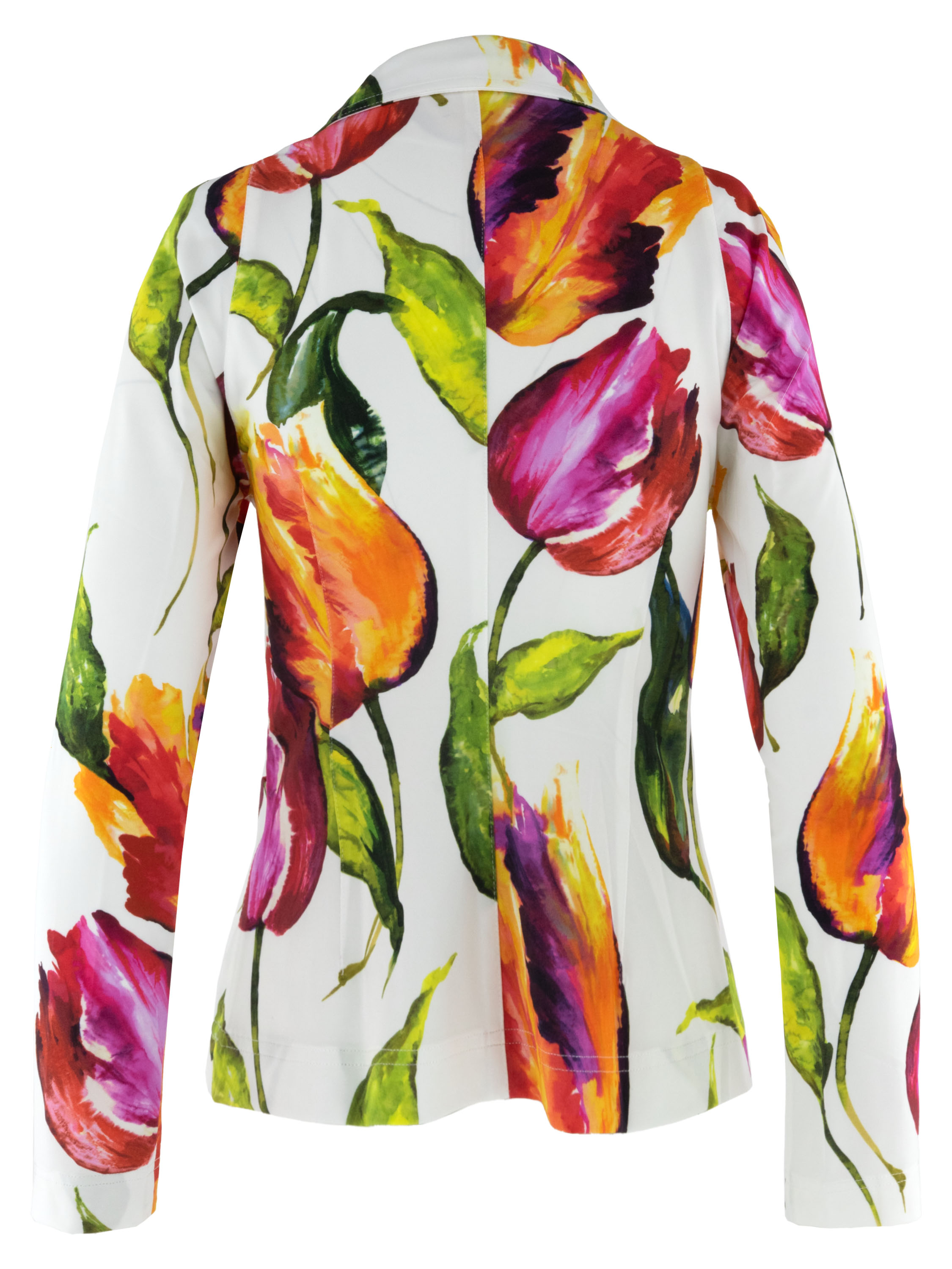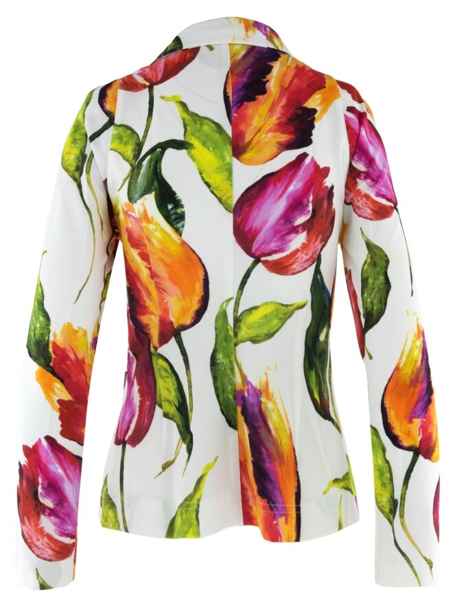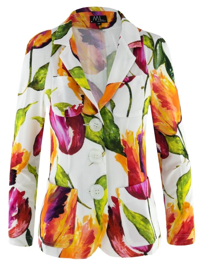 Blazer by ML Collections featuring a multicoloured tulip print on an off-white background. The vibrant design lends the piece a distinctive and feminine character. Fastened with three buttons and unlined, it offers a light and comfortable drape. This blazer should not be washed.