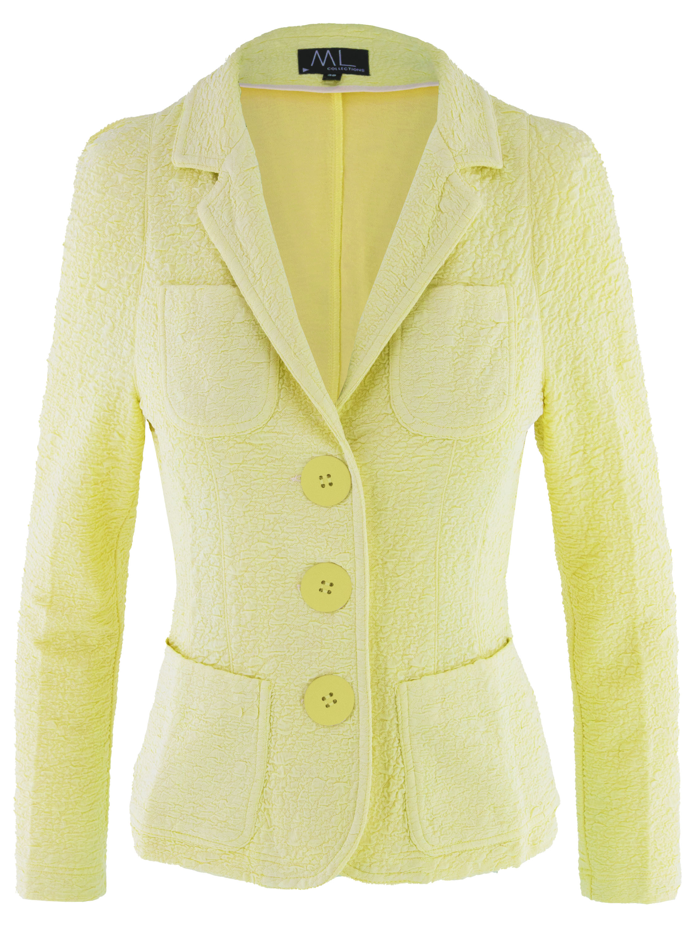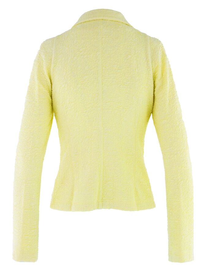 Blazer by ML Collections crafted from finely smocked fabric in a soft pastel yellow shade. The delicate texture adds a playful yet refined character to the design. Fastened with three buttons and unlined, it offers a light and fluid drape. This blazer should not be washed.