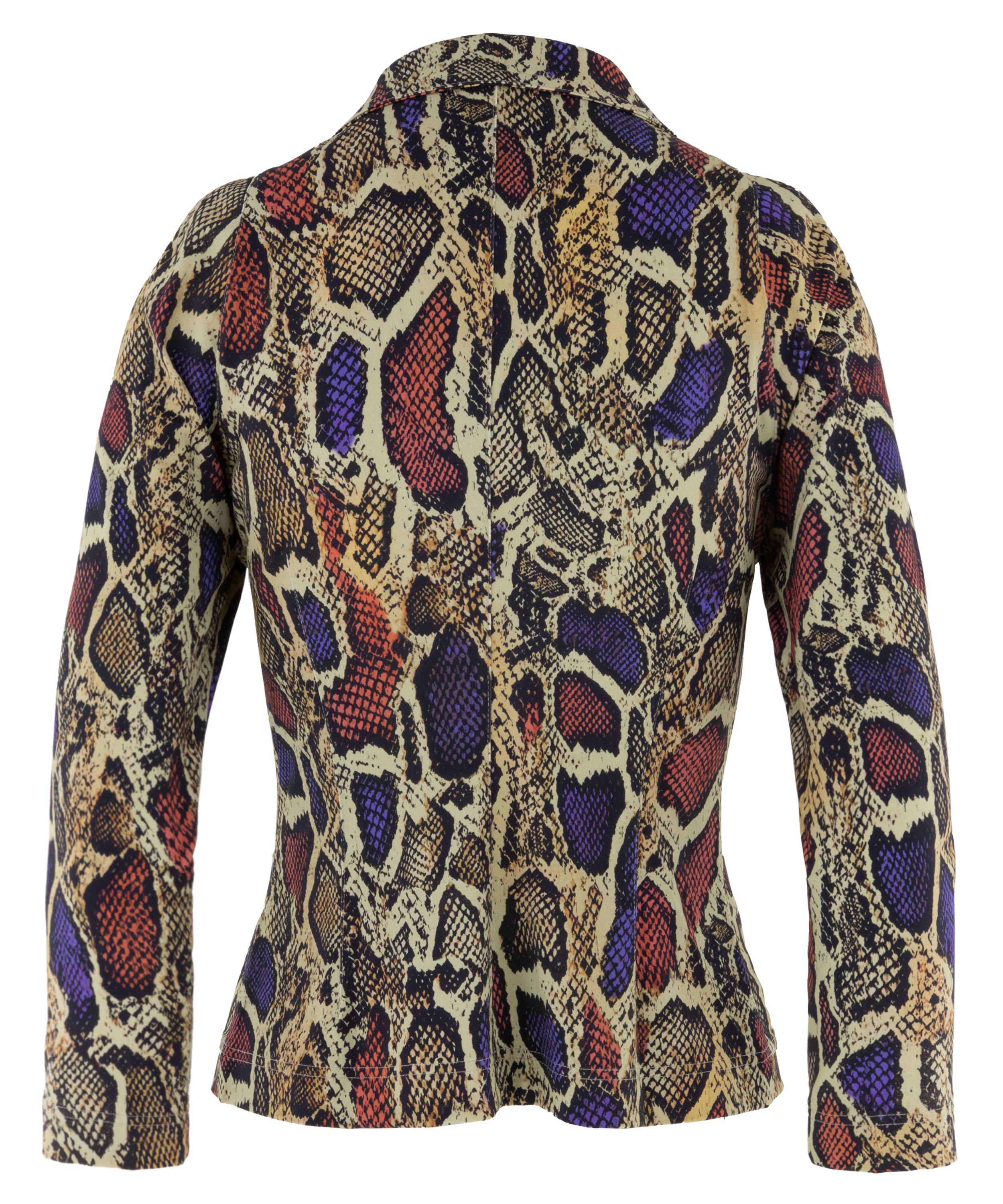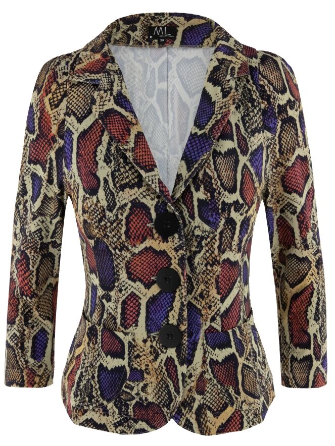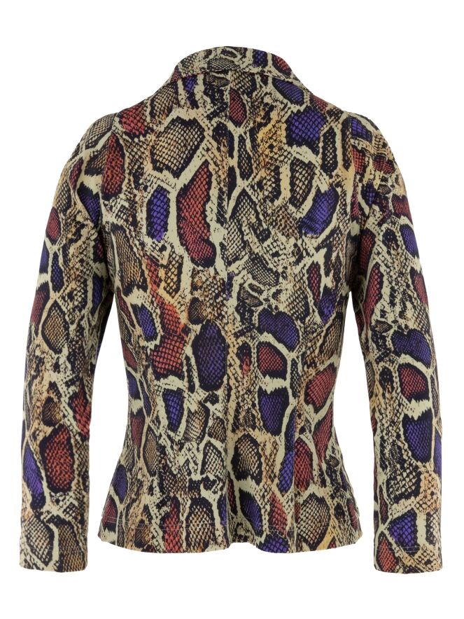 A blazer by ML Collections featuring a python print in purple, red and black on a soft taupe background. The blazer has a three-button closure and is unlined. This blazer must not be washed.