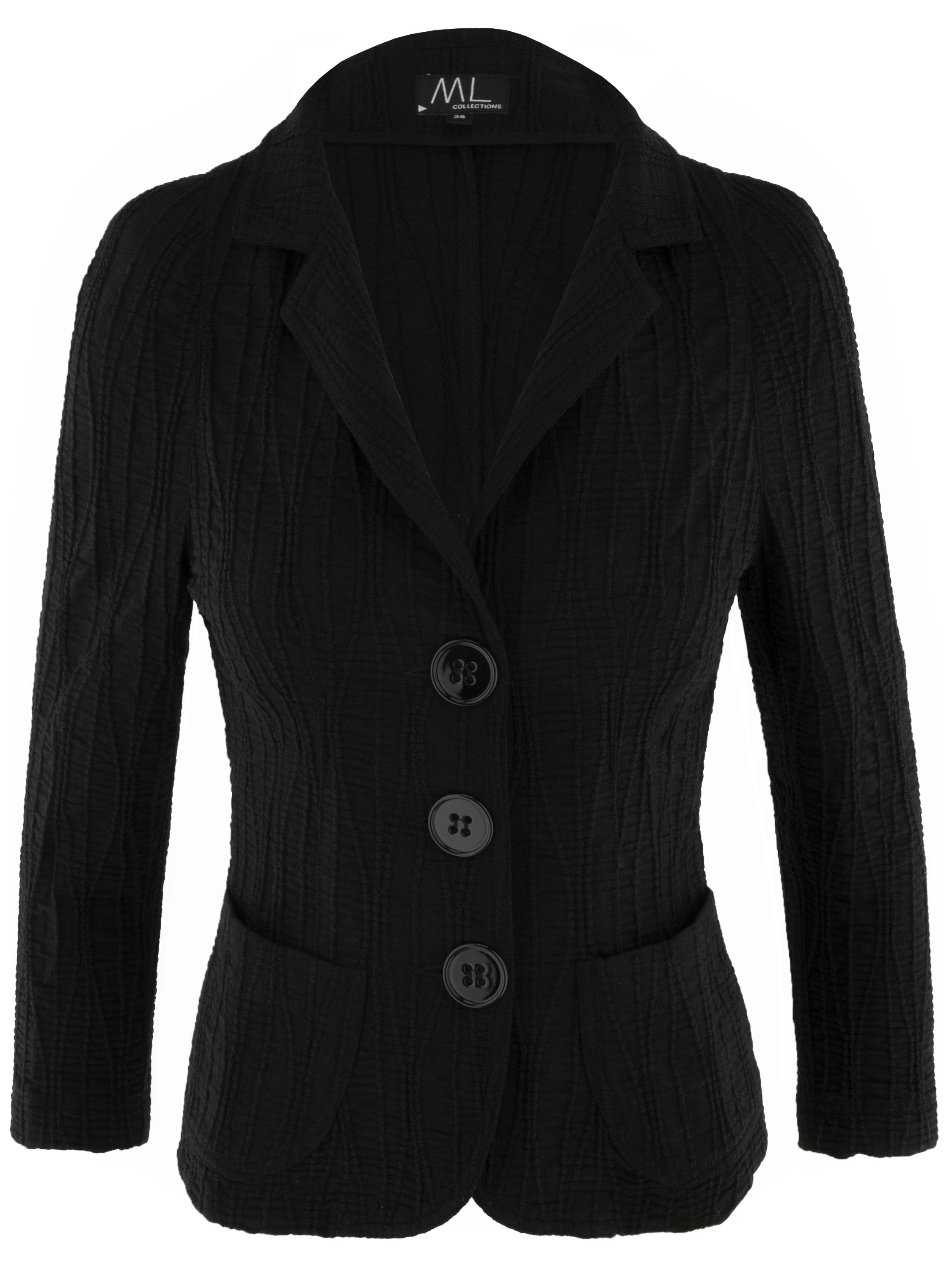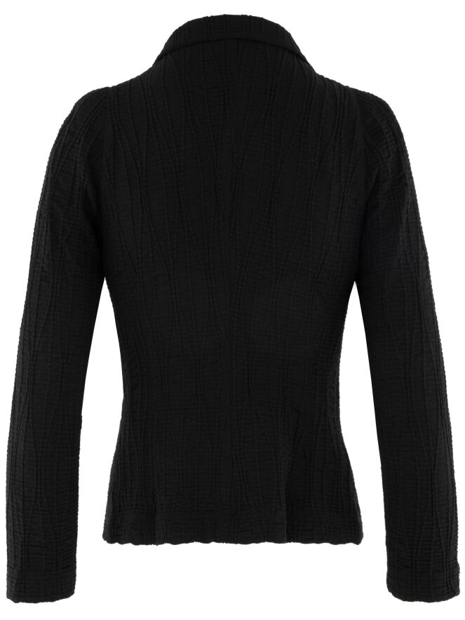 A blazer by ML Collections in black. The fabric is horizontally smocked, overlaid with flowing vertical lines. The blazer features a three-button closure and is unlined. This blazer must not be washed.
