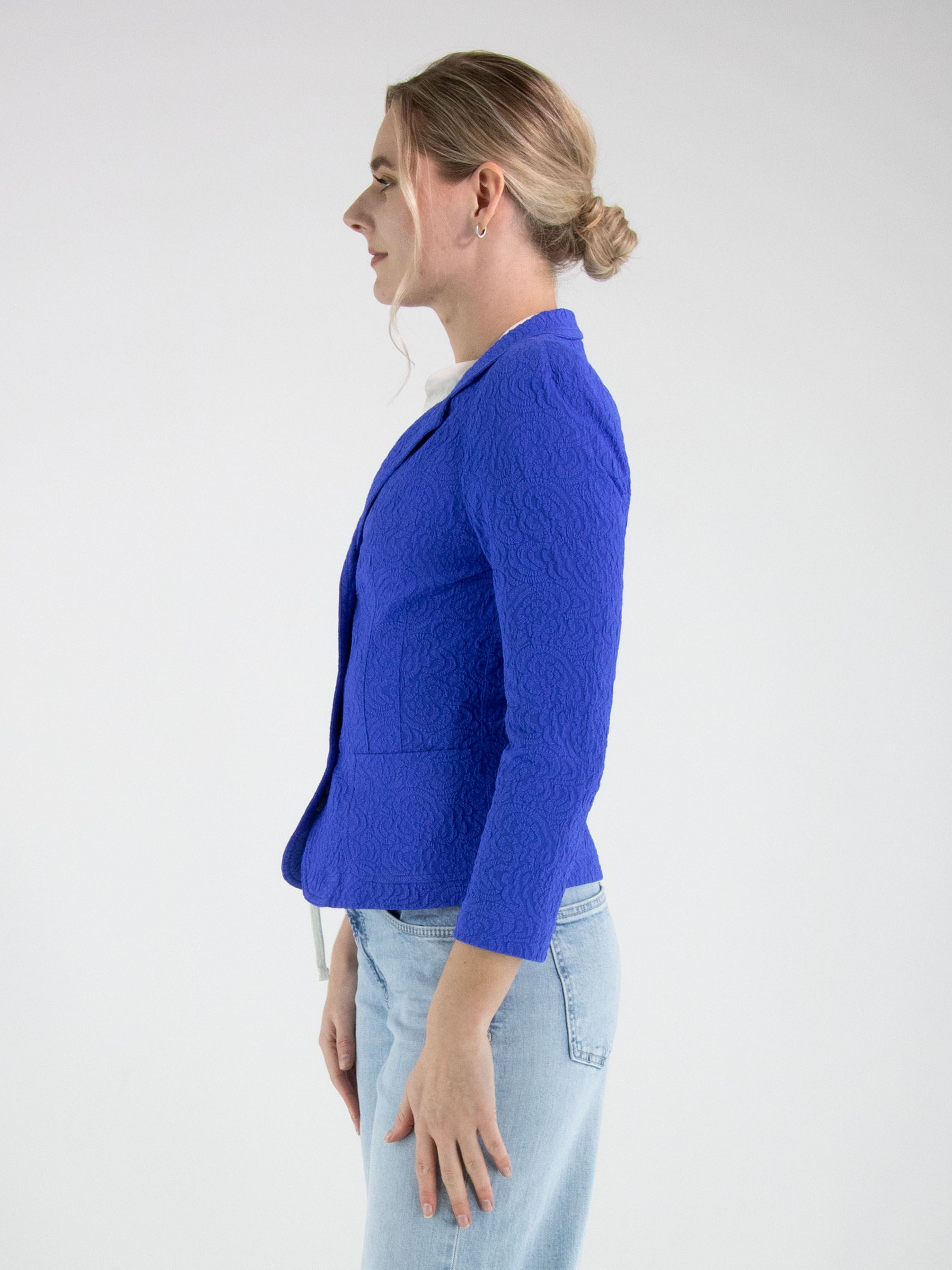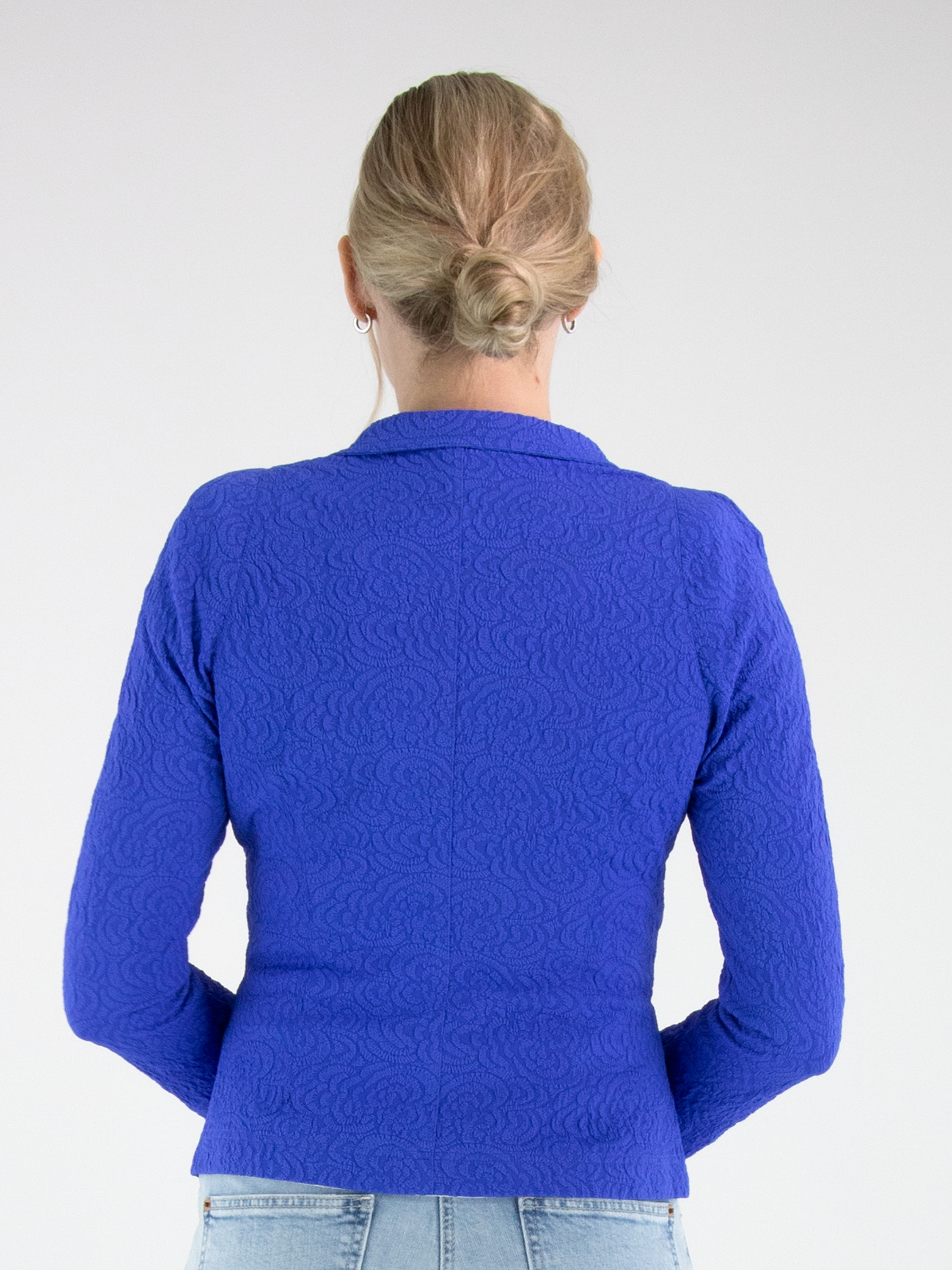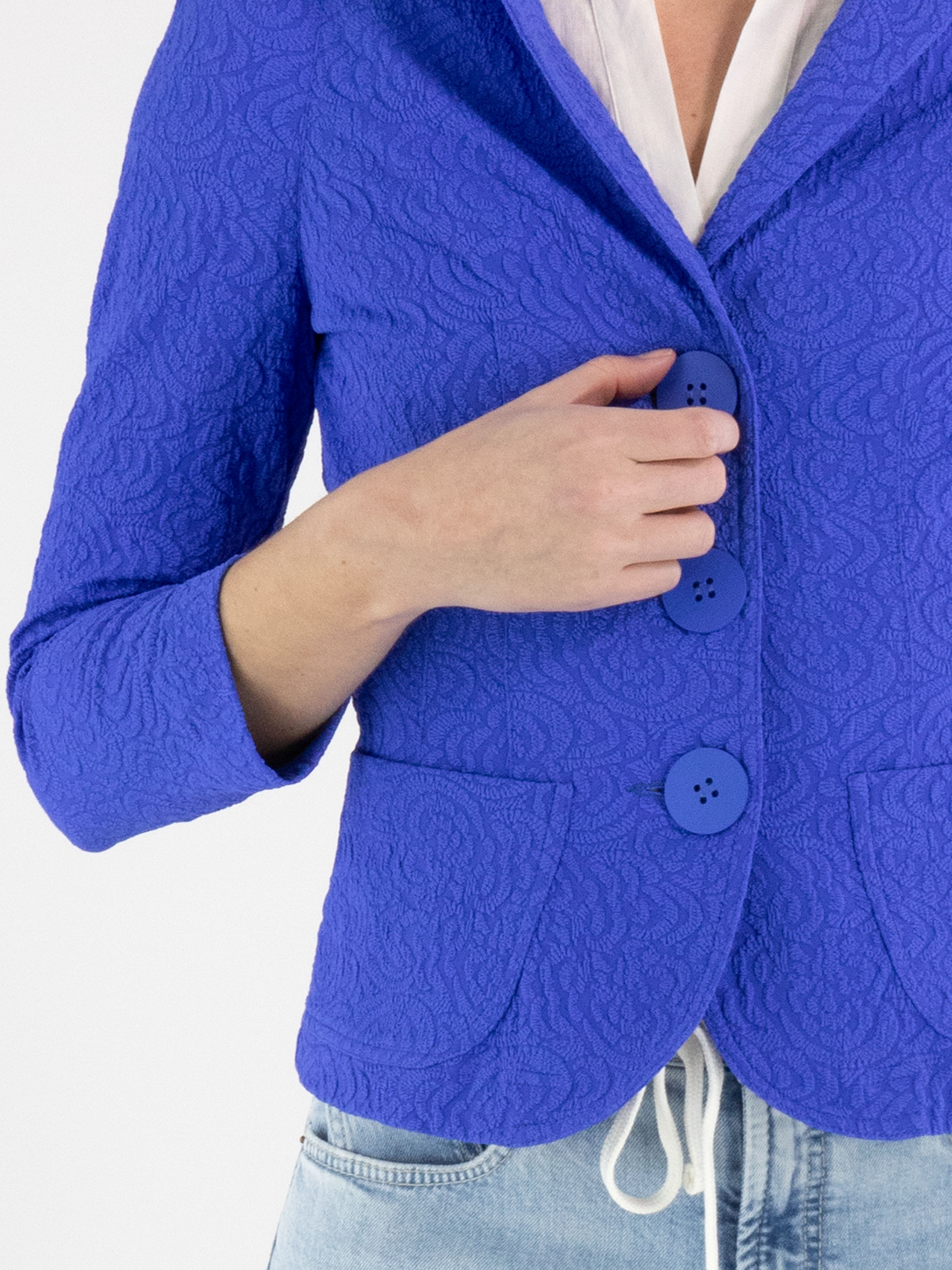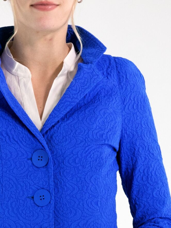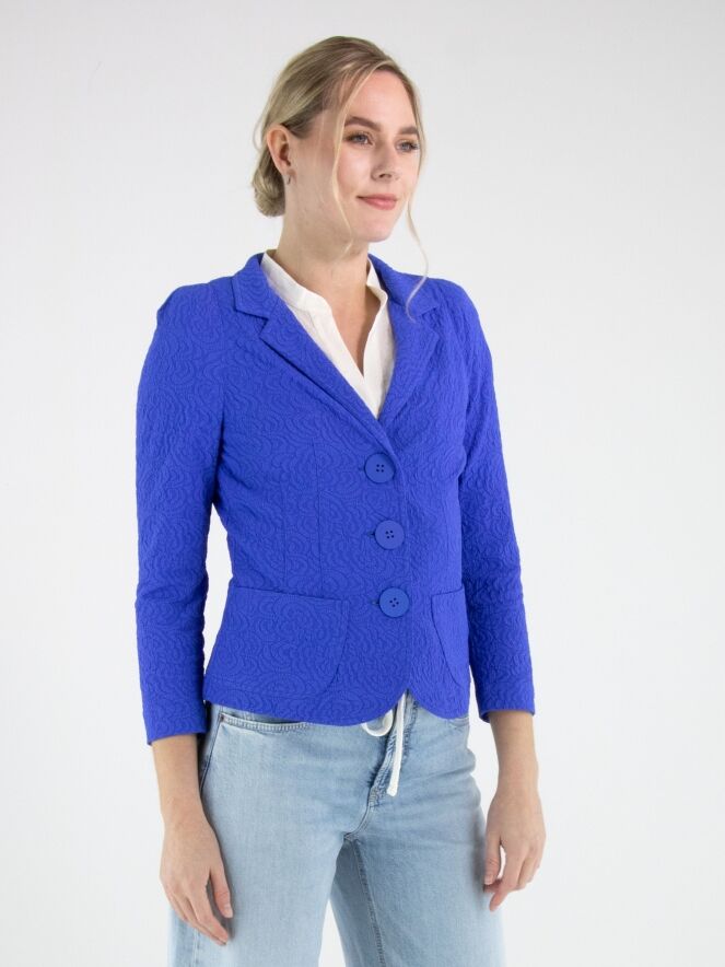 Blazer by ML Collections in a striking cobalt blue shade. The fabric features a tone-on-tone relief jacquard print, adding subtle depth and a refined sense of luxury. Fastened with three buttons and unlined, it offers a lightweight and fluid drape. This blazer should not be washed.