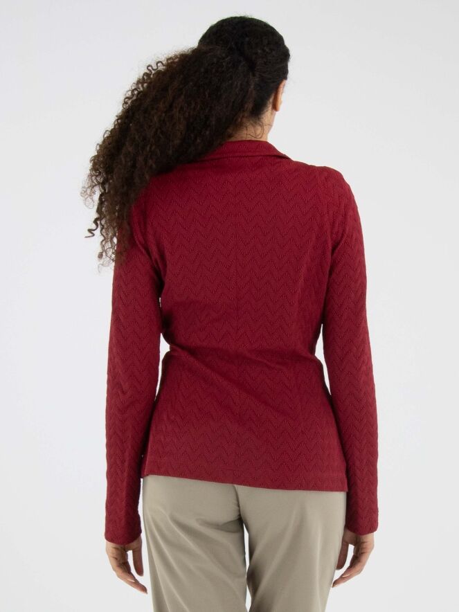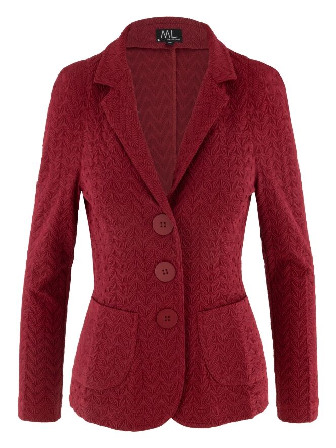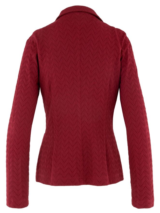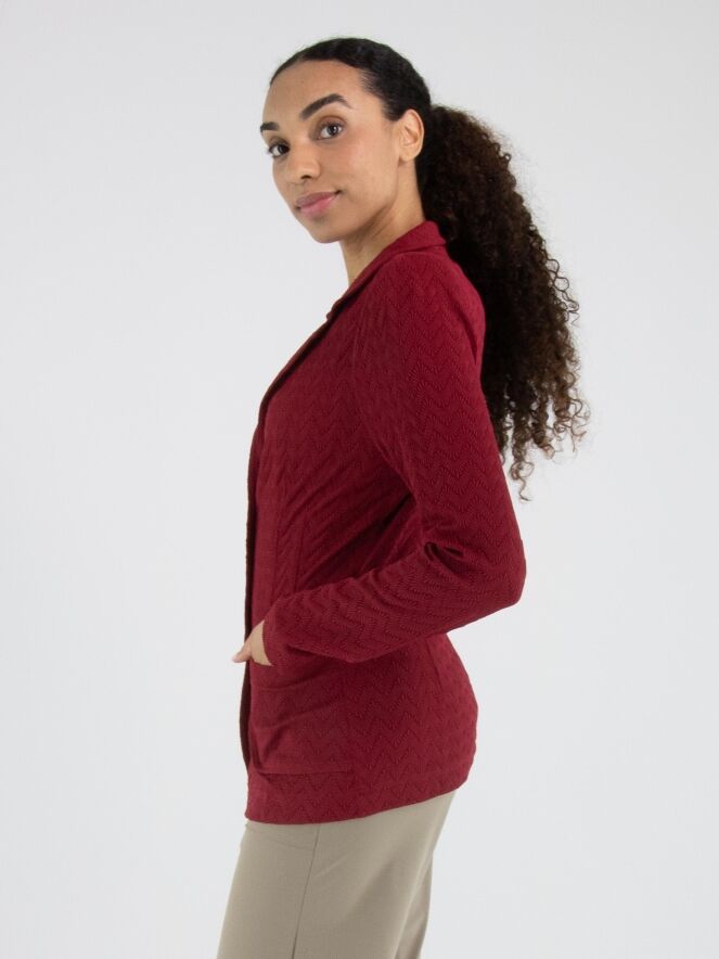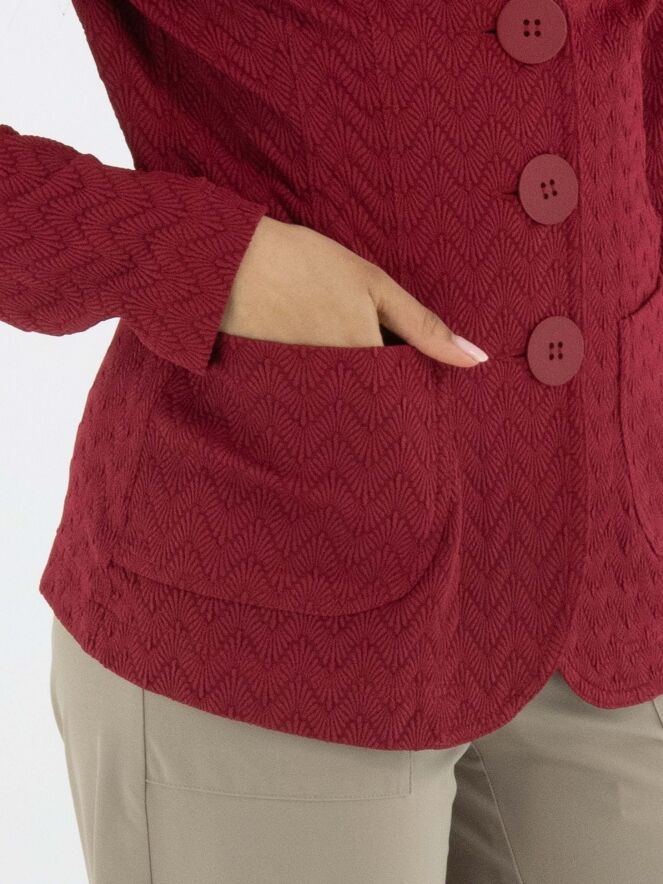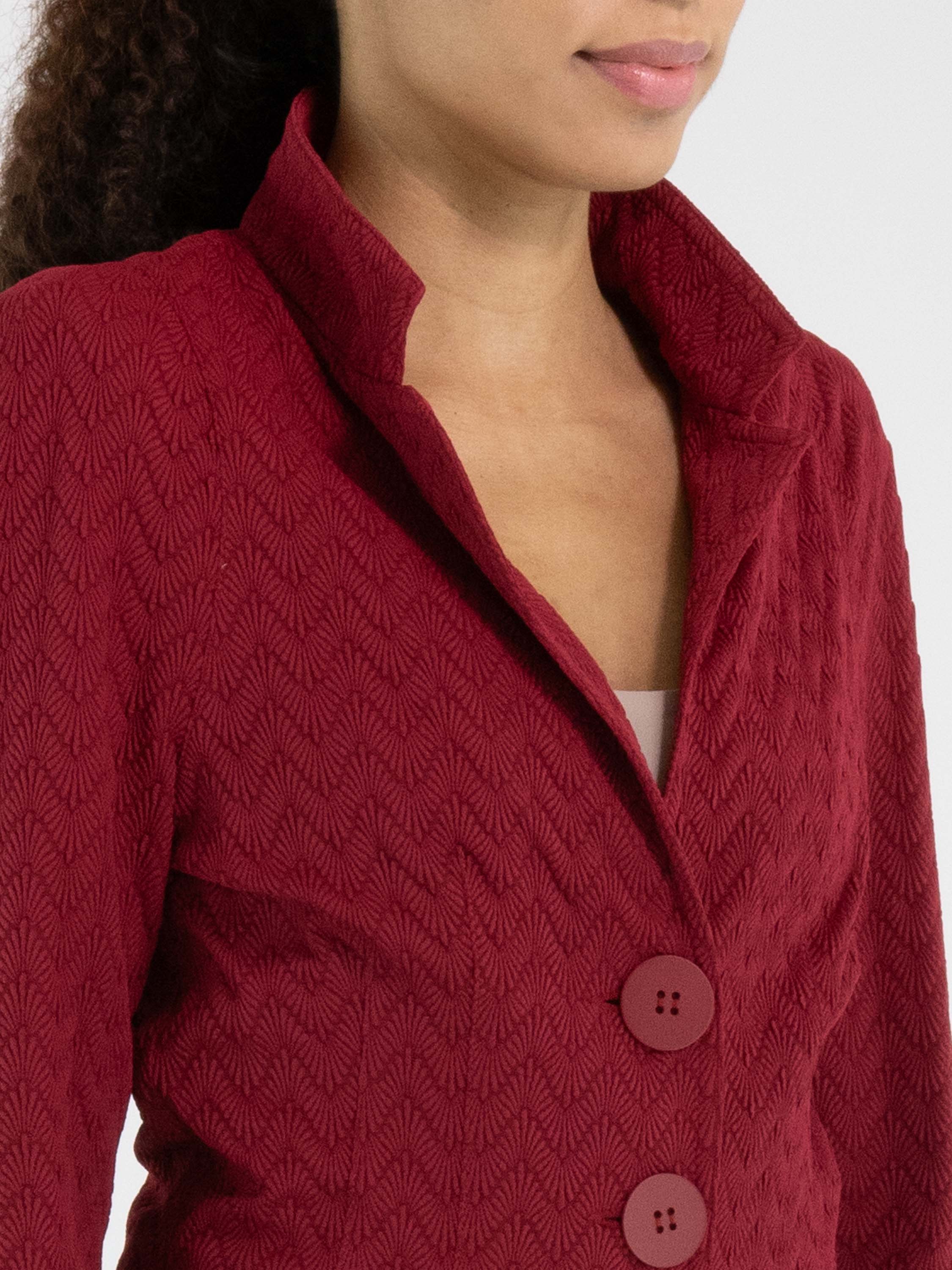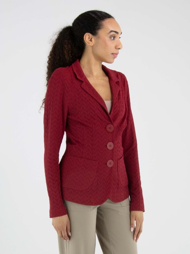 Blazer by ML Collections in a vibrant raspberry red shade. The fabric features a subtle zigzag relief texture, adding depth and character to the design. Fastened with three buttons and unlined, it offers a lightweight and fluid drape. This blazer should not be washed.
