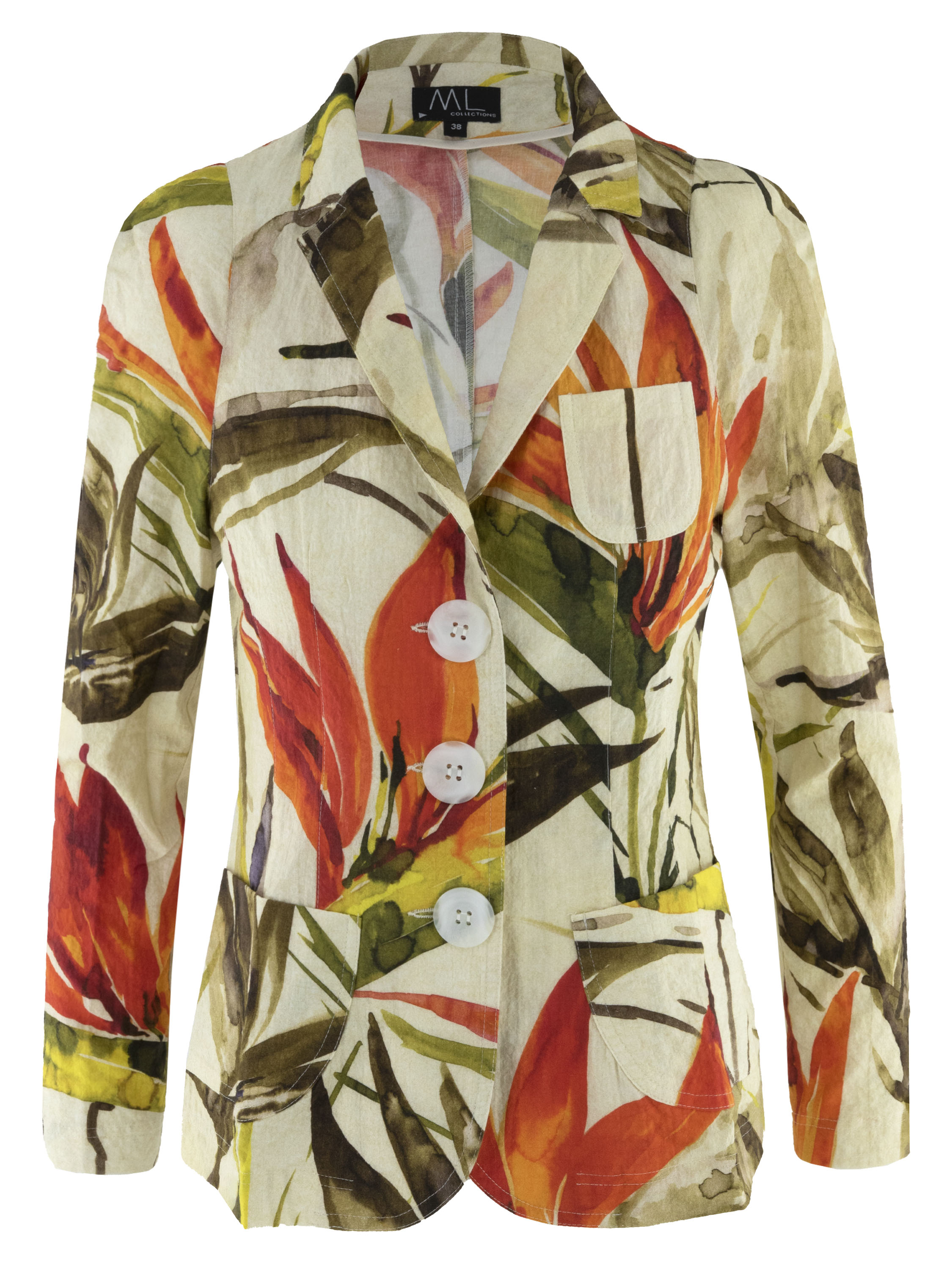 A blazer by ML Collections featuring a floral and leaf print in red, orange and various shades of green on a beige background. The blazer has a three-button closure and is unlined. This blazer must not be washed.