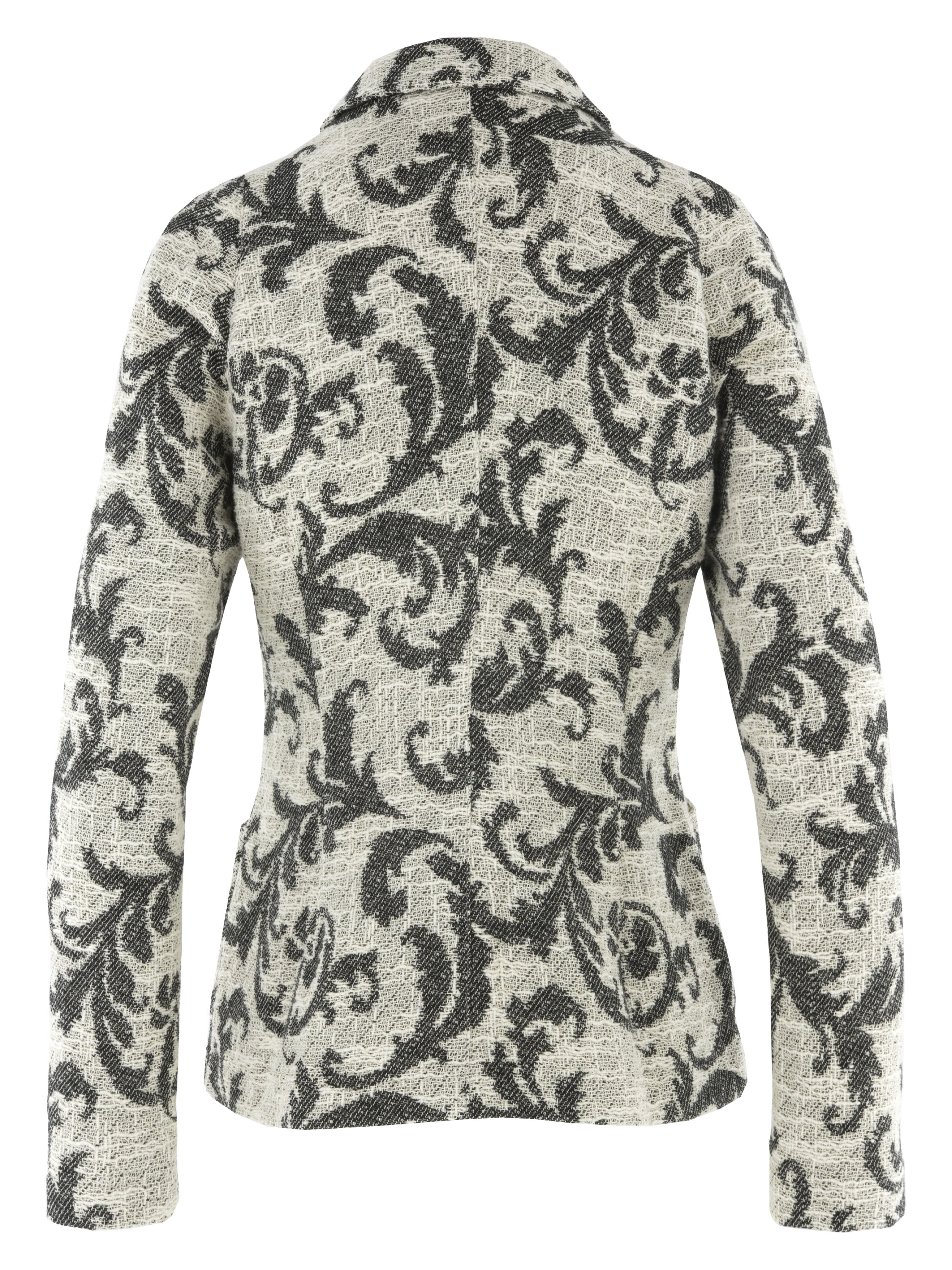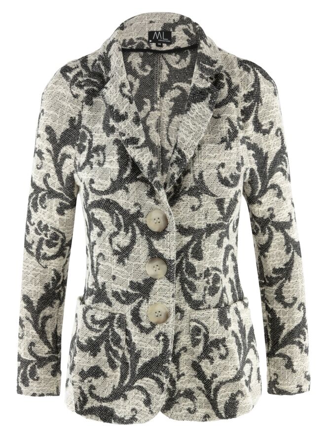 A blazer by ML Collections featuring a jacquard pattern in black and beige. The blazer has a three-button closure and is unlined. This blazer must not be washed.