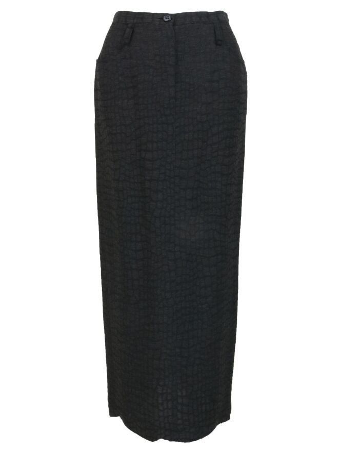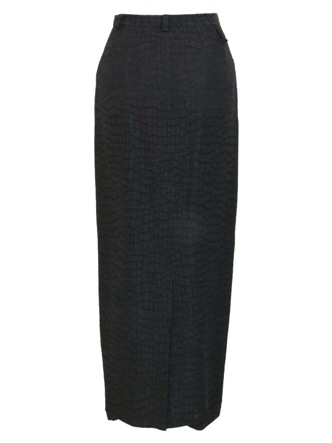 A long skirt from ML Collections in a reptile print with the colors black and anthracite. The skirt has side pockets and at the back is a deep split at the bottom. This skirt should not be washed.