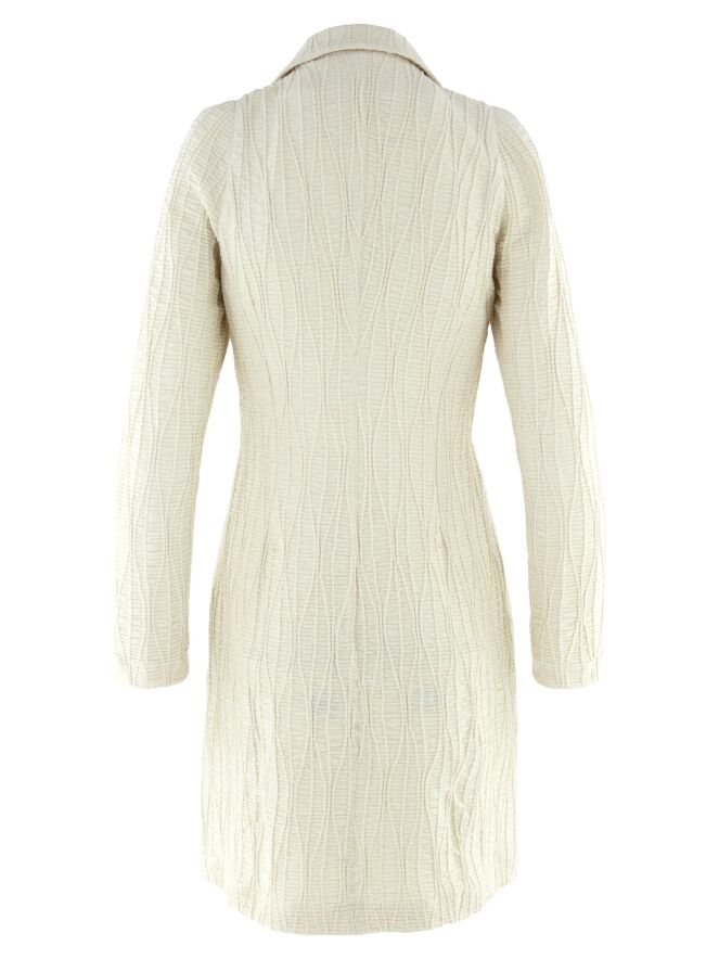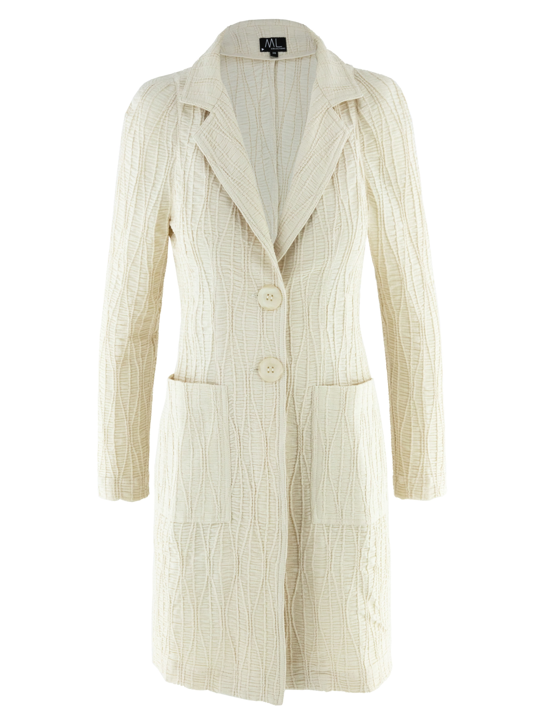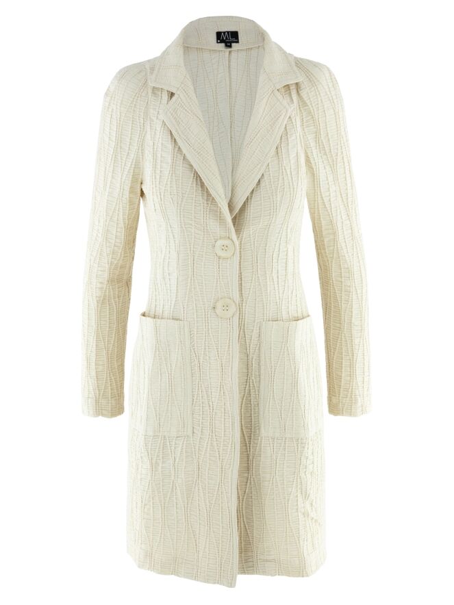A long blazer by ML Collections in beige. The fabric is horizontally smocked with flowing vertical lines layered over it. The blazer features a two-button closure and is unlined. This blazer must not be washed.