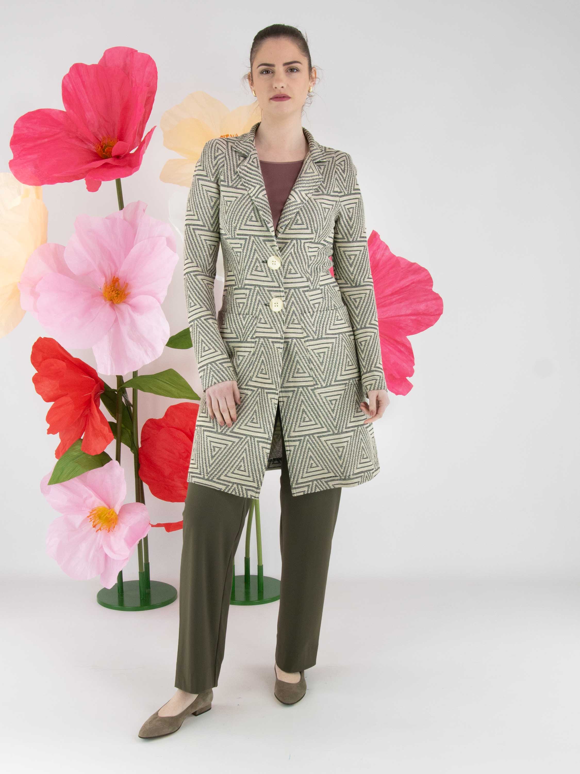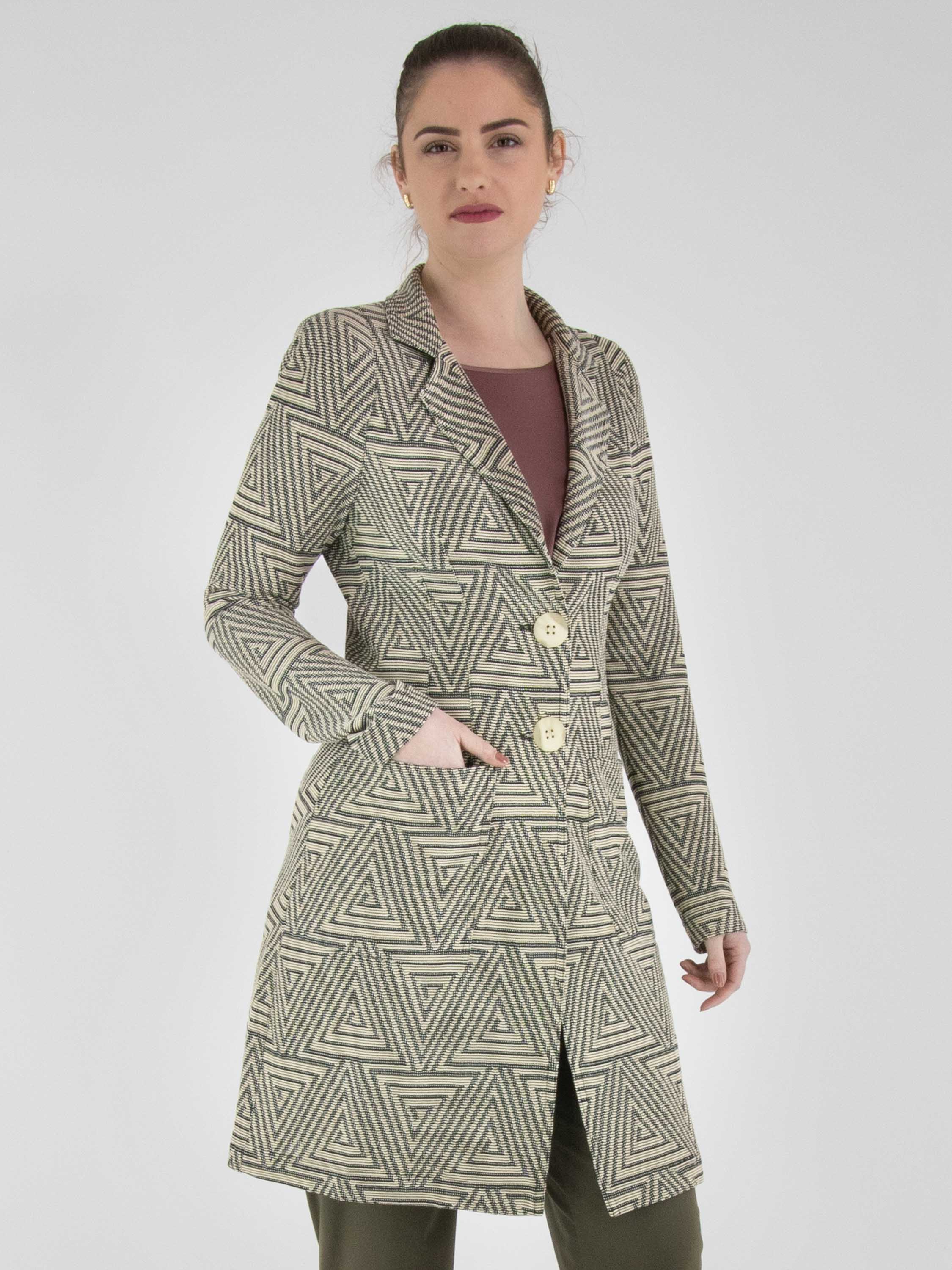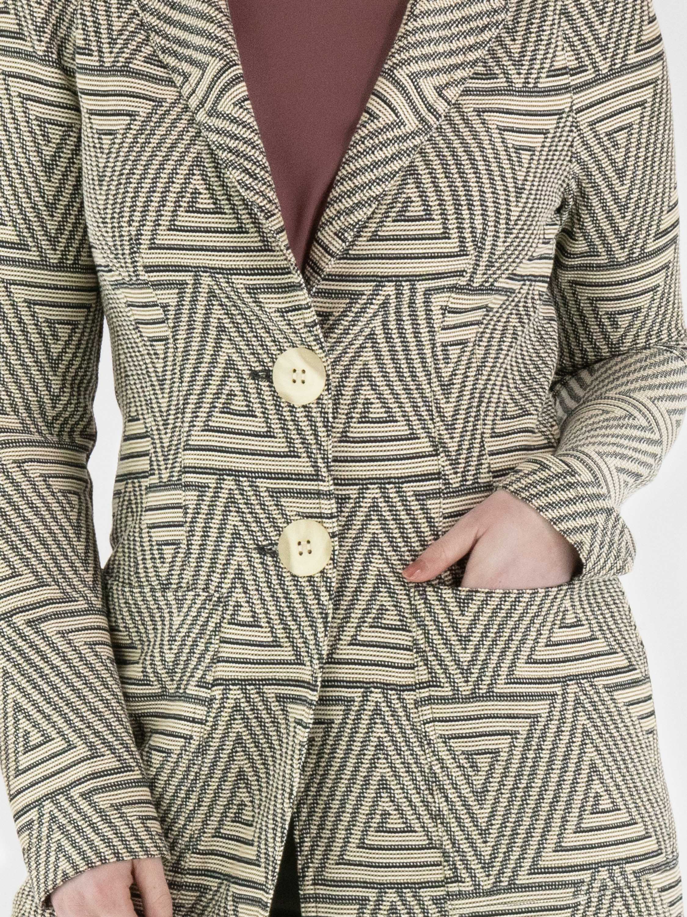A long blazer by ML Collections featuring a mosaic print in black and beige. The blazer has a two-button closure and is unlined. This blazer must not be washed.