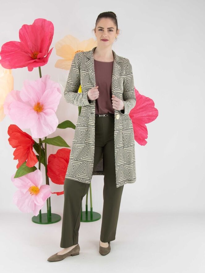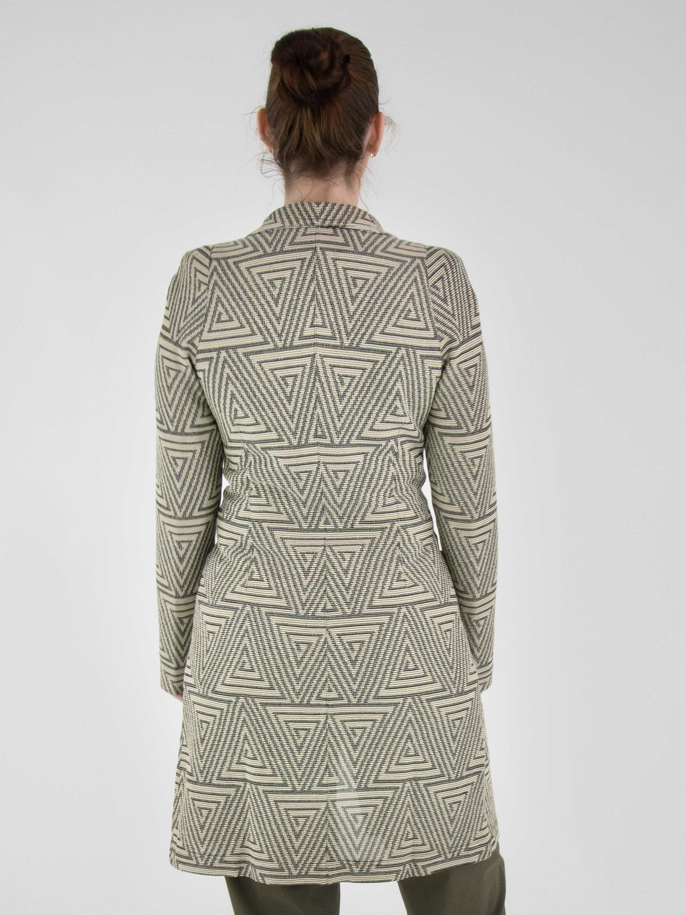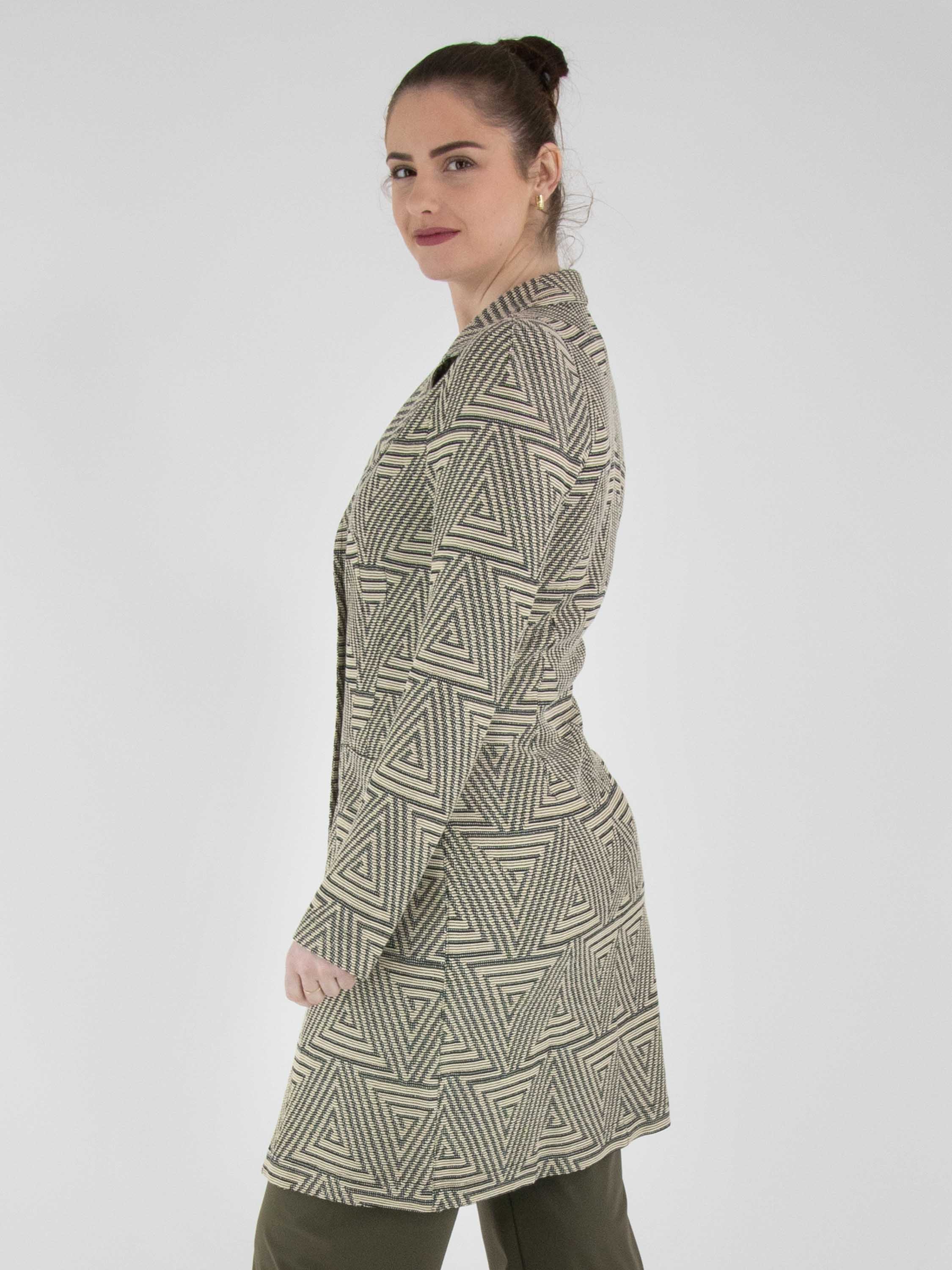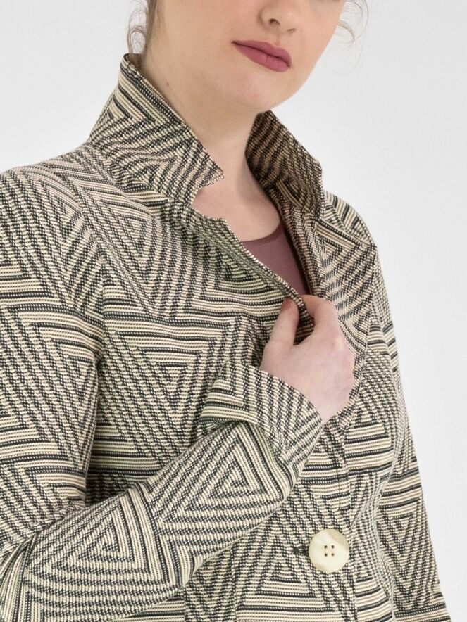 A long blazer by ML Collections featuring a mosaic print in black and beige. The blazer has a two-button closure and is unlined. This blazer must not be washed.