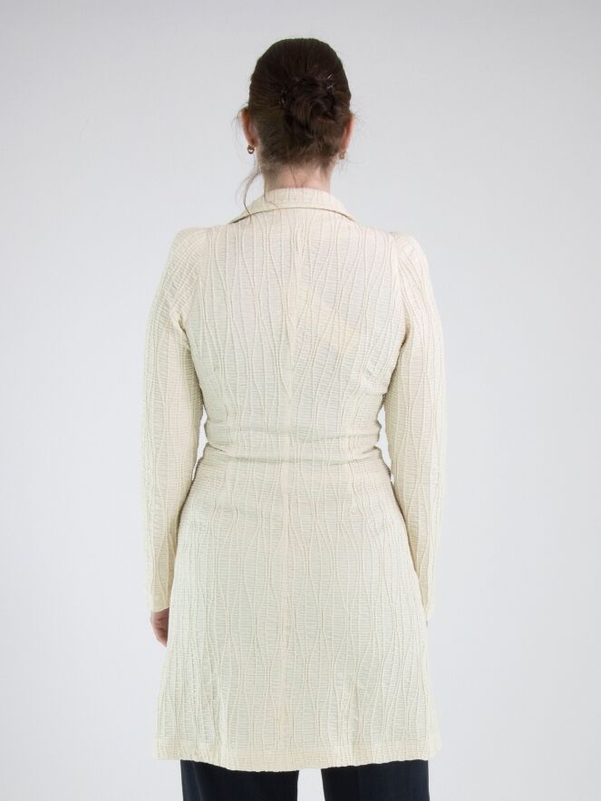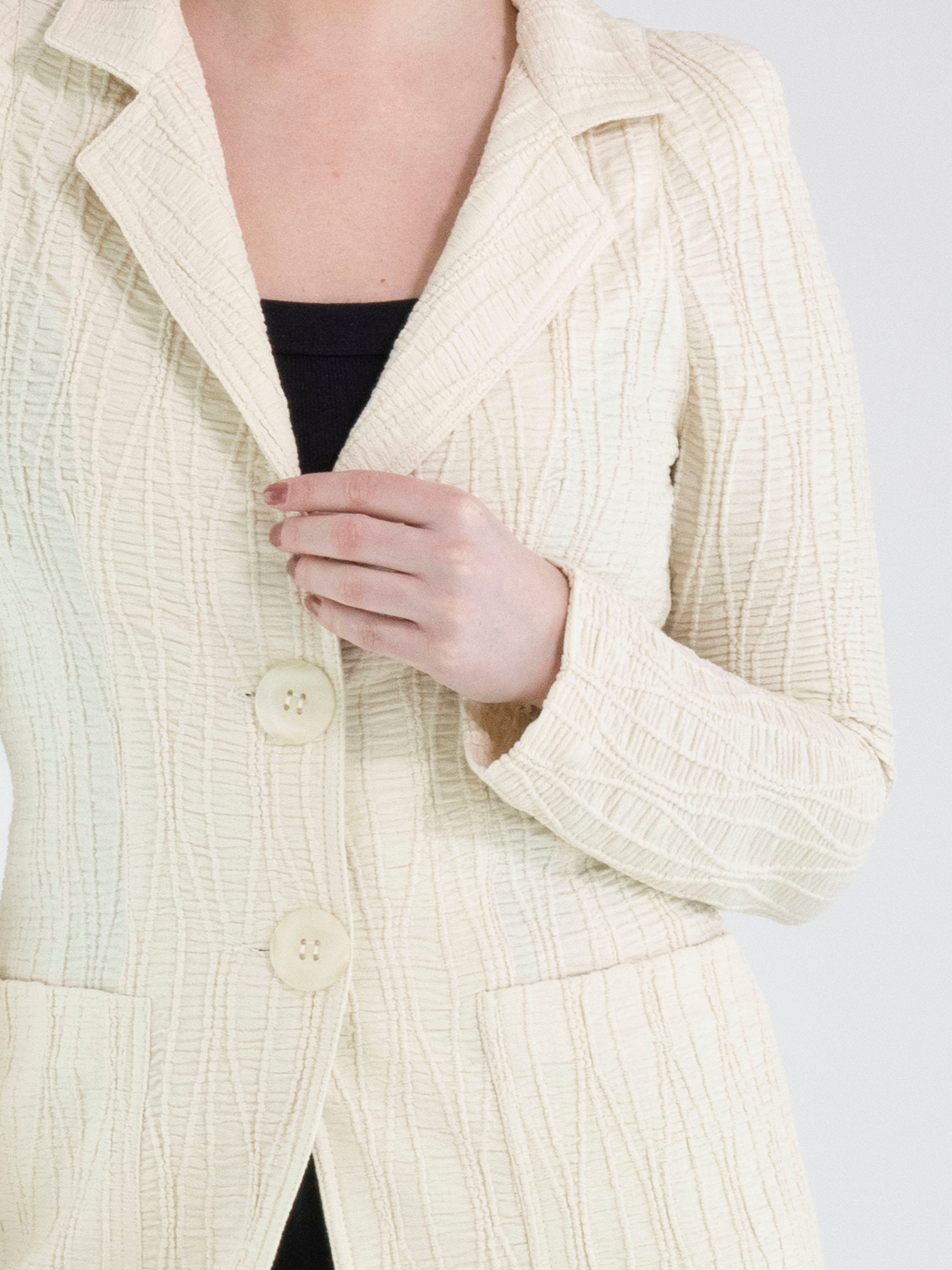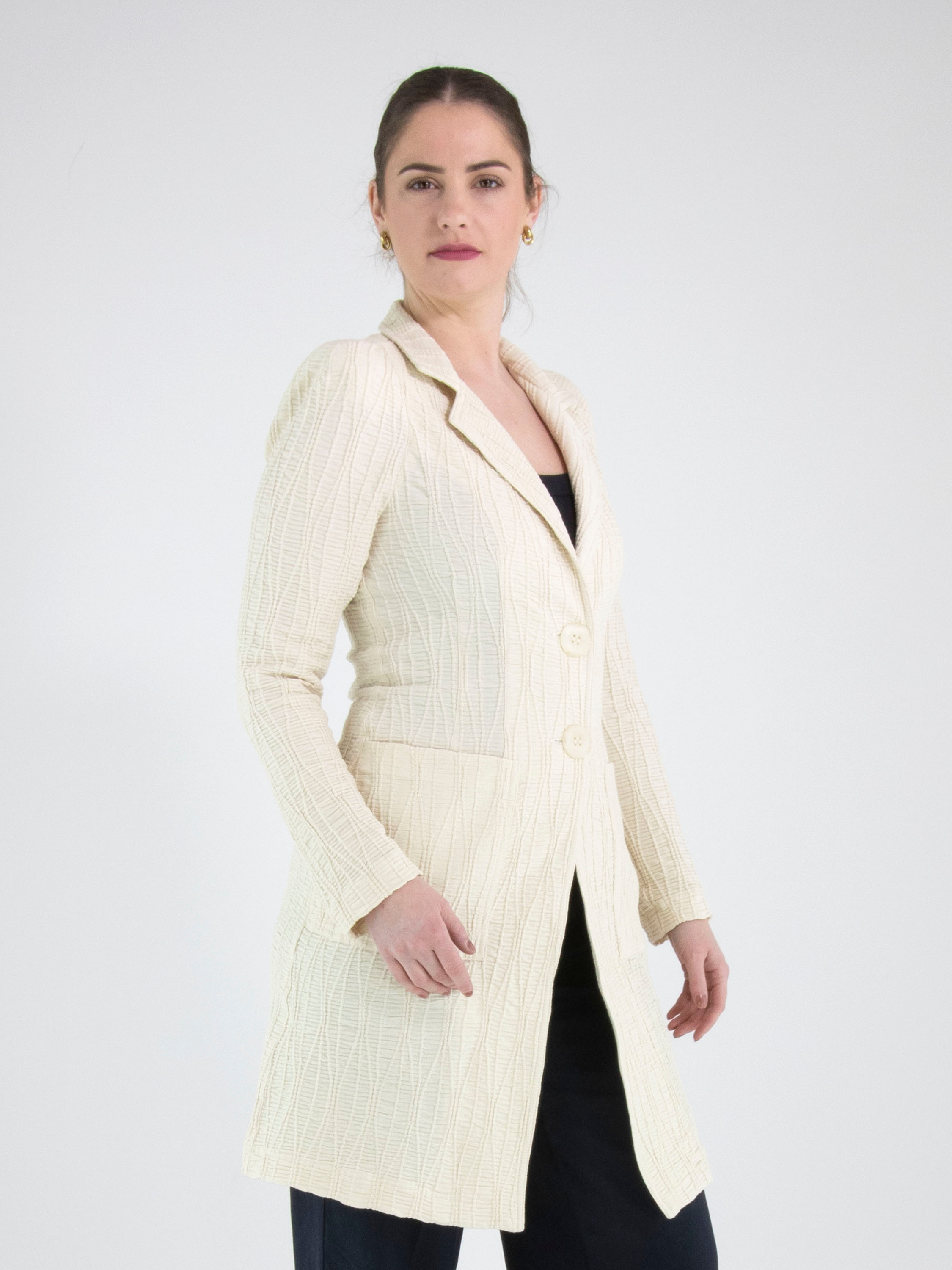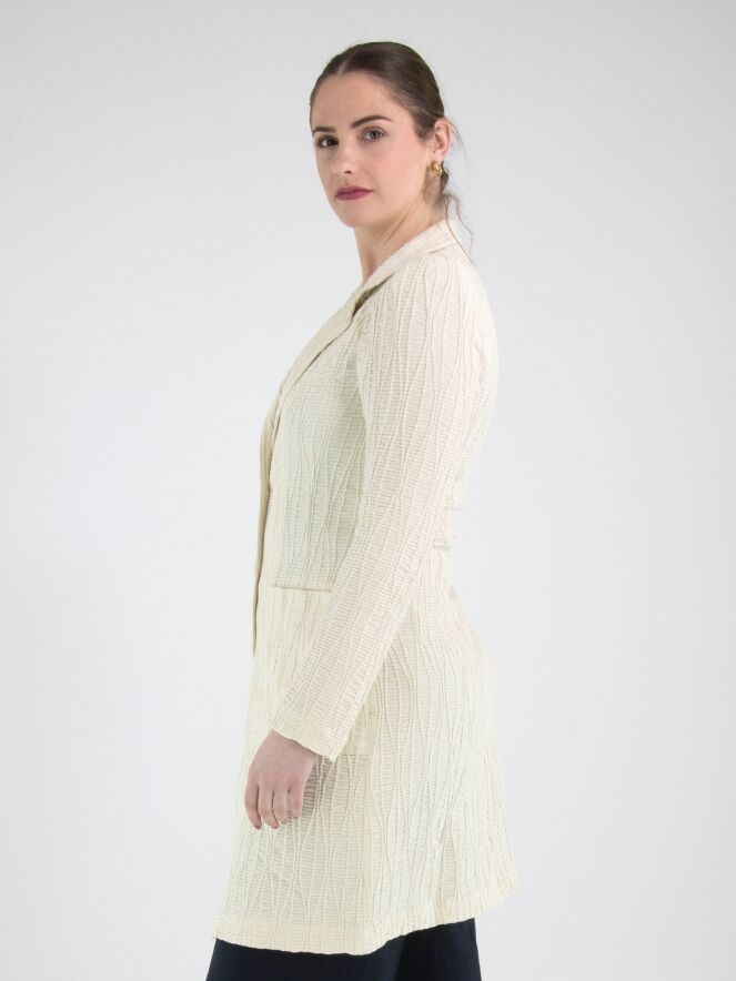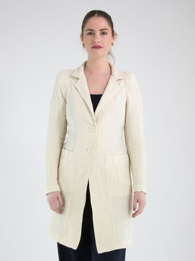 A long blazer by ML Collections in beige. The fabric is horizontally smocked with flowing vertical lines layered over it. The blazer features a two-button closure and is unlined. This blazer must not be washed.