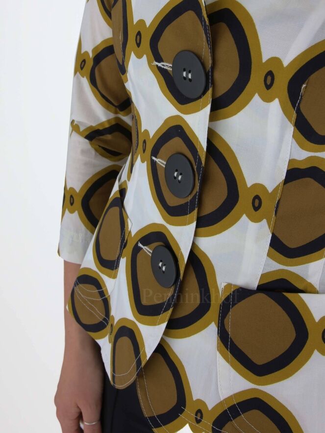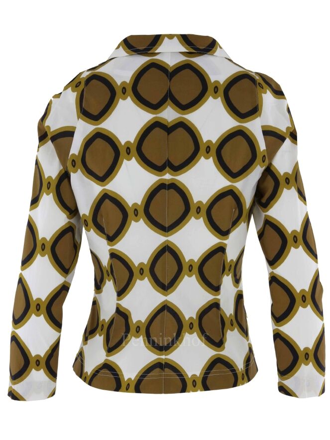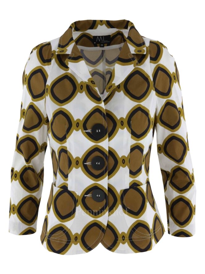 A blazer from ML Collections in a switch print with the colors olive green, black and camel on a white background. The blazer has a 3 button closure and is unlined. This blazer must not be washed.