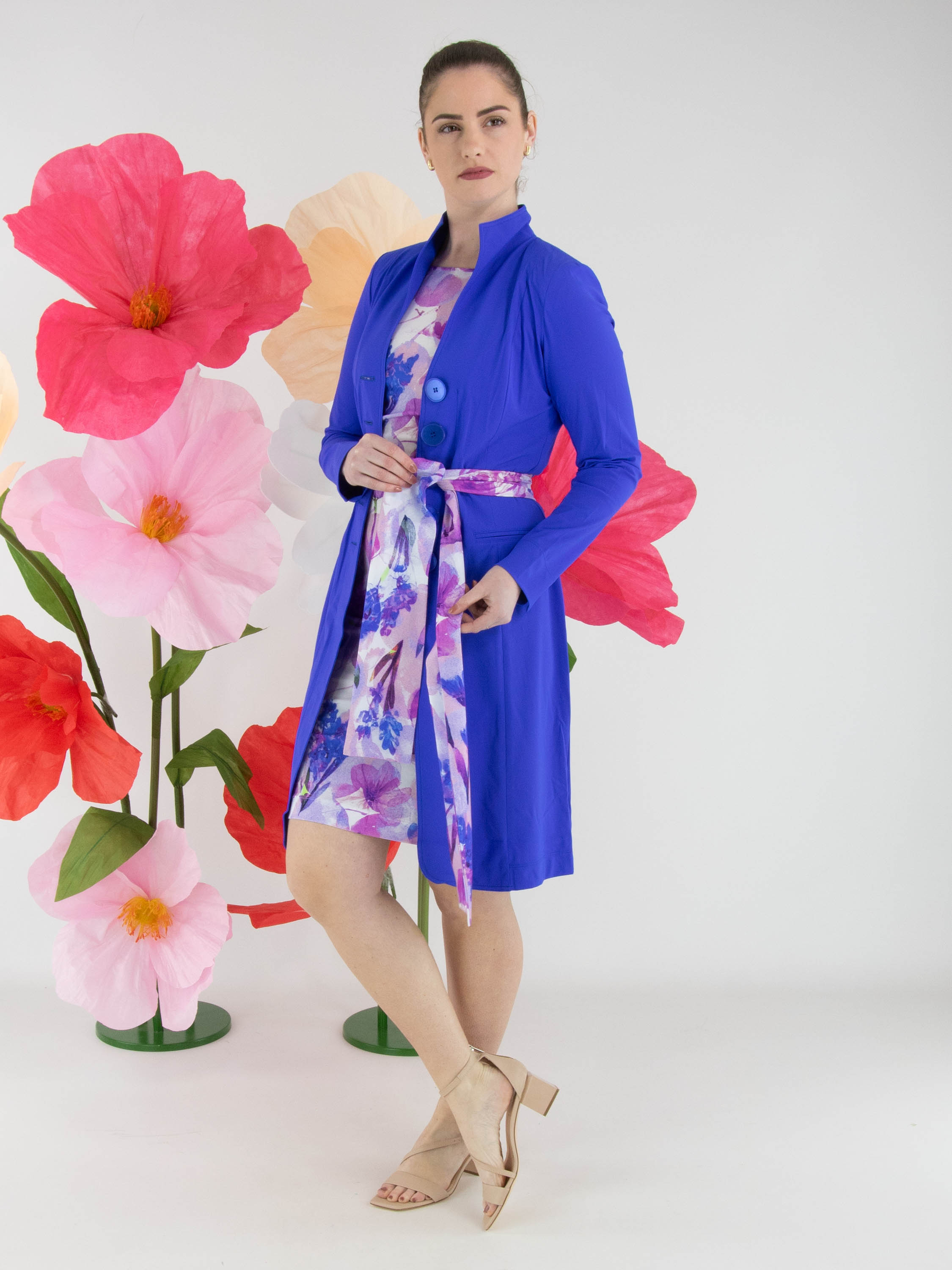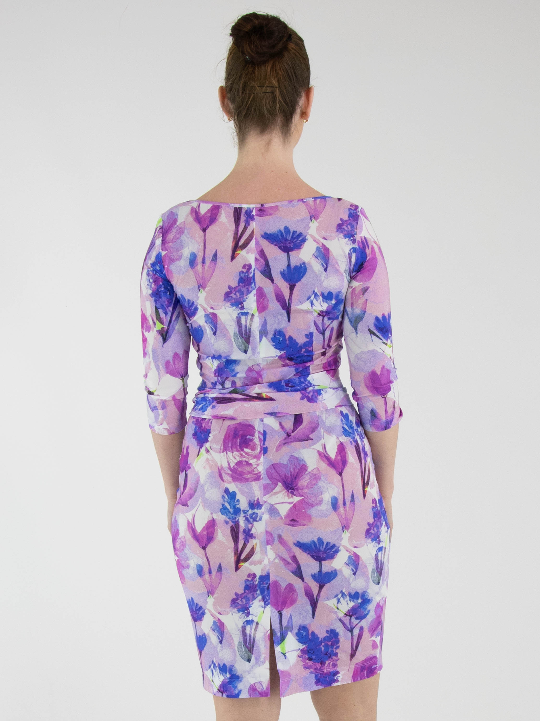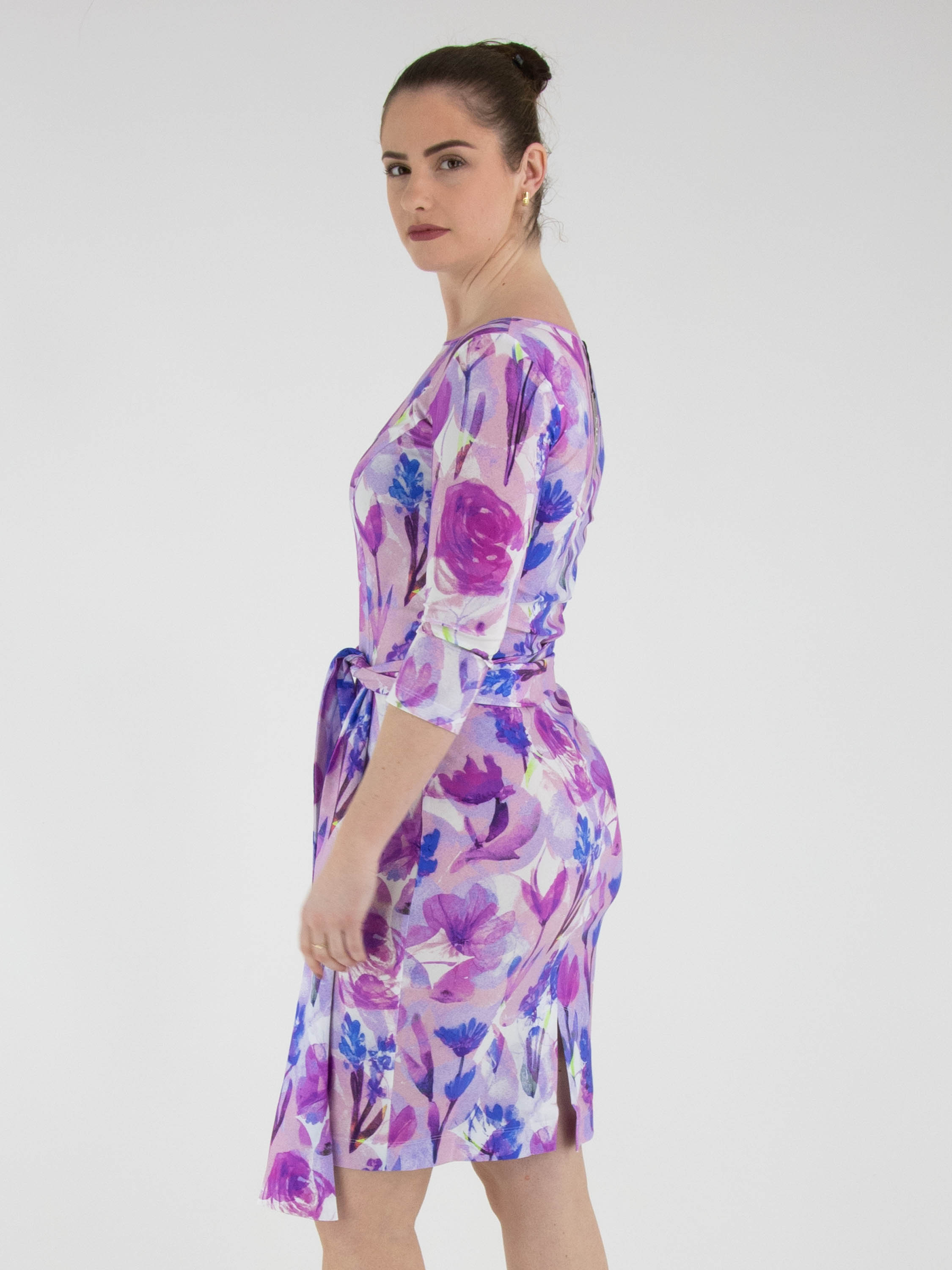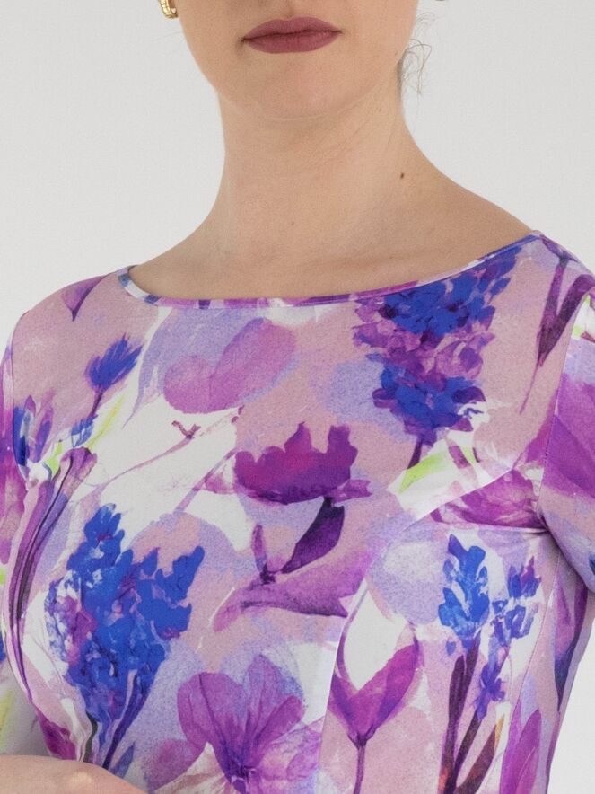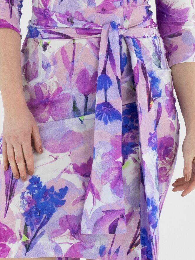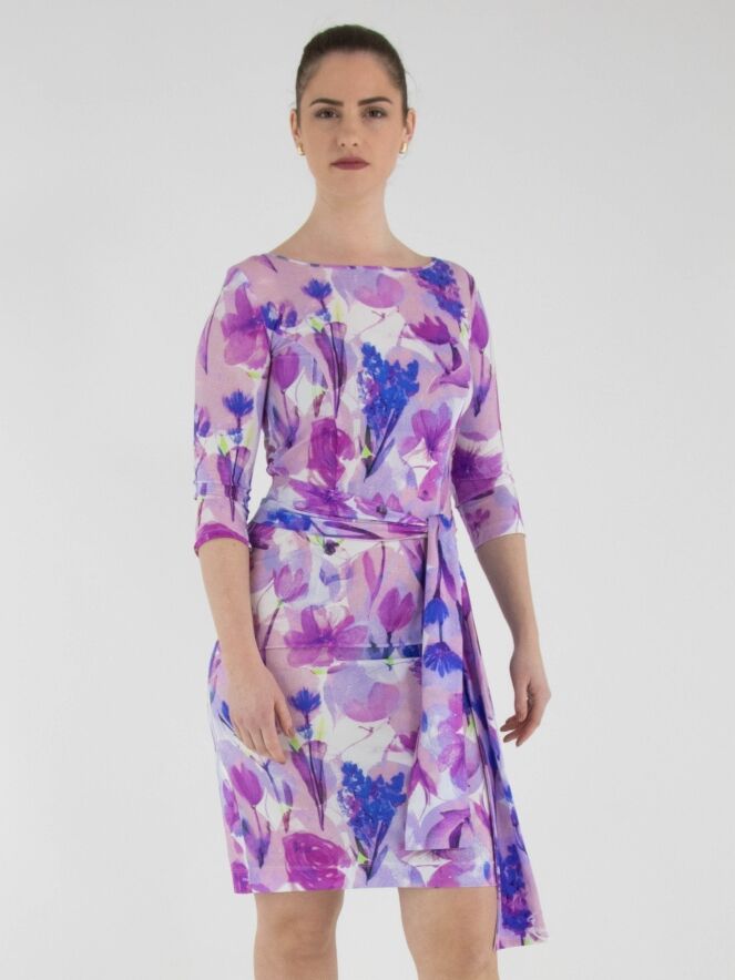 A dress by Moq featuring a graphic floral print in various shades of lilac, pink, blue and white. The dress has a wide round neckline and a waist belt made from the same fabric as the dress. It is unlined and designed with half-length sleeves. This dress can be washed at 40 degrees.