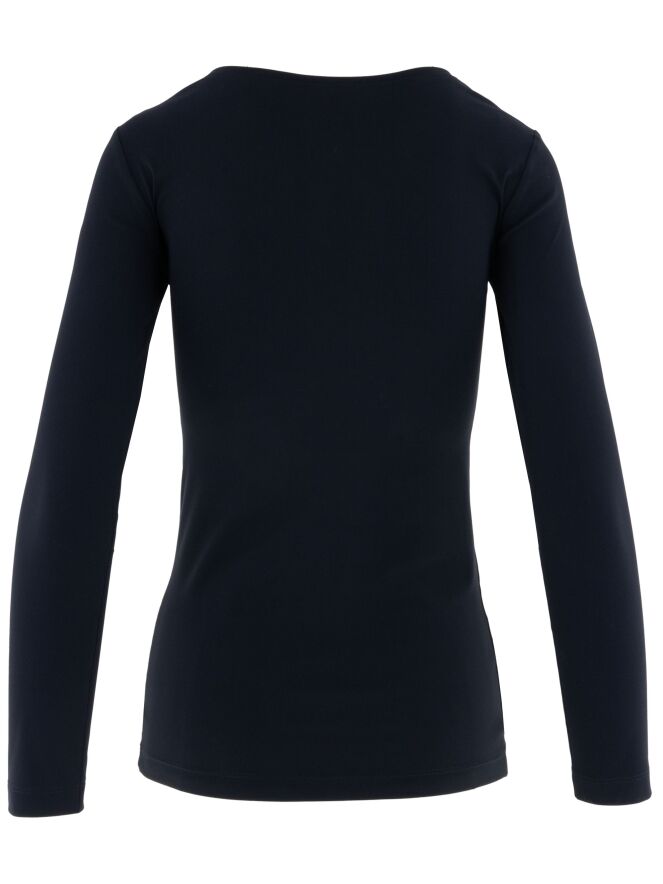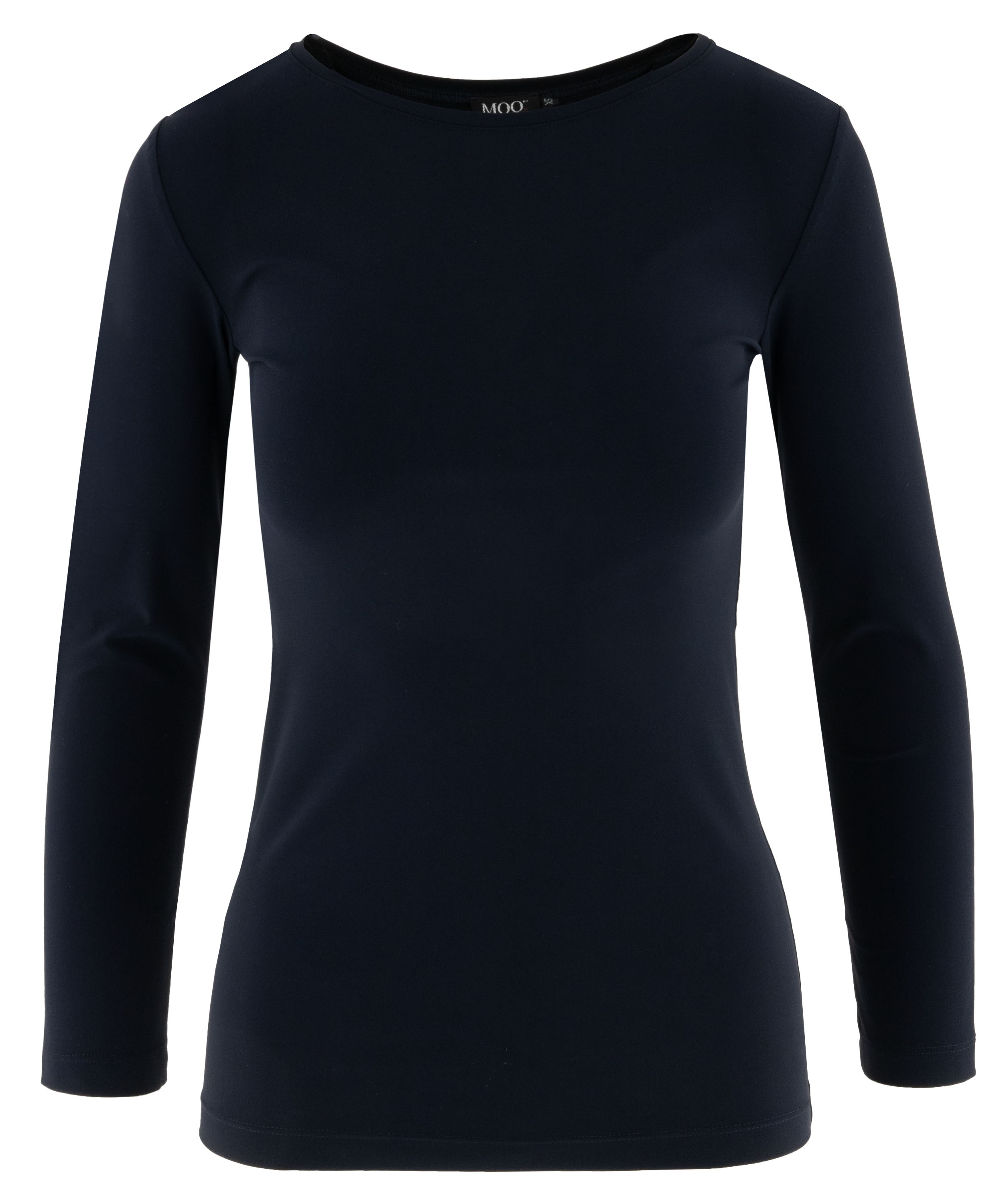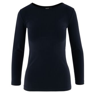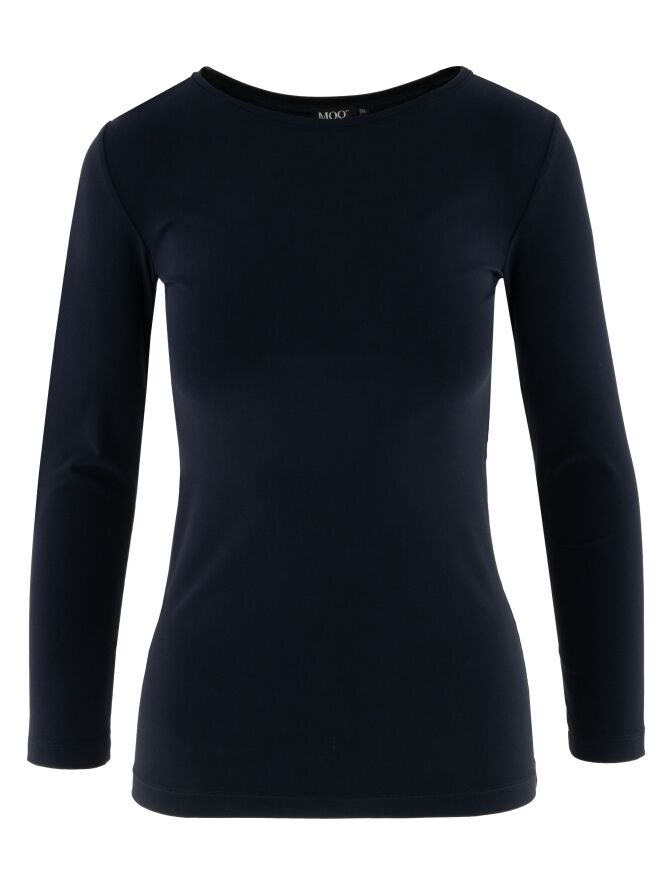 Shirt by Moq in navy blue. Designed with a round neckline and long sleeves, it features a lightly tailored cut that creates a feminine and comfortable fit. This shirt can be washed at 40 degrees.