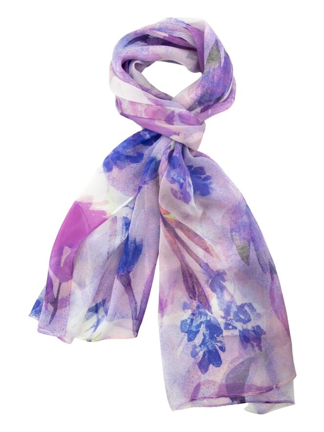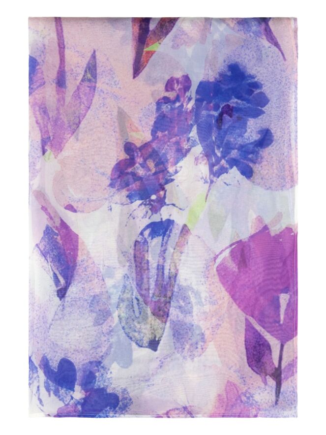 Lightweight semi-sheer shawl by Moq featuring a graphic floral print in multiple shades of lilac, pink, blue and white. The airy fabric gives the shawl an elegant and refined appearance. This shawl should be hand-washed.