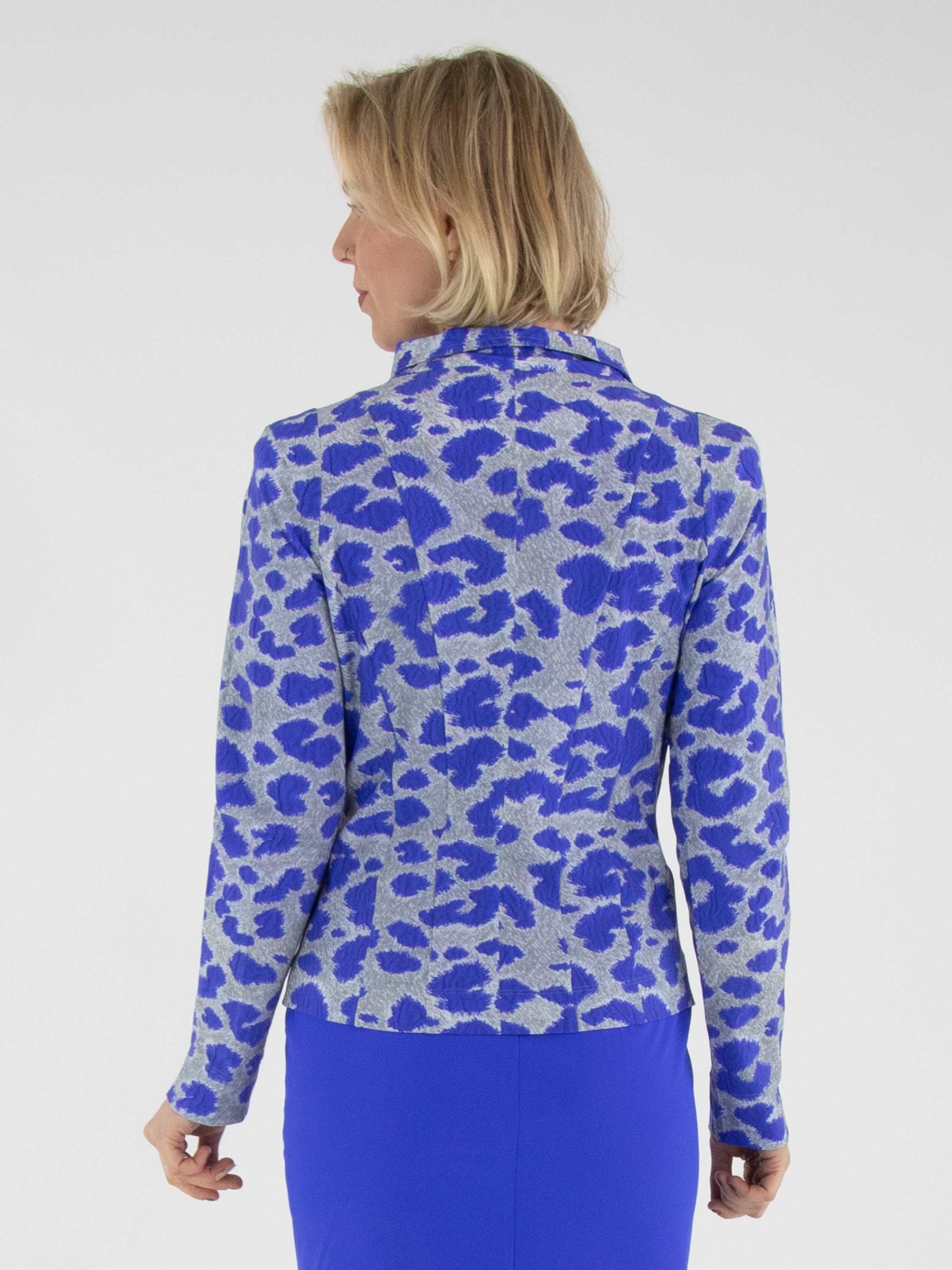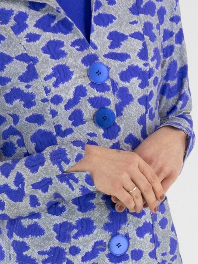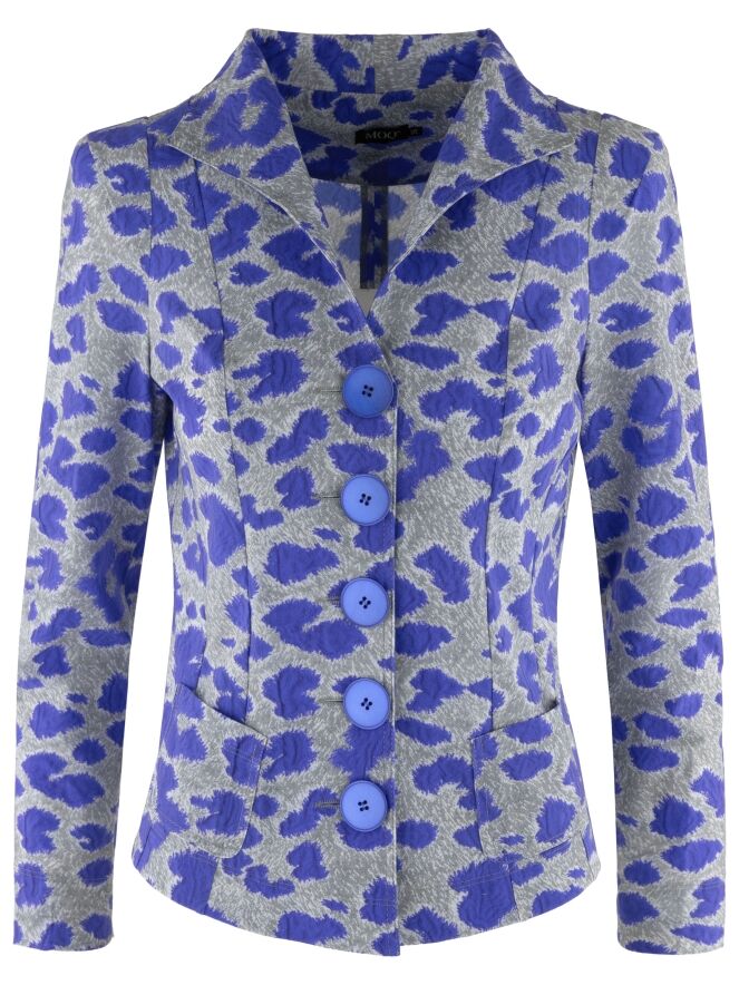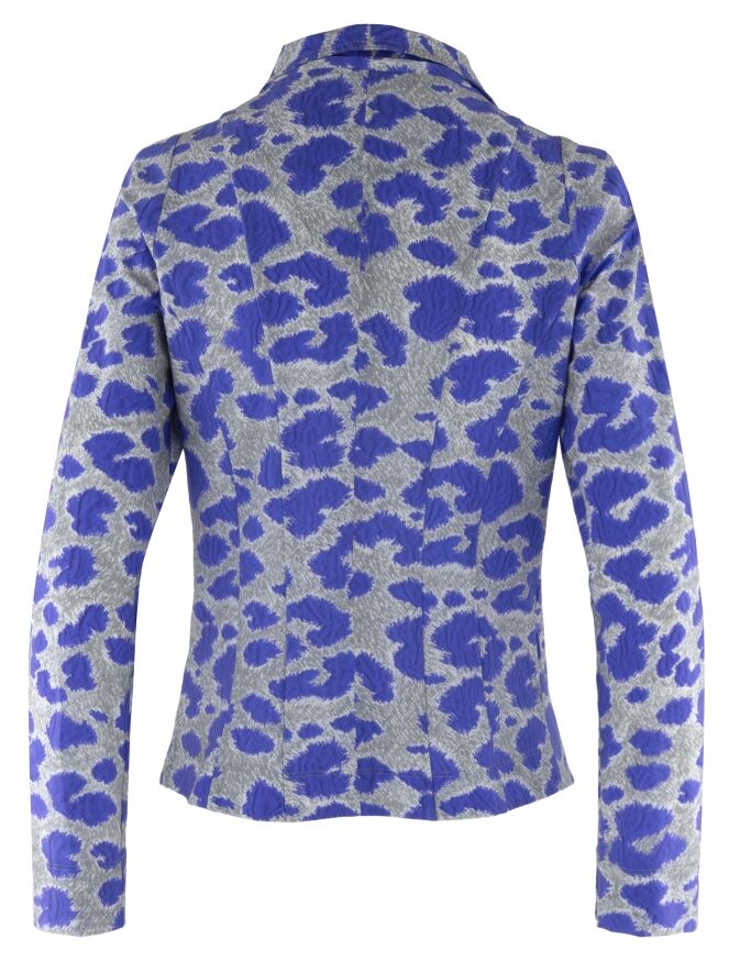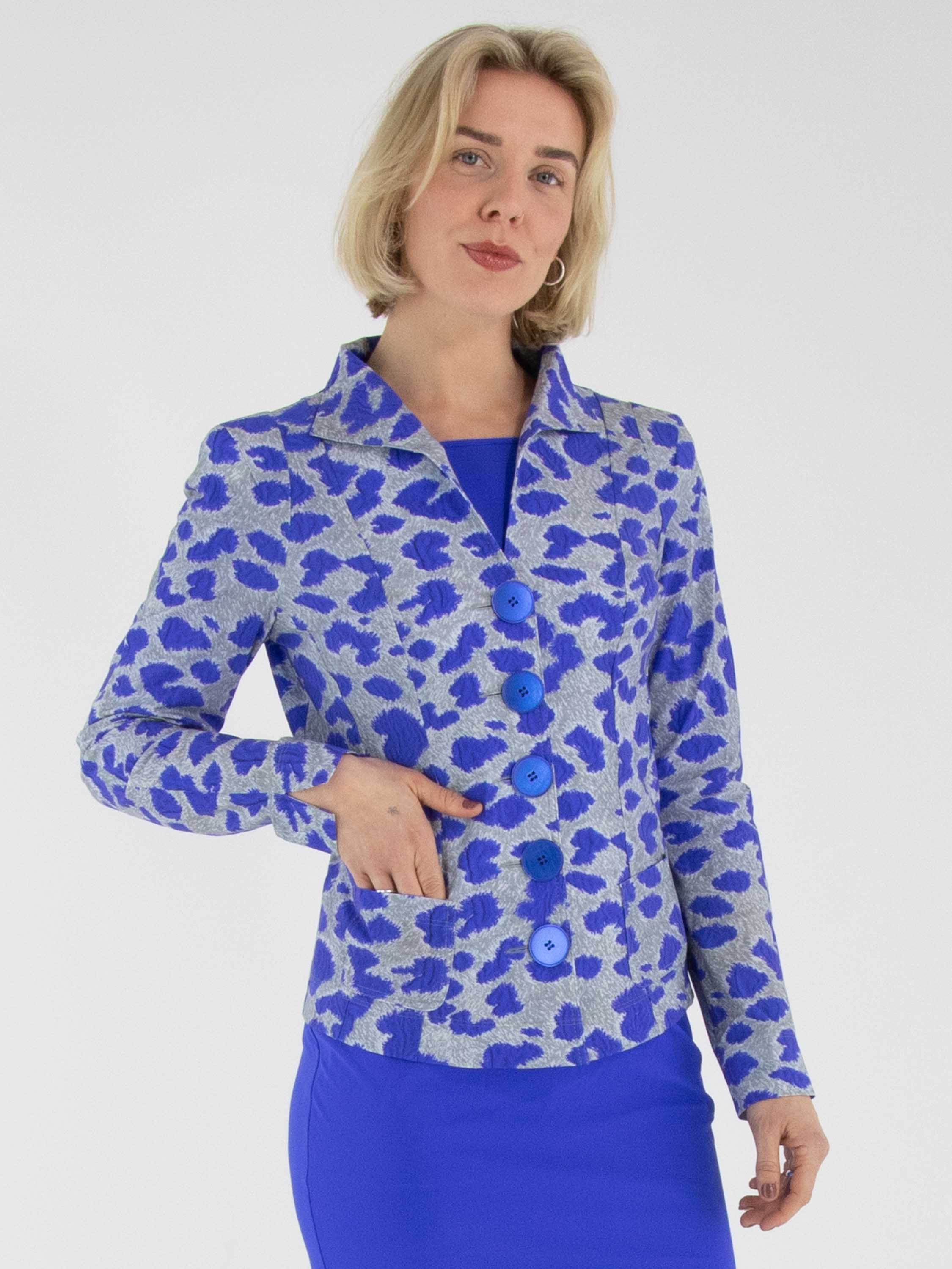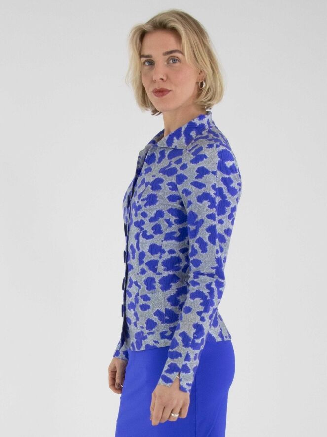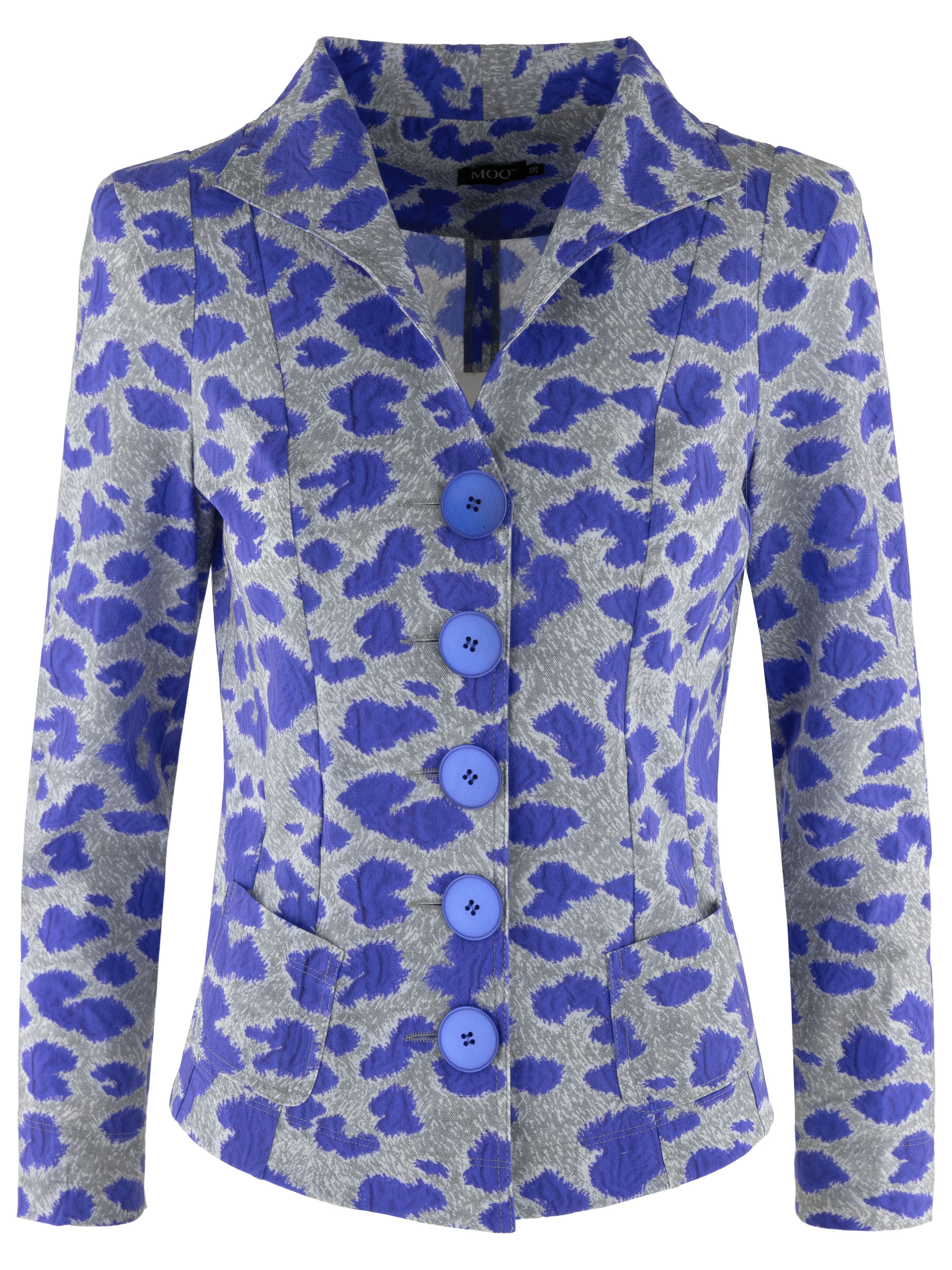 A blazer by Mog featuring a graphic print in cobalt blue and grey. The blazer has a five-button closure with cobalt blue buttons and is unlined. This blazer can be washed at 40 degrees.