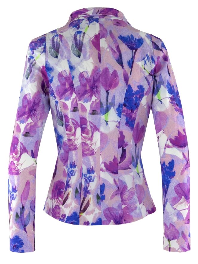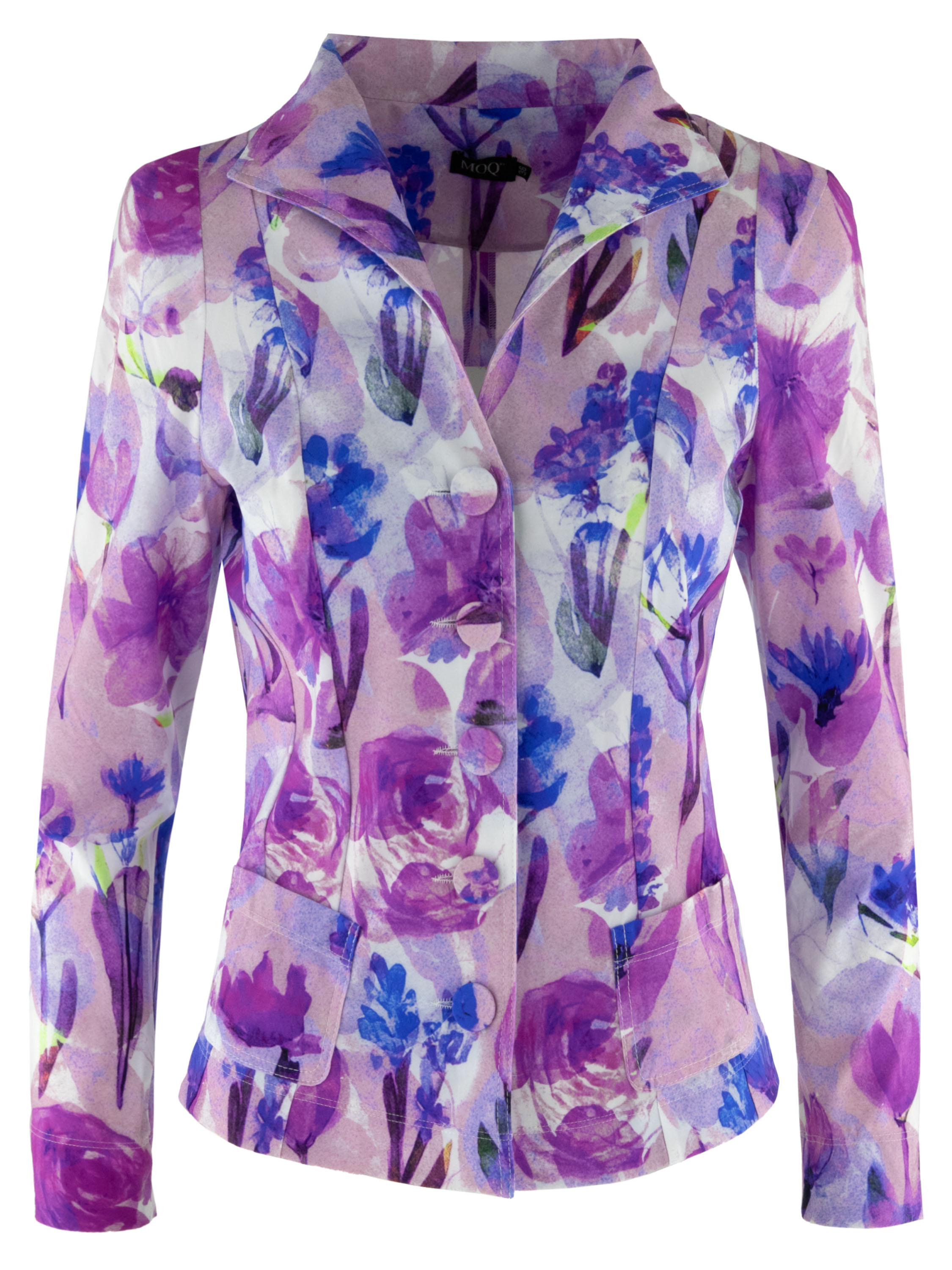 A blazer by Moq featuring a graphic floral print in various shades of lilac, pink, blue and white. The blazer has a five-button closure with buttons covered in the same fabric as the blazer. It is unlined and can be washed at 40 degrees.