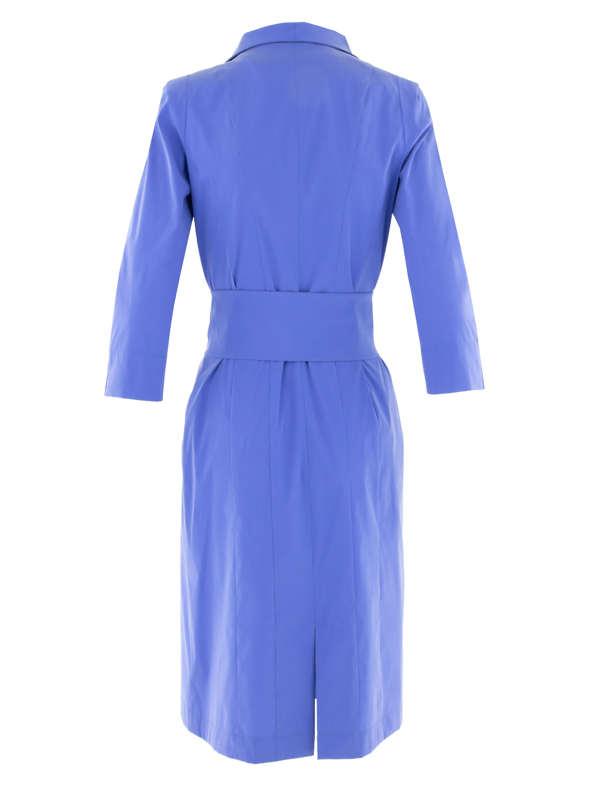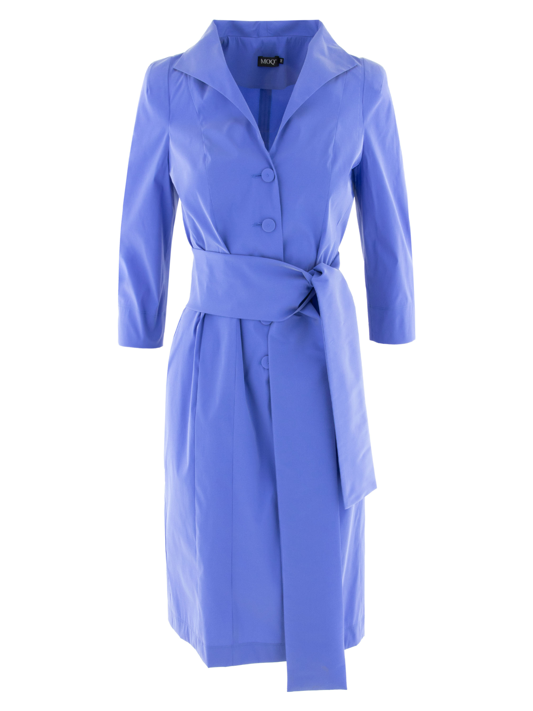 Button-through dress by Moq in a soft cobalt blue shade. The button fastening runs from the V-neckline to below the waist. The dress features elbow-length sleeves and an unlined construction, creating a light and comfortable drape. A wide belt in the same fabric is placed at the waist to elegantly define the silhouette. This dress can be washed at 30 degrees.