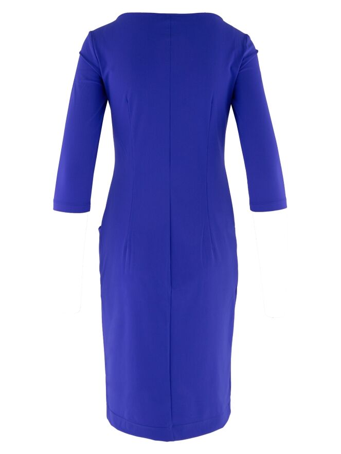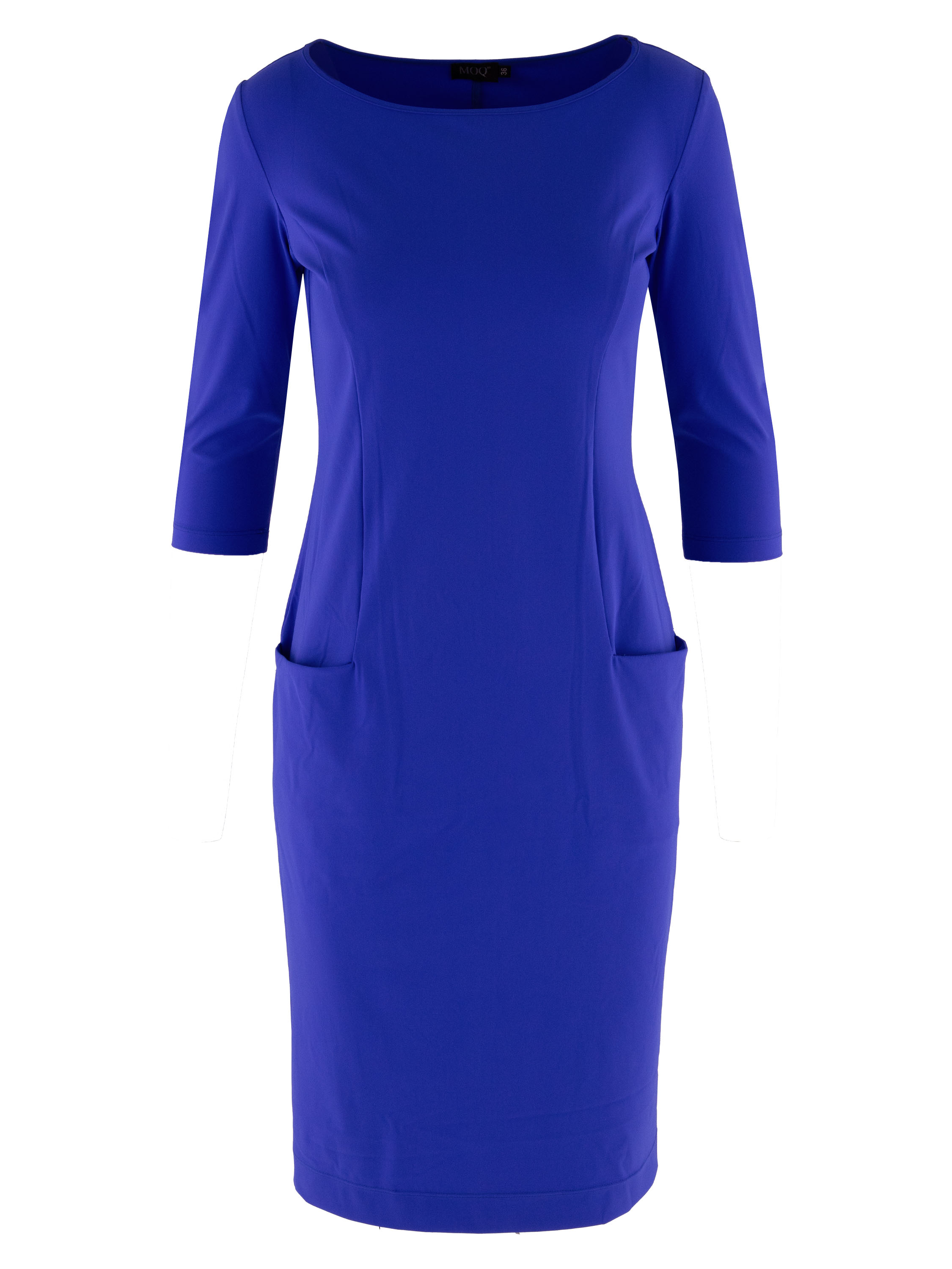 A dress by Moq in cobalt blue. The dress features a wide round neckline and half-length sleeves. Pockets are placed at the front at waist level. The dress is unlined and can be washed at 40 degrees.