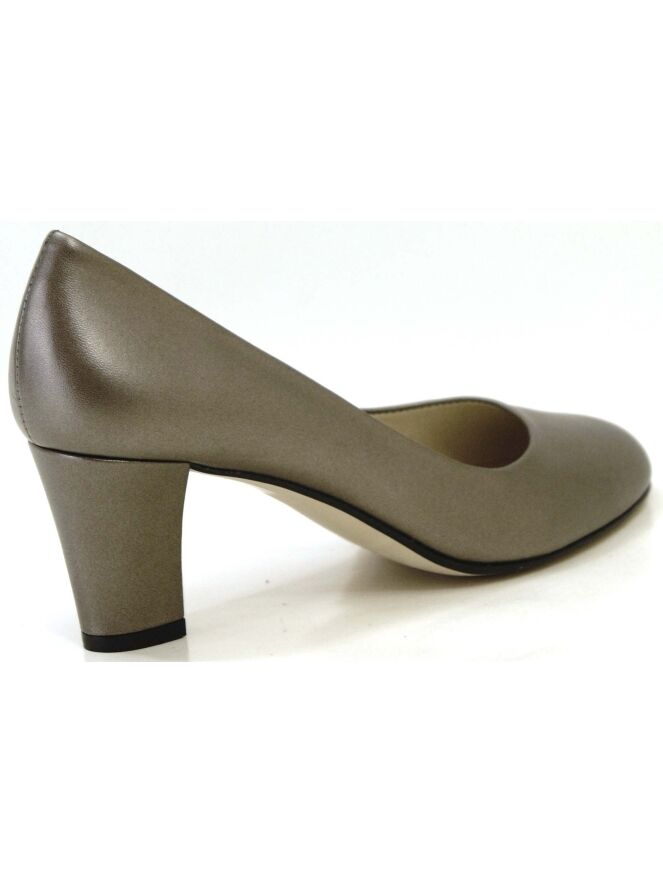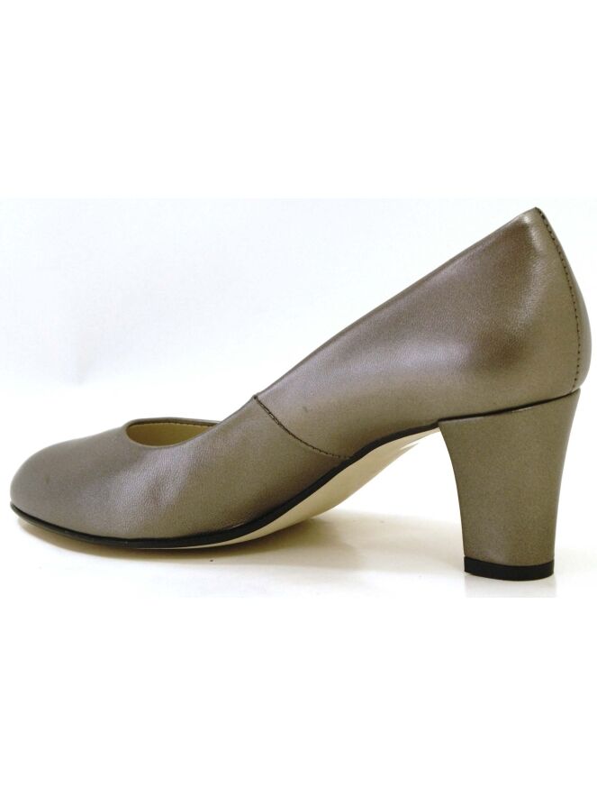 A pump from Nina Fiorucci in the soft bronze color. The pump has a round nose and the heel is covered in the same material as the pump. The inside is lined with leather.