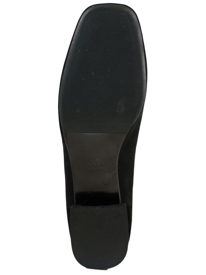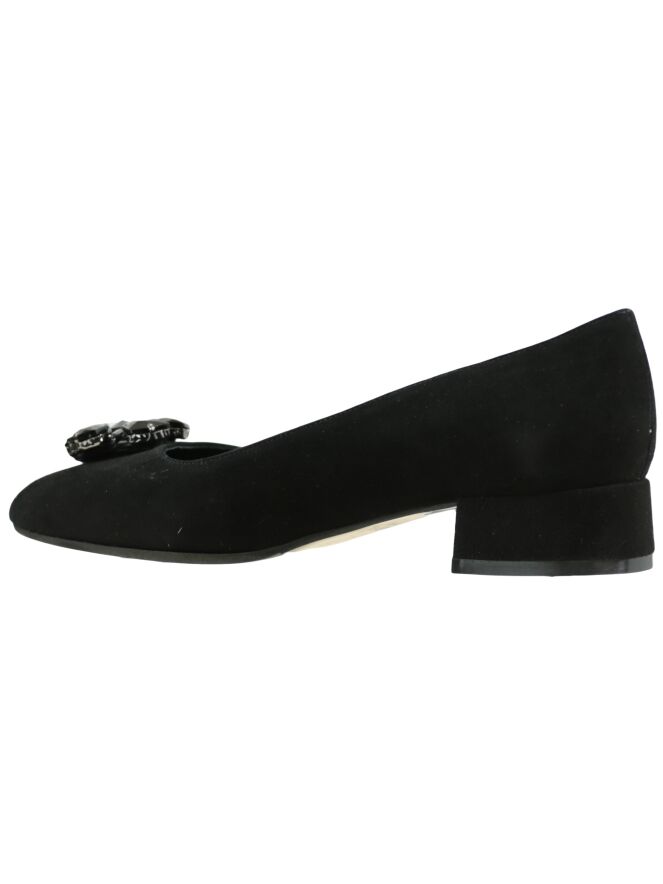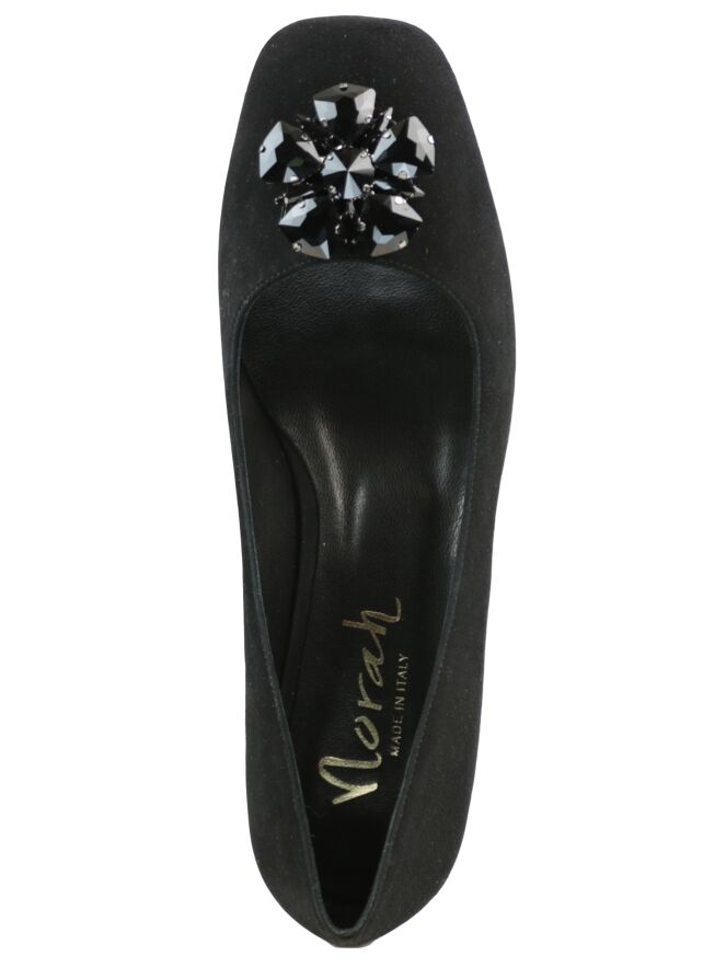 A low pump of the brand Norah in a black color. The pump has a rounded square toe with on the forefoot a flower-shaped buckle with black colored rhinestones. The pump has an elegant block heel and the inside of the pump is lined with leather.