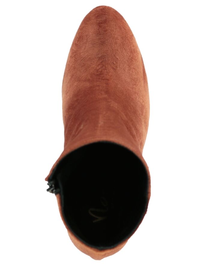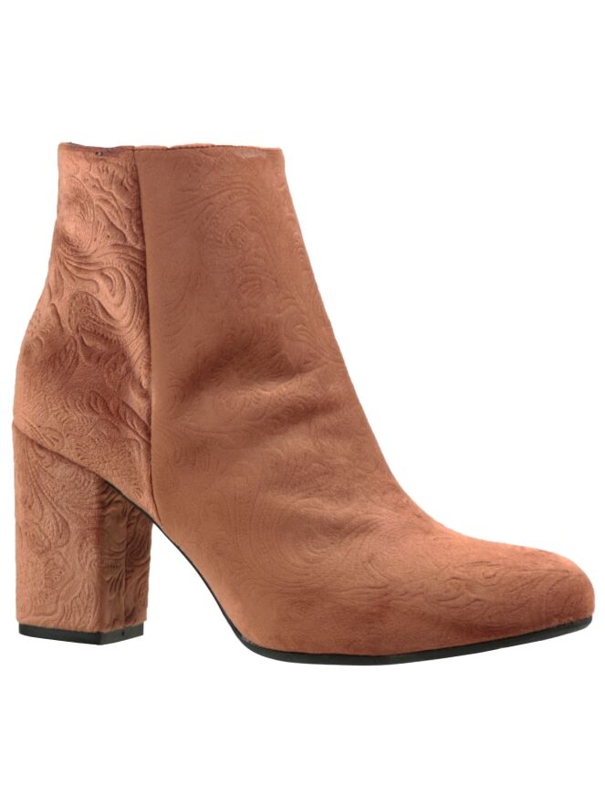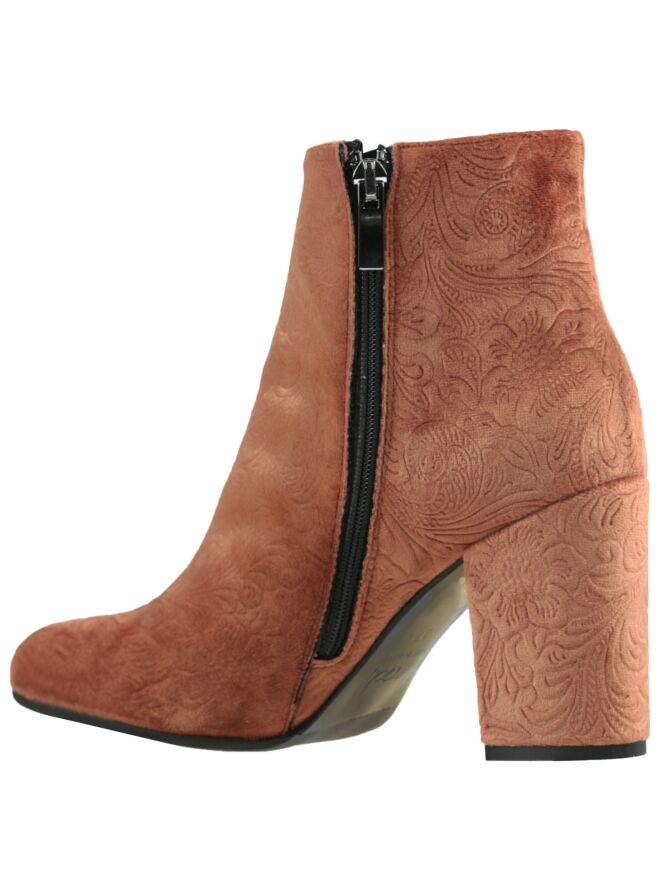 An ankleboot of the brand Norah in a rust color The ankle boot has a round toe and in the velvet is a baroque print processed. The height is 11 cm from the heel and shaft circumference is 28 cm. The inside of the boot is lined with leather.