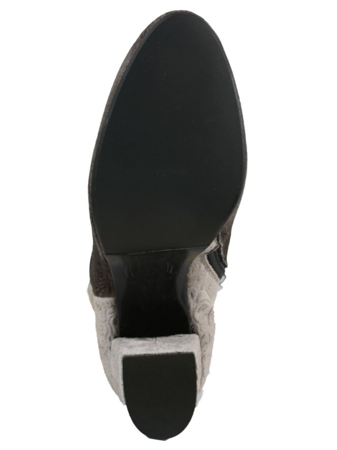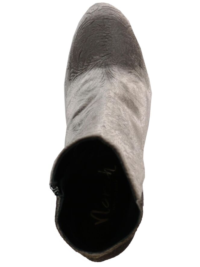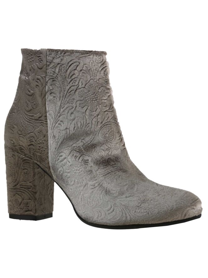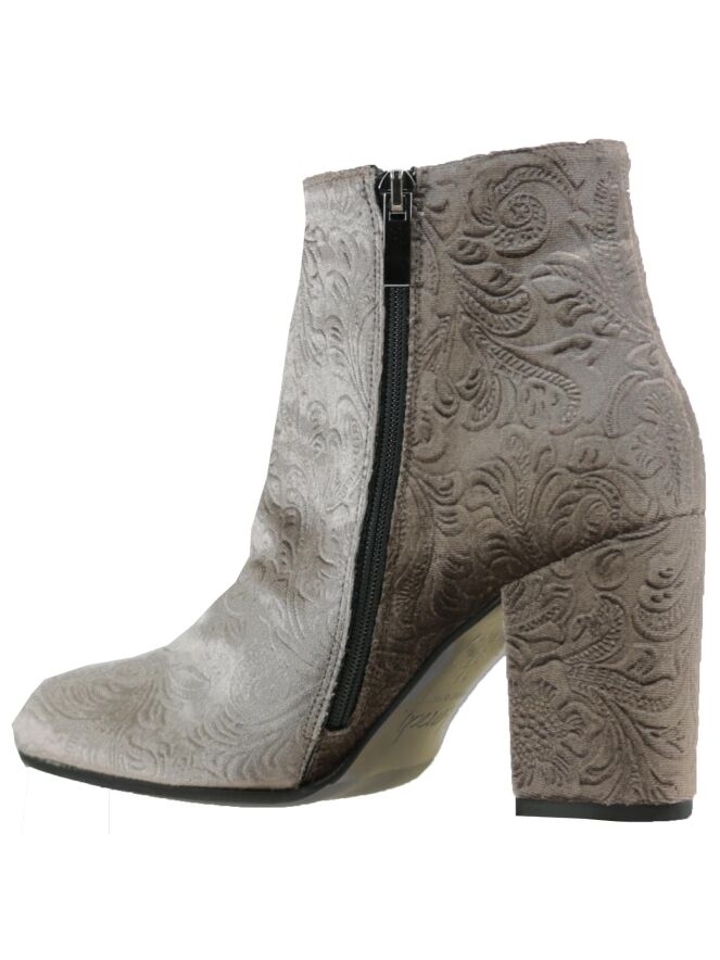 A single boot of the brand Norah in a taupe color The ankle boot has a round toe and in the velvet is a Baroque print processed. The height is 11 cm from the heel and shaft circumference is 28 cm. The inside of the boot is lined with leather.