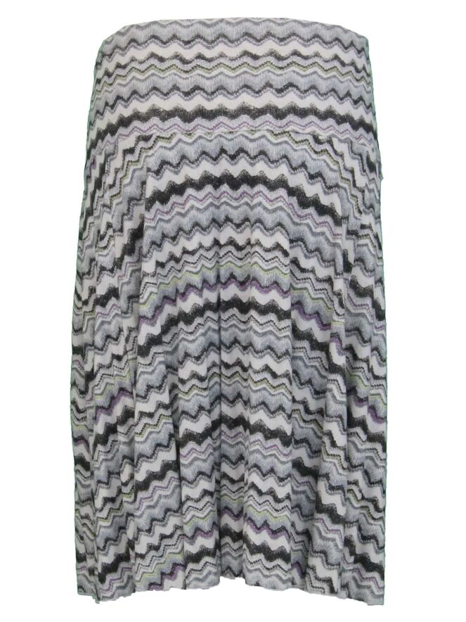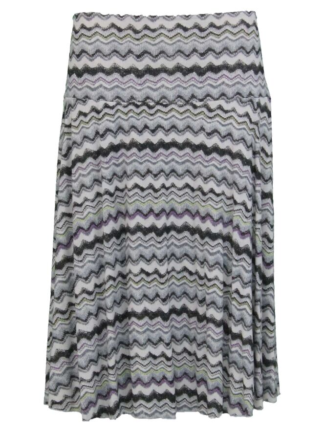 A skirt from orwell in a graphic print with the colors cream white, purple, kiwi green and more shades of gray. The skirt is in an A-line and is lined. This skirt can be washed by hand.