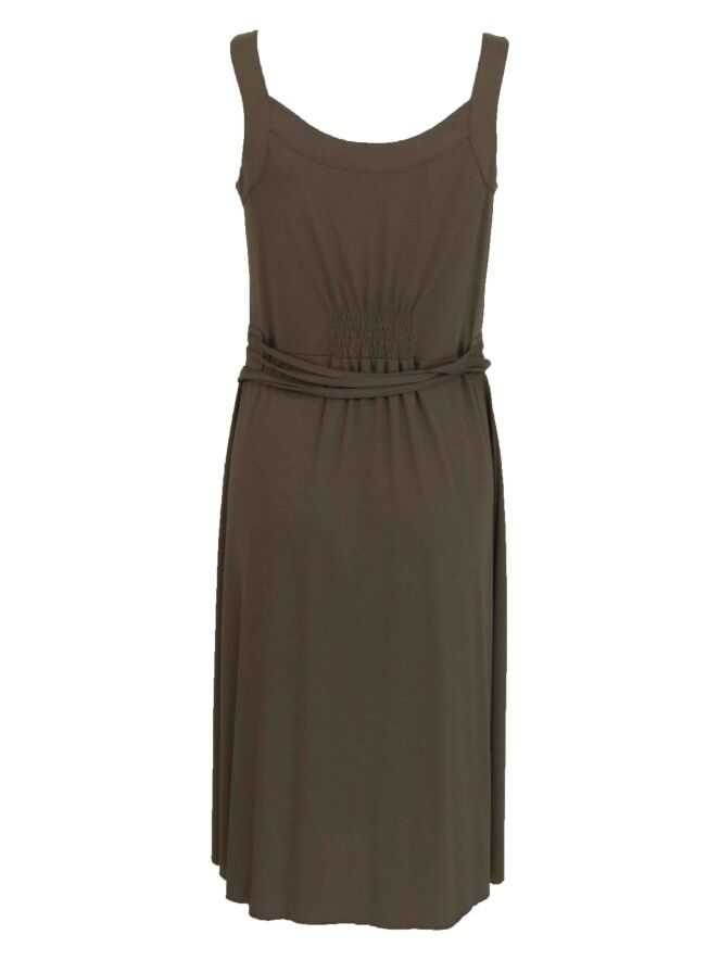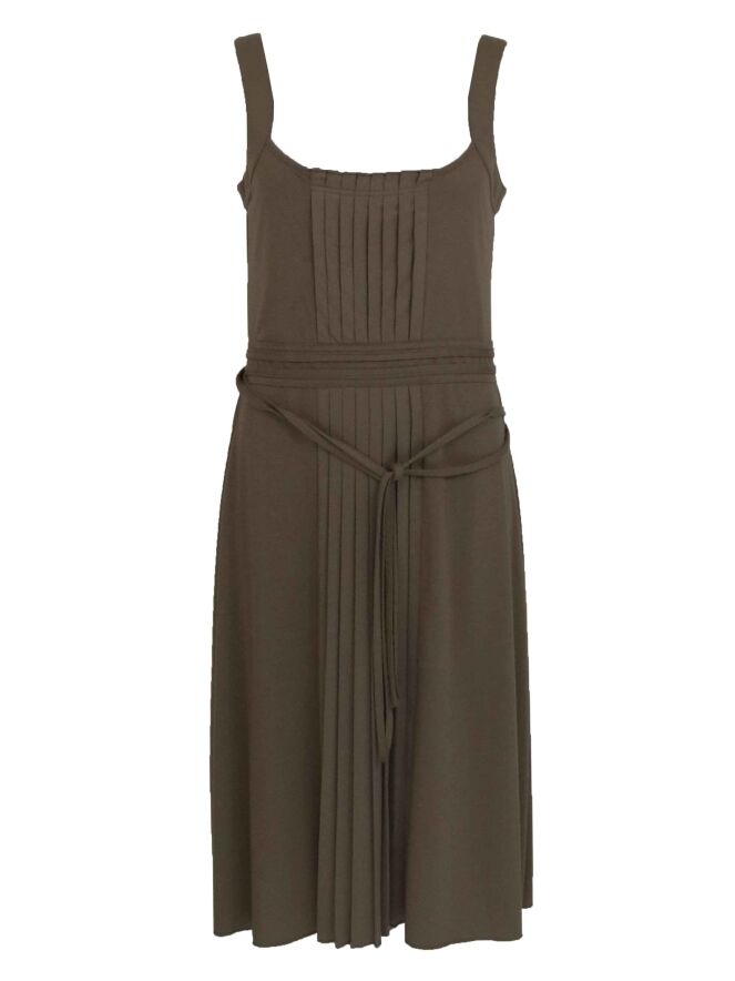 An Orwell dress in the color brown. At the waist is a waist band with stitched piping and a ribbon belt made of the same fabric as the dress. The fabric is pleated in the middle at the front. This dress can be washed at 30 degrees.