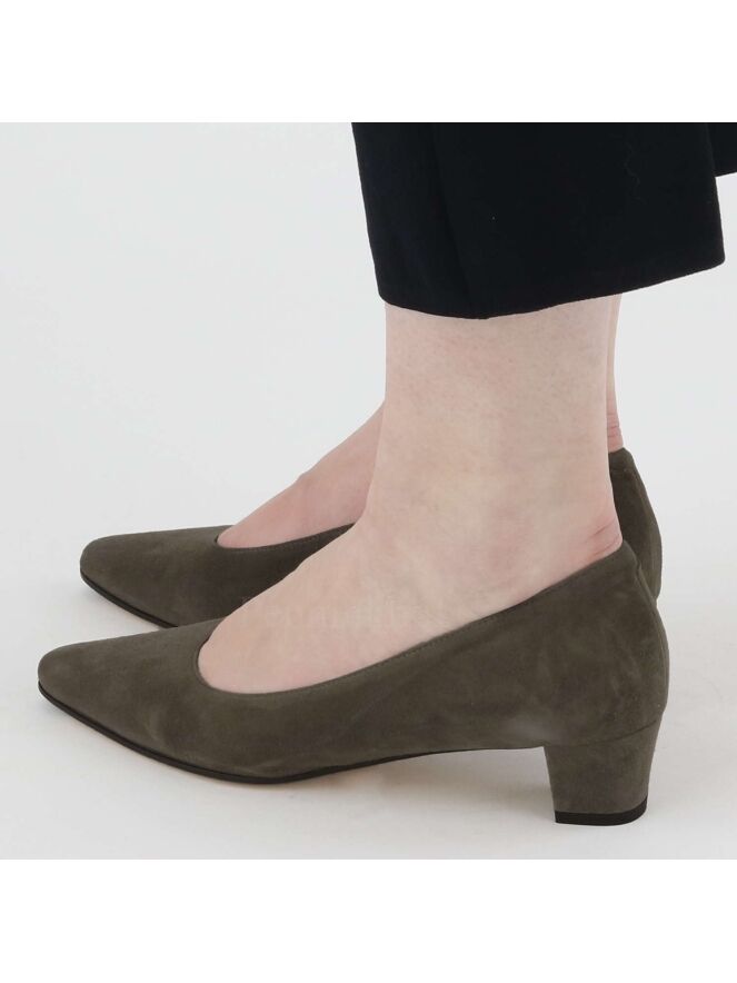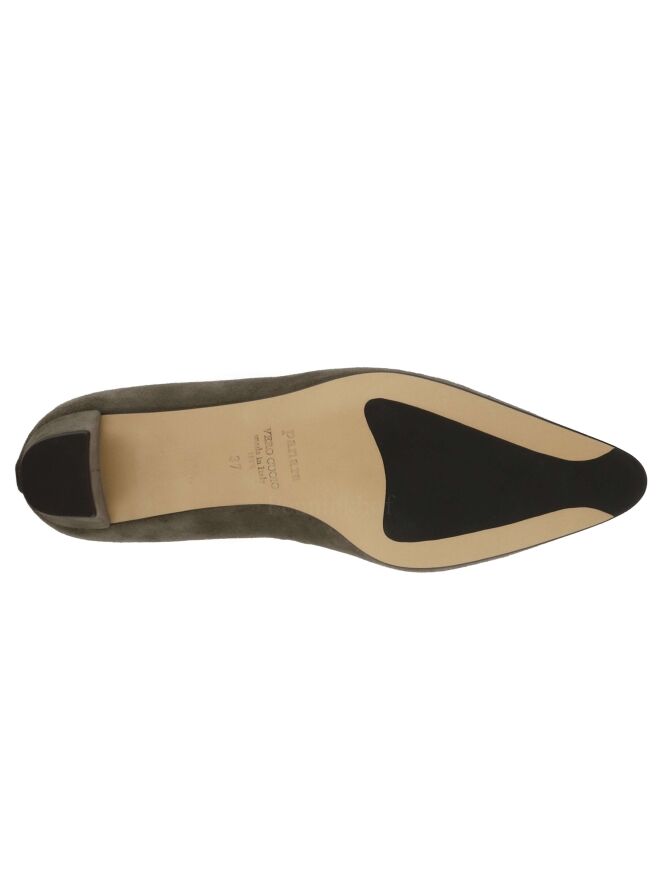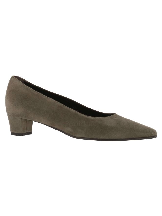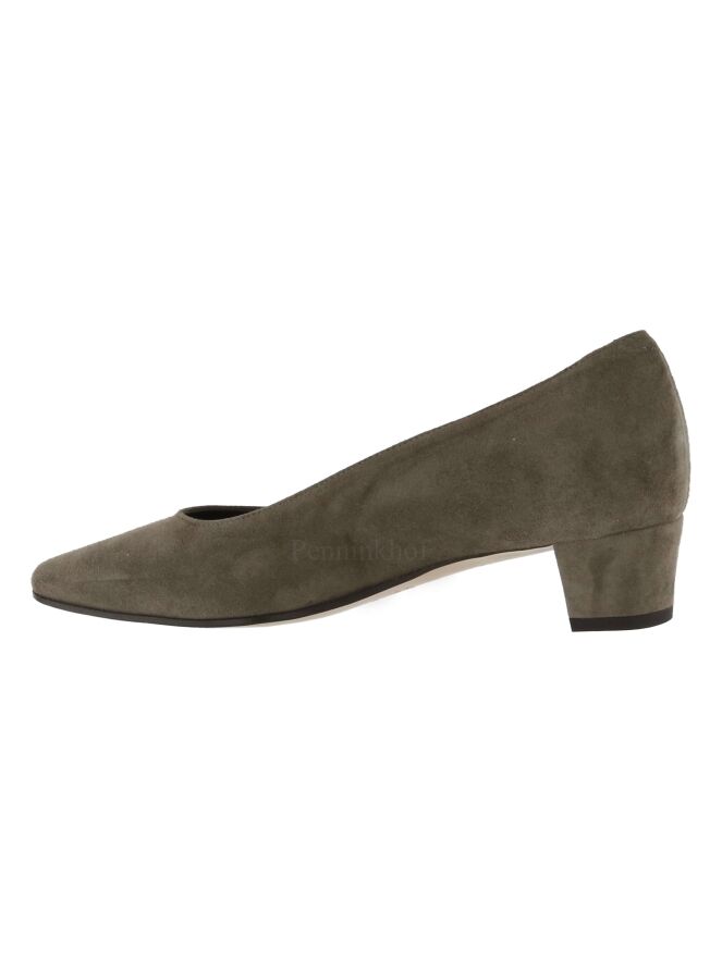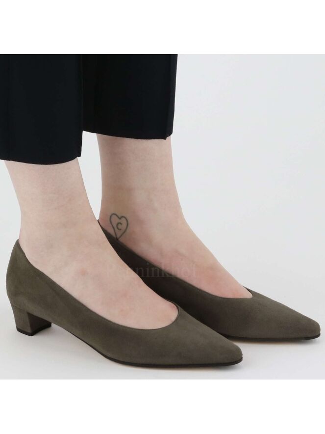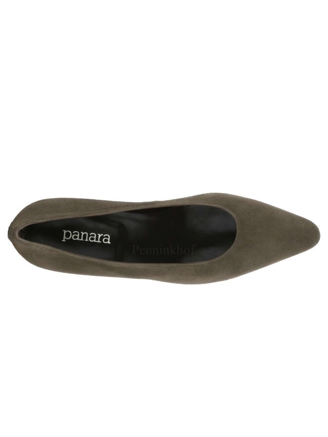 A pump from the brand Panara in the color taupe. The pump has a pointy toe and the elegant low heel is covered in the same suede as the pump. The inside of the pump is lined with leather.