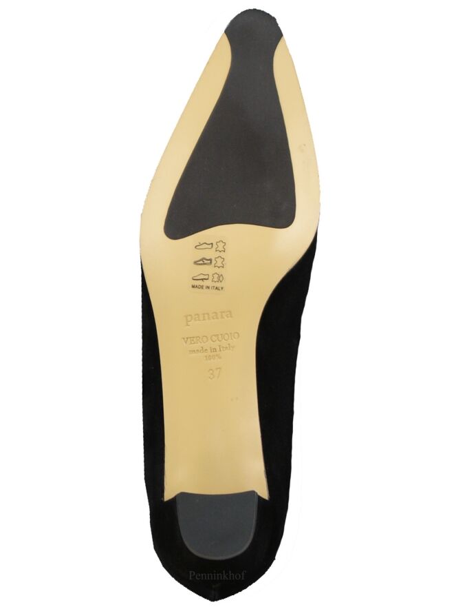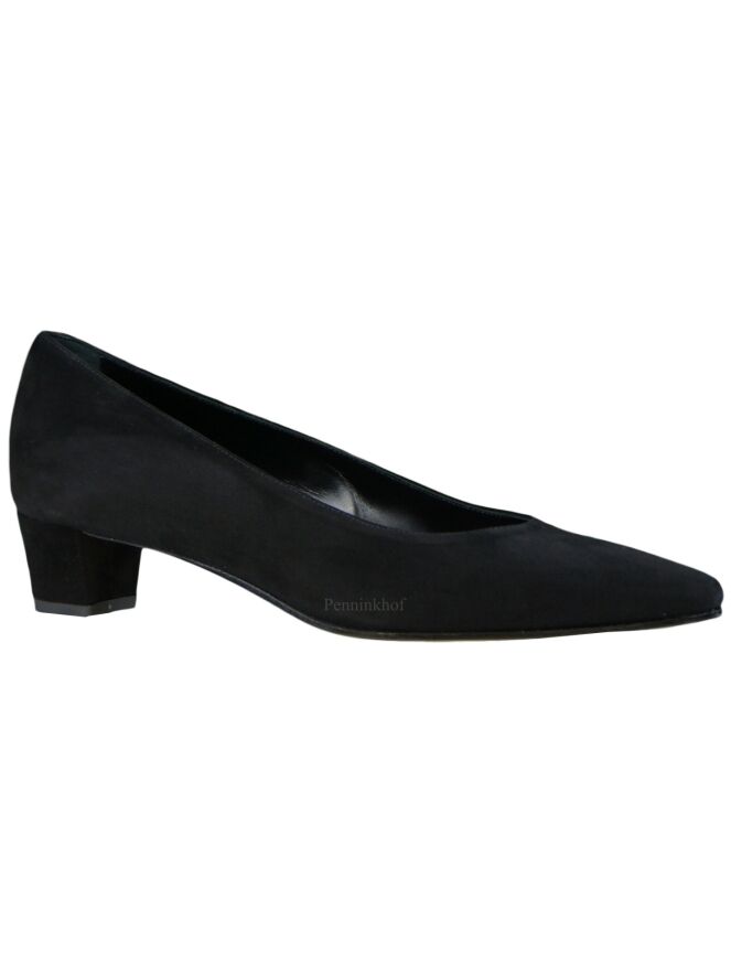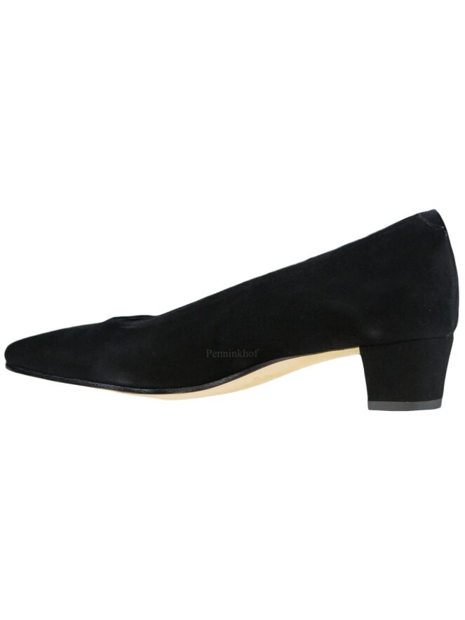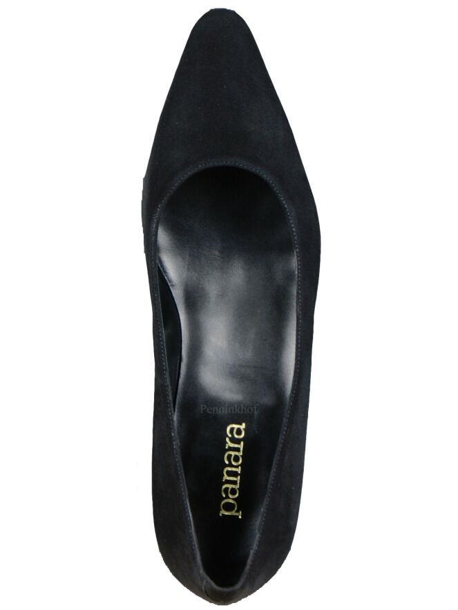 A pump of the brand Panara in the color black. The pump has a pointy nose and the elegant low heel is covered in the same suede as the pump. The inside of the pump is lined with leather.