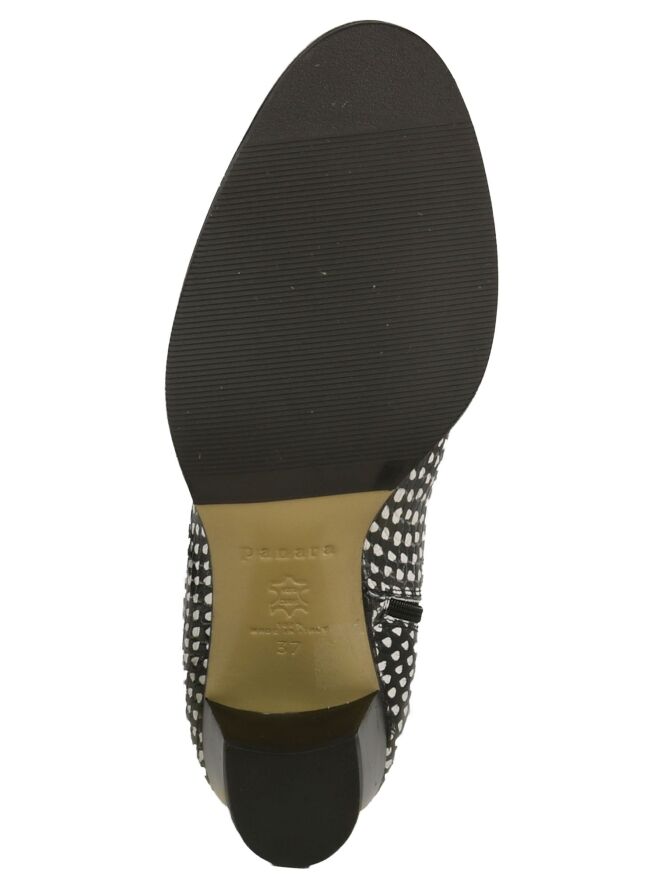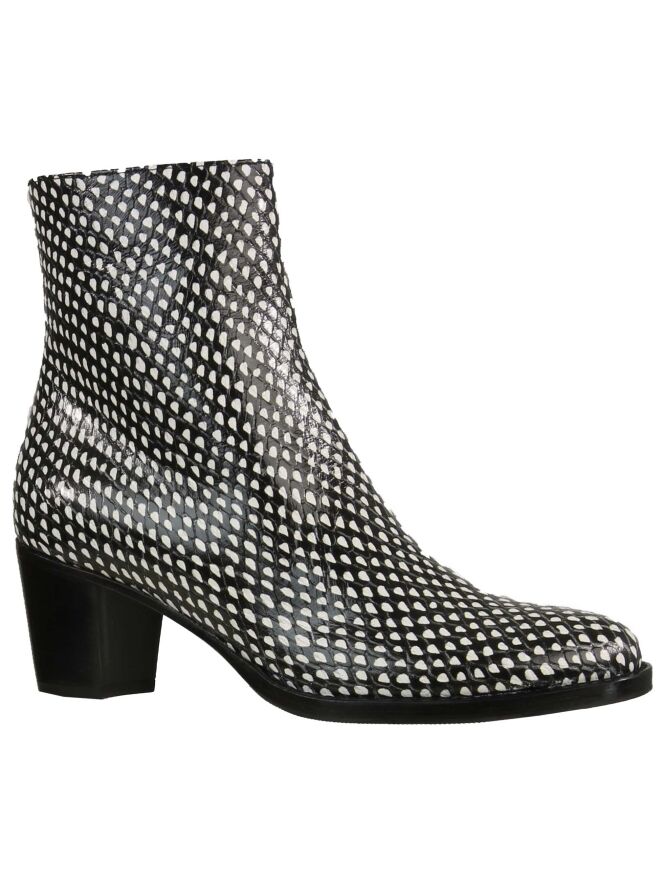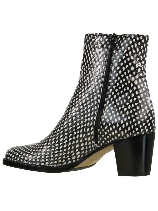 An ankleboot of the brand Panara in a print with the colors black and white. The boot has a round toe and has a neutral black heel. The shaft height from the heel is 13 cm and the circumference of the shaft is 25 cm. The inside is lined with leather.