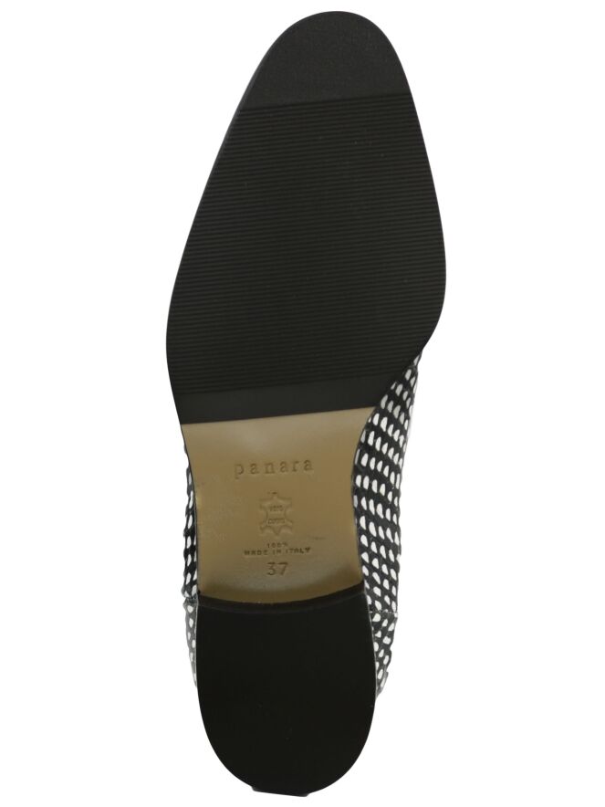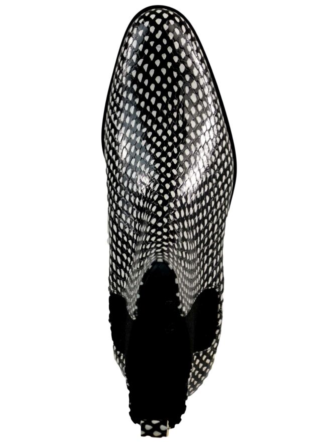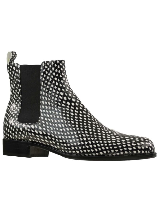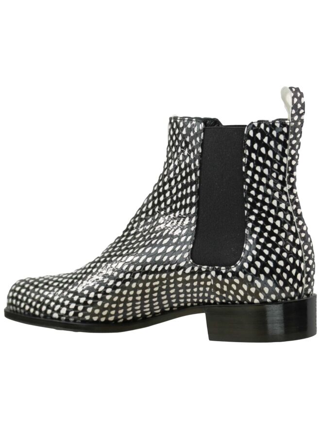 An ankle boot of the brand Panara in a print with the colors black and white. On both sides of the boot is an elastic fabric used. The inside of the boot is lined with leather.
