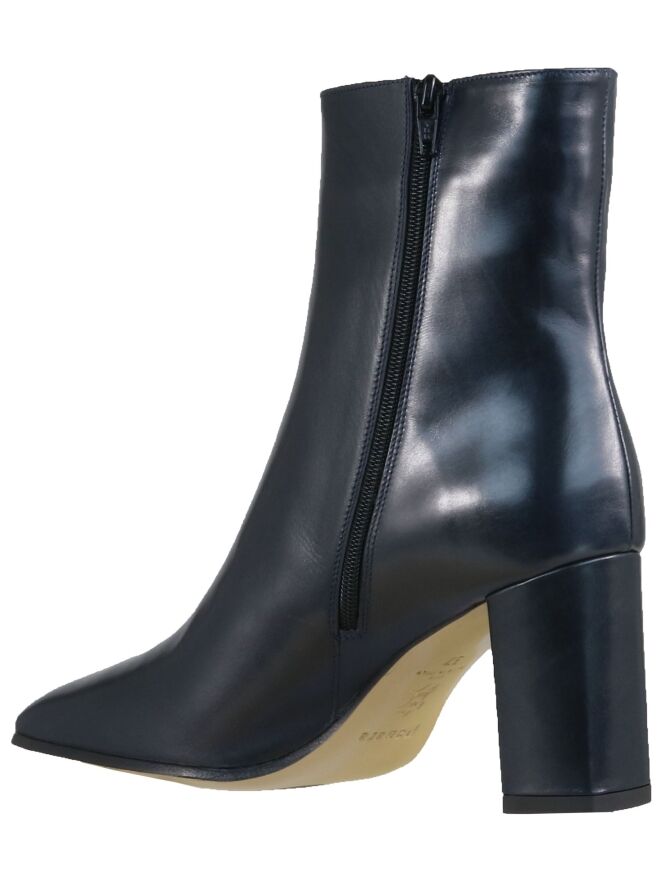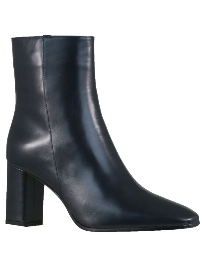 A short boot of the brand in Panara in navy blue nappa leather. The boot has a square toe and has a block heel. The height is 15 cm from the heel and the shaft circumference is 27 cm. The inside is lined with leather.