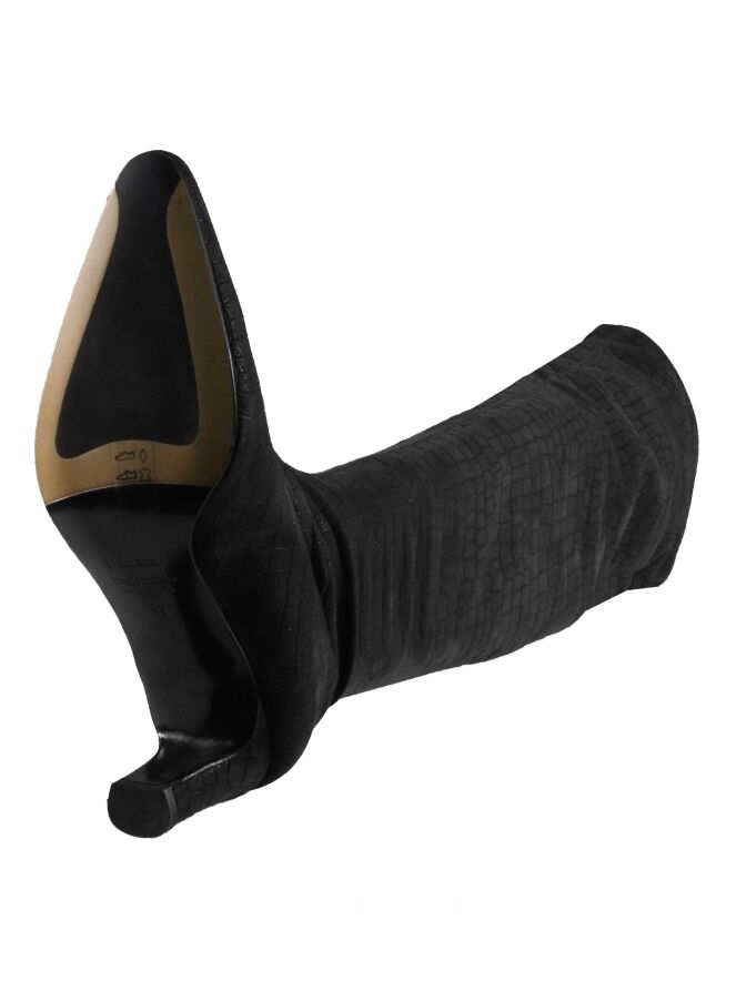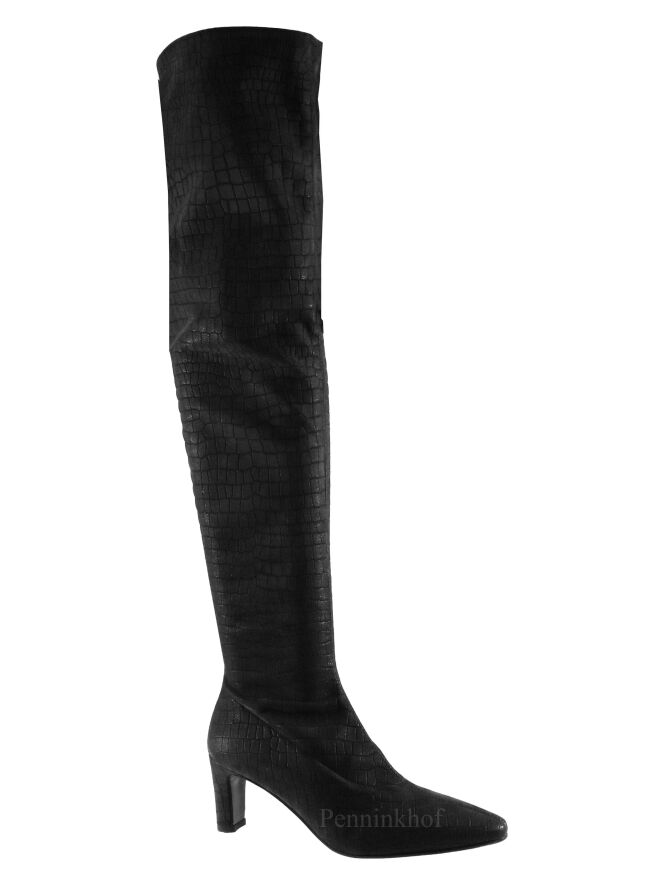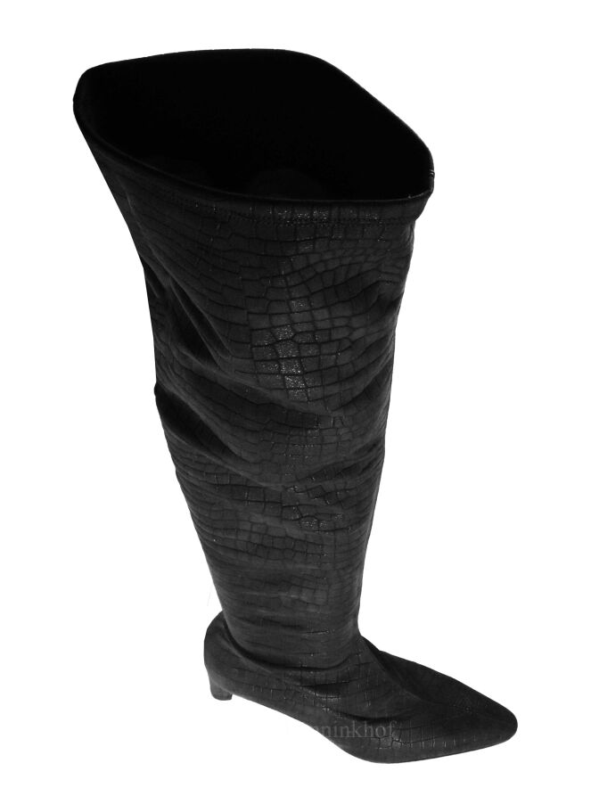 A stretch knee boots from Panara in a giraffe print in multiple shades of black. The boot has a slightly pointed nose and the heel is covered in the fabric of the boot.