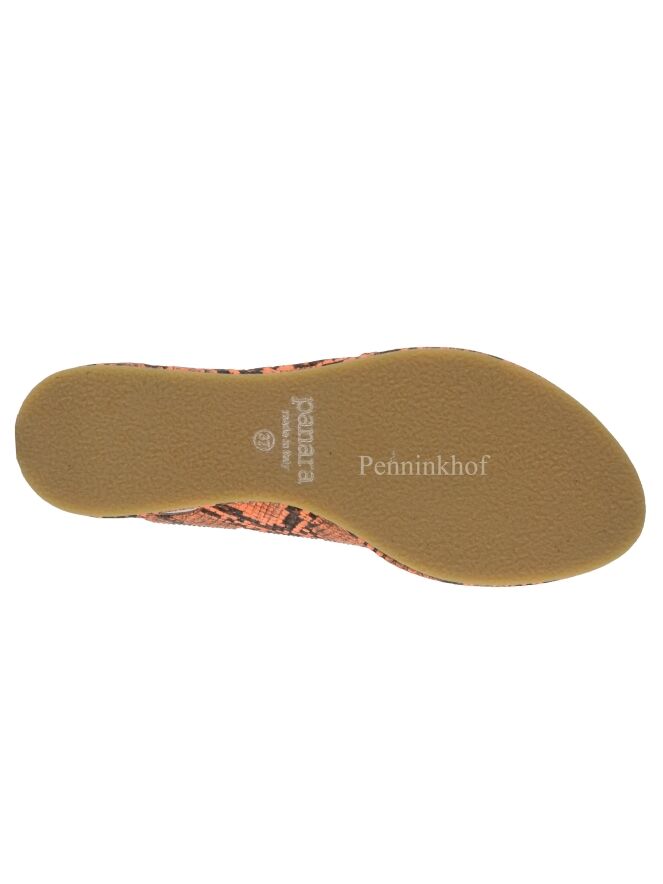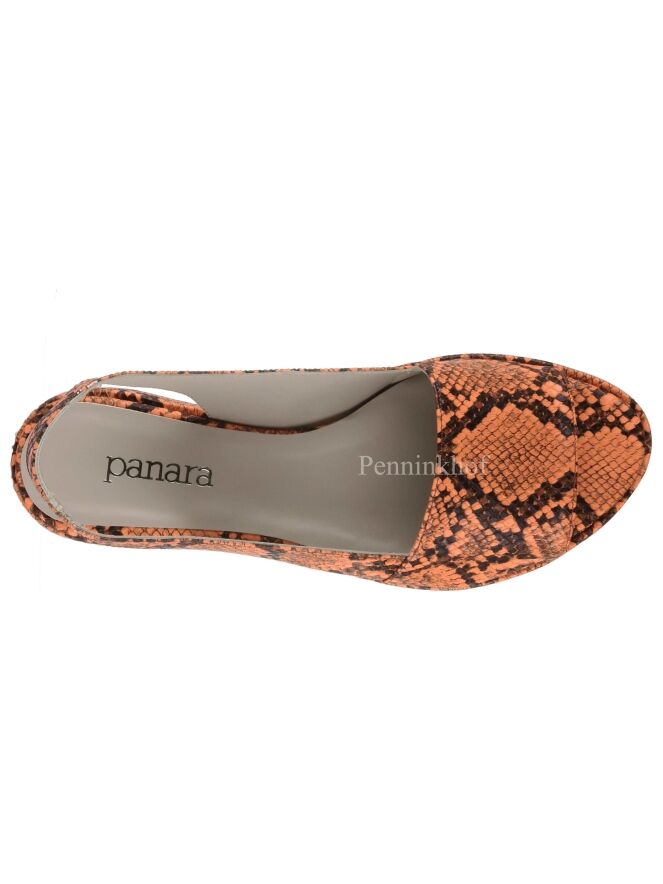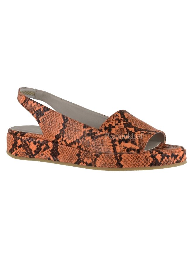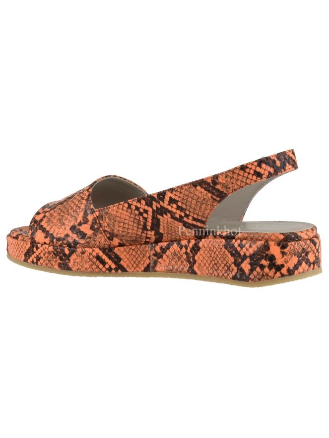 A Sandal from Panara in a python print in the colors black and orange. The sandal has a heel strap. The inside is lined with leather.