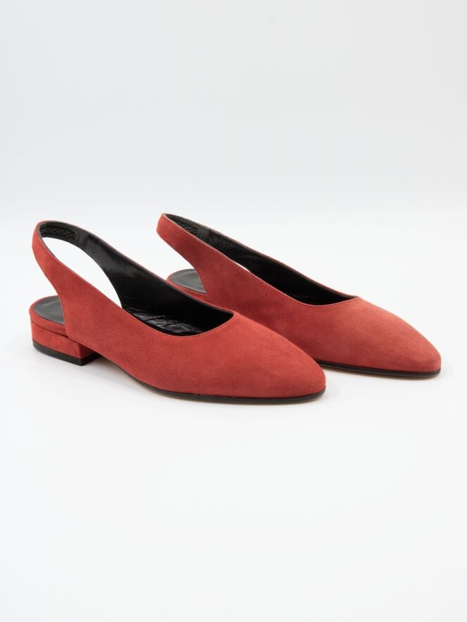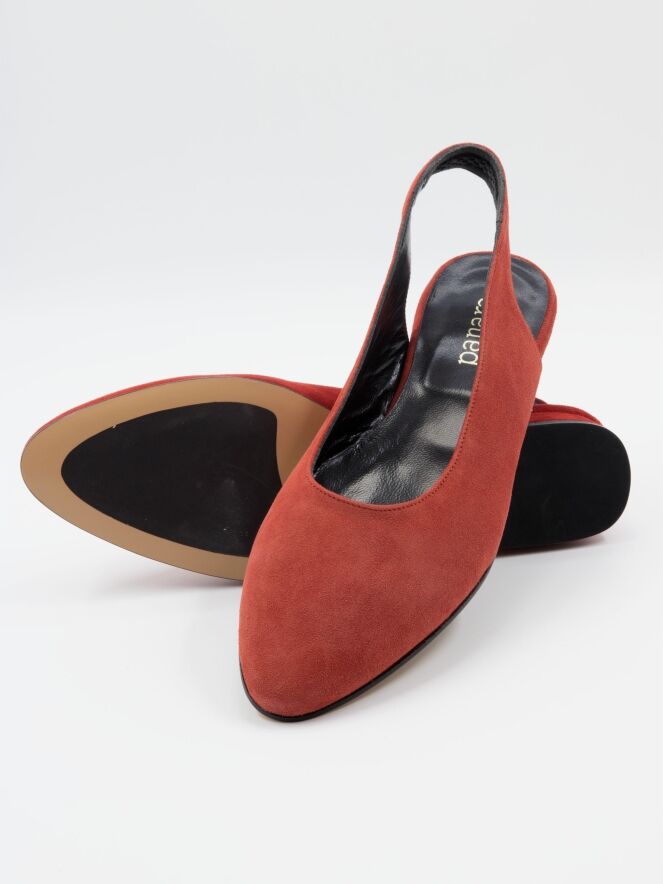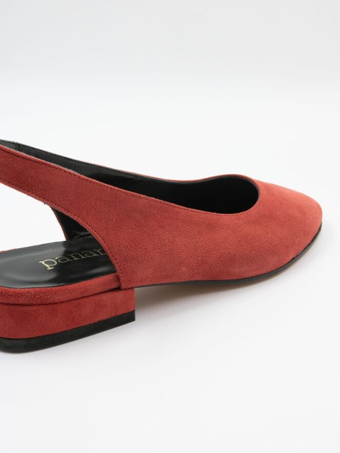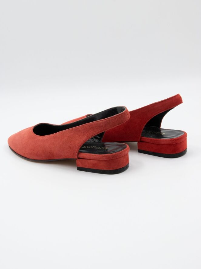 A loafer with an open heel of the brand Panara in the color red. The slip-on has a round toe and the heel is lined with the same material as the shoe. The inside of the slip-on leather lined.