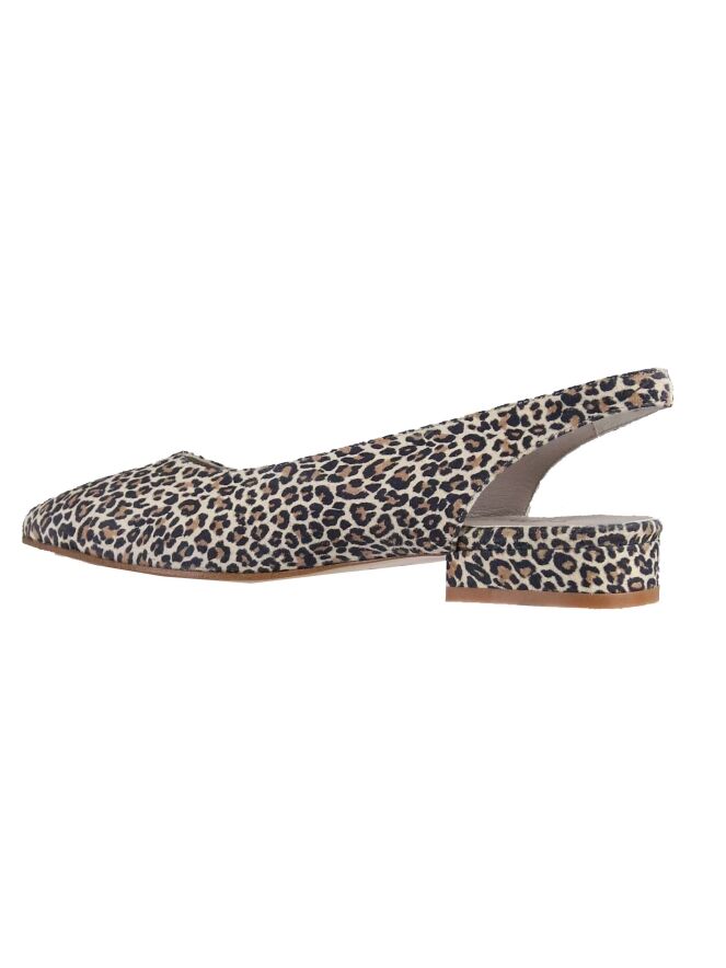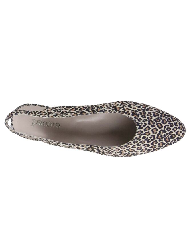 A loafer with an open heel from the brand Panara in a panther print with multiple pastel shades of taupe, camel and black. The loafer has a round toe and the heel is covered with the same material as the shoe. The inside of the loafer is lined with leather.