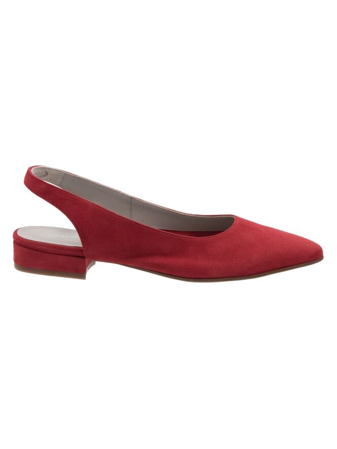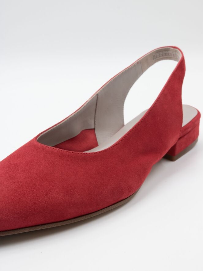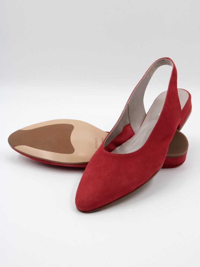 A backless loafer from Panara in vibrant red. The loafer features a rounded toe, and the heel is covered in the same material as the shoe. The interior is lined with leather.