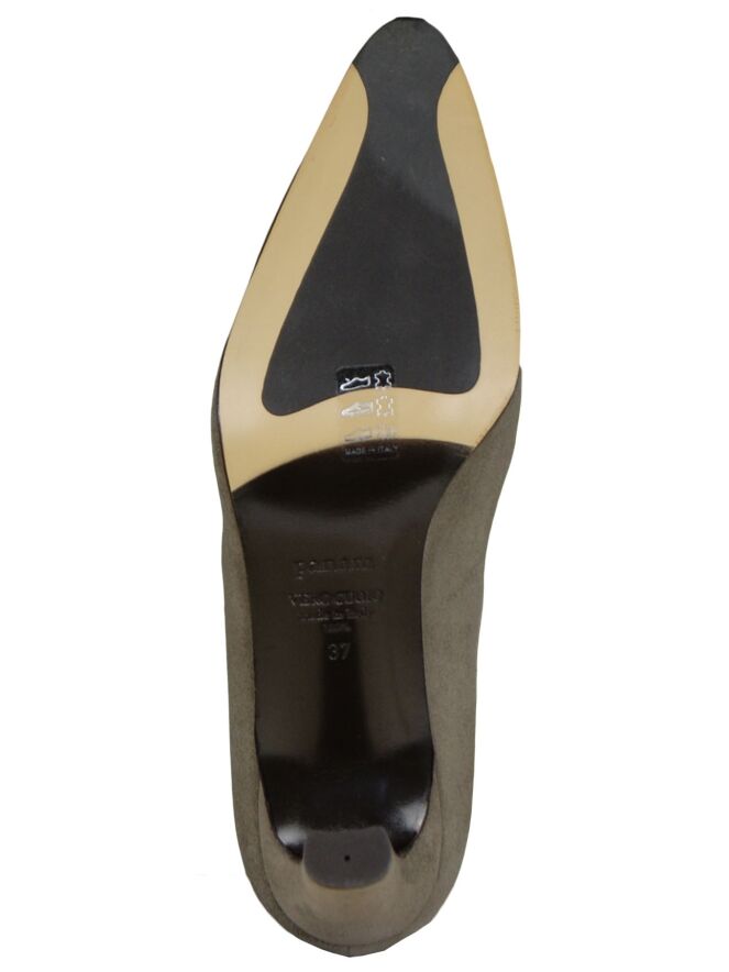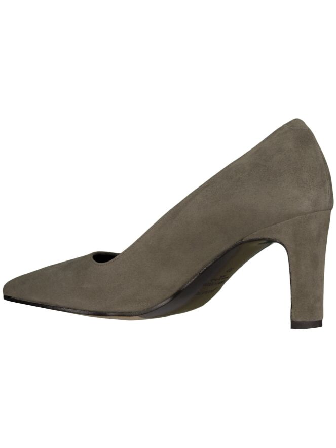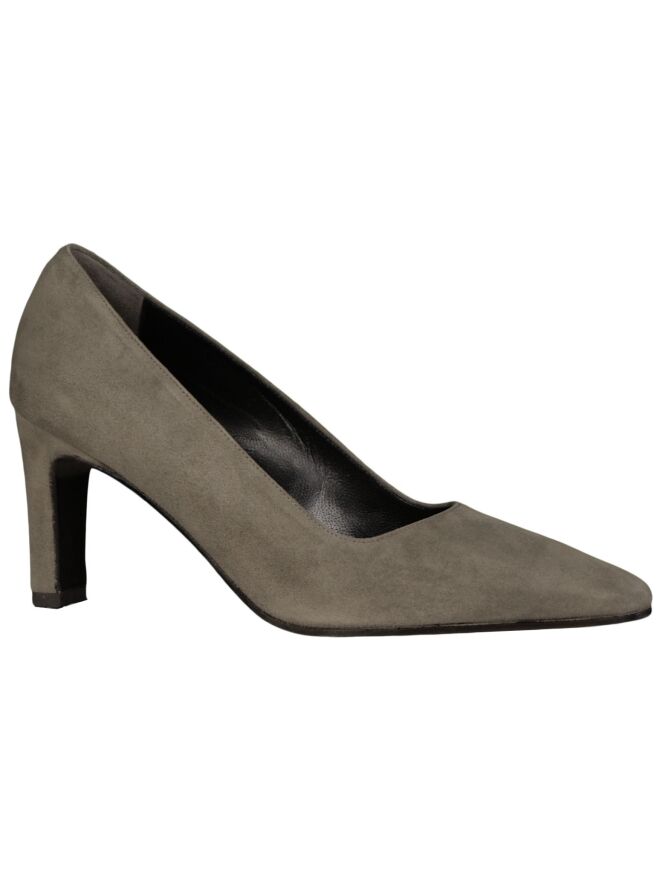 A pump of the brand Panara in taupe. The pump has a pointed toe and elegant 7 cm high slim-cut heel in the same material as the pump. The inside of the pump is lined with leather.