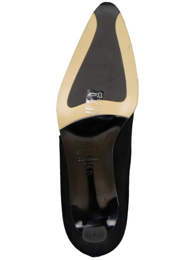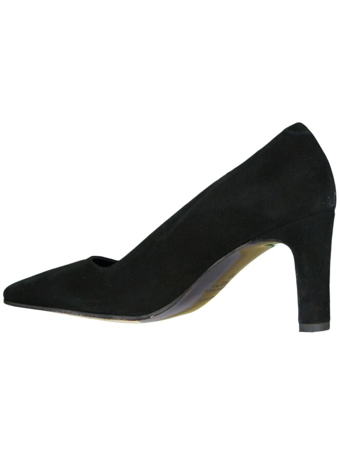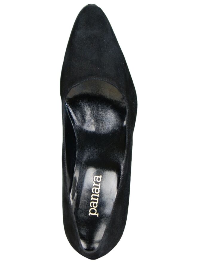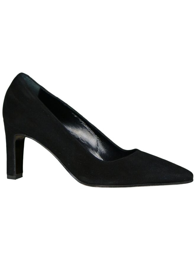 A pump of the brand Panara in black. The pump has a pointed toe and elegant 7 cm high slim-cut heel in the same material as the pump. The inside of the pump is lined with leather.