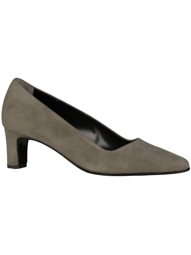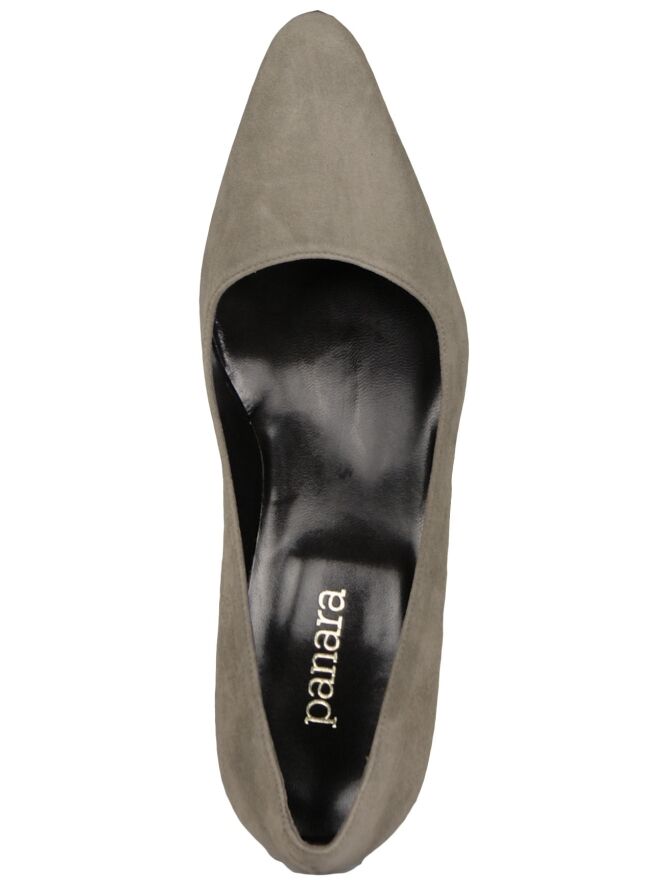 A pump of the brand Panara in taupe. The pump has a pointed toe and elegant slim-cut heel is the same material as the pump. The inside of the pump is lined with leather.