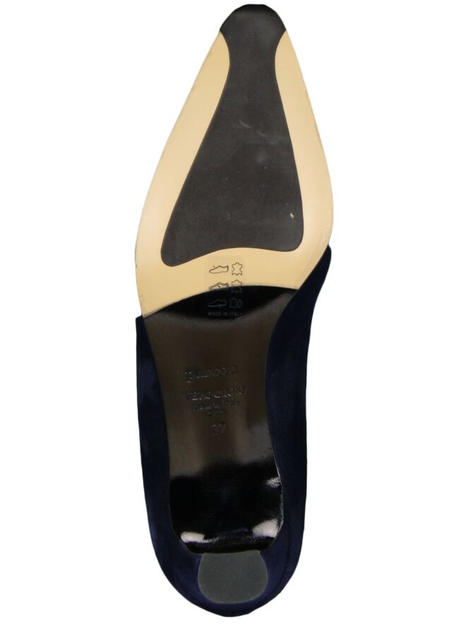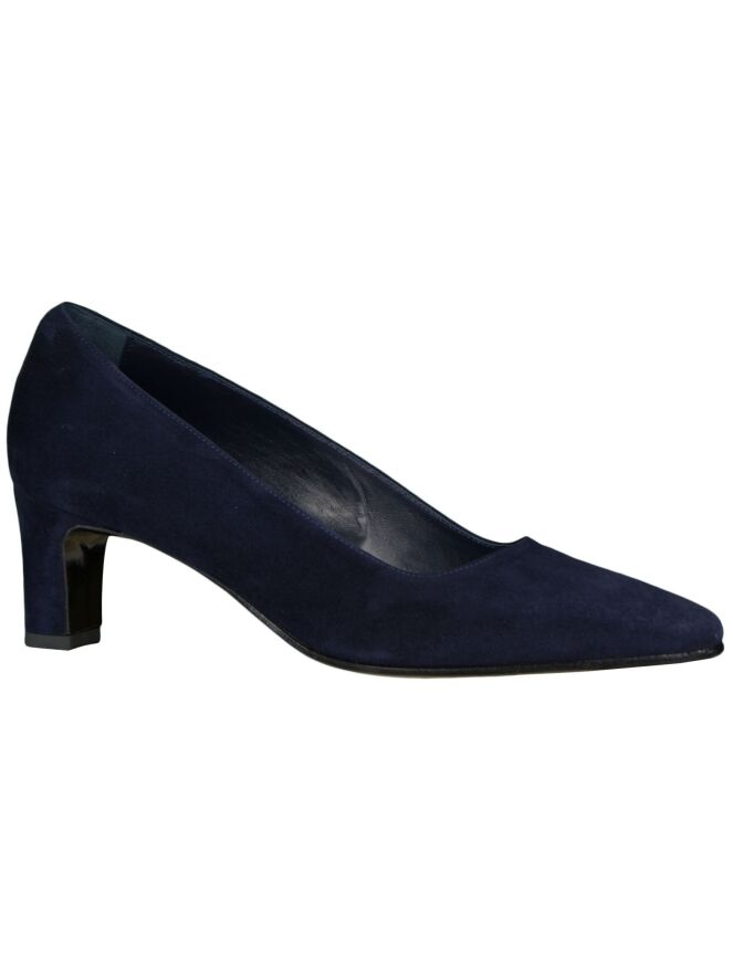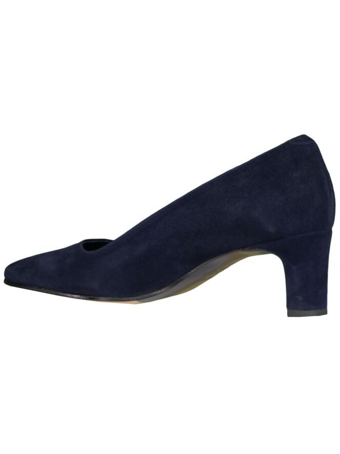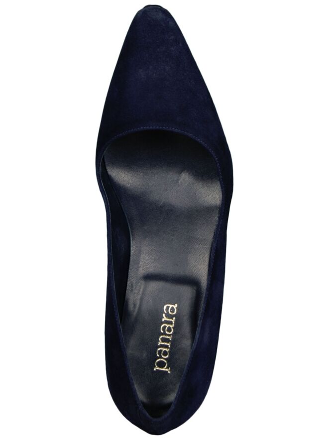 A pump of the brand Panara in navy bleu. The pump has a pointed toe and elegant slim-cut heel is the same material as the pump. The inside of the pump is lined with leather.