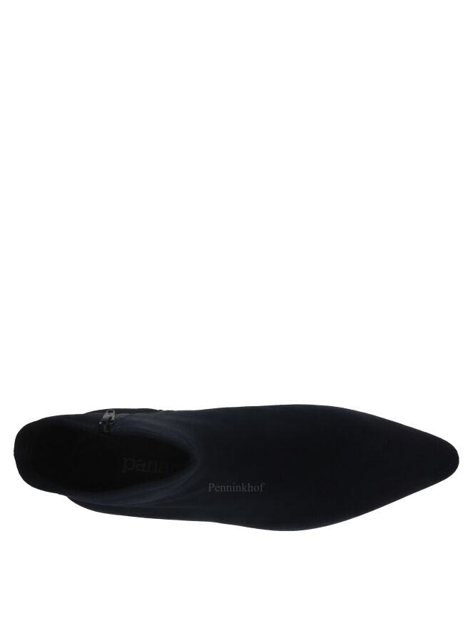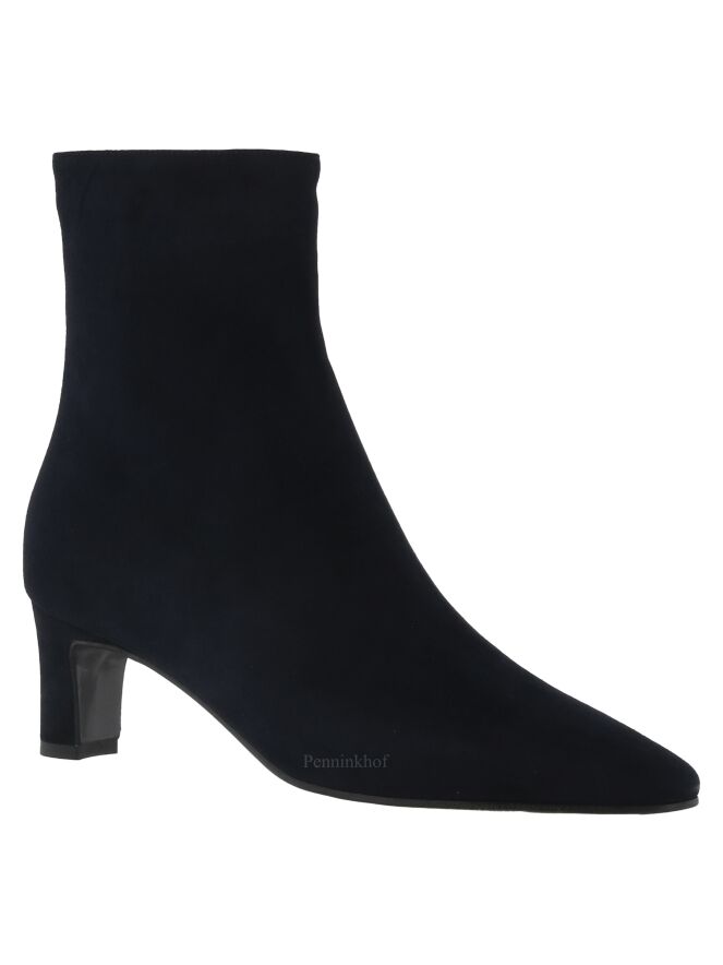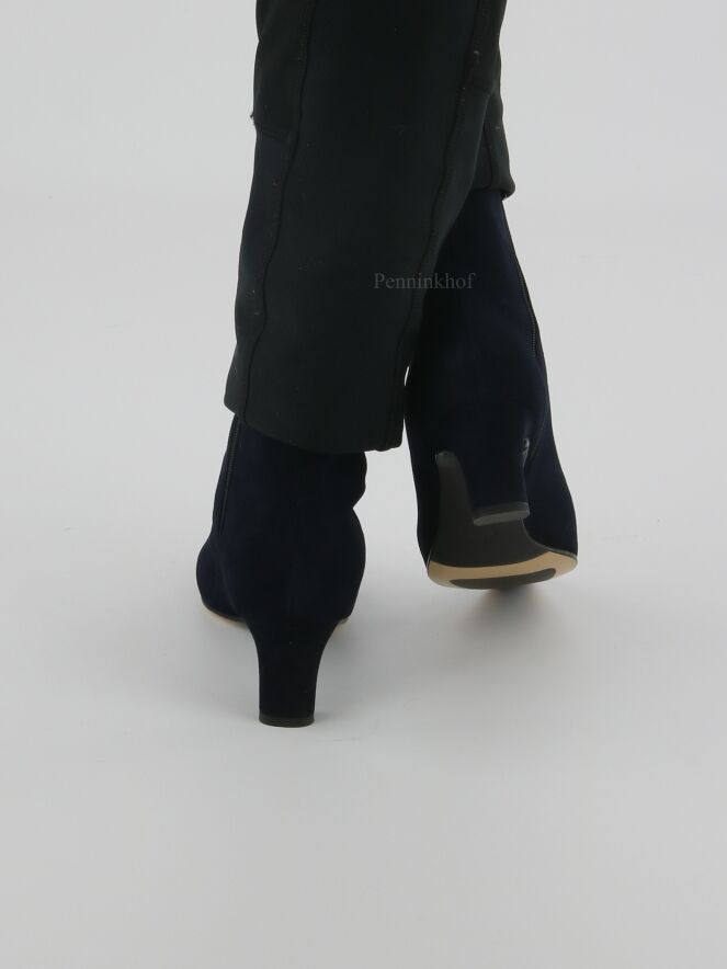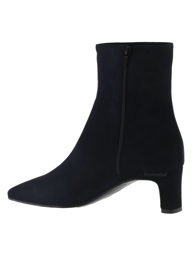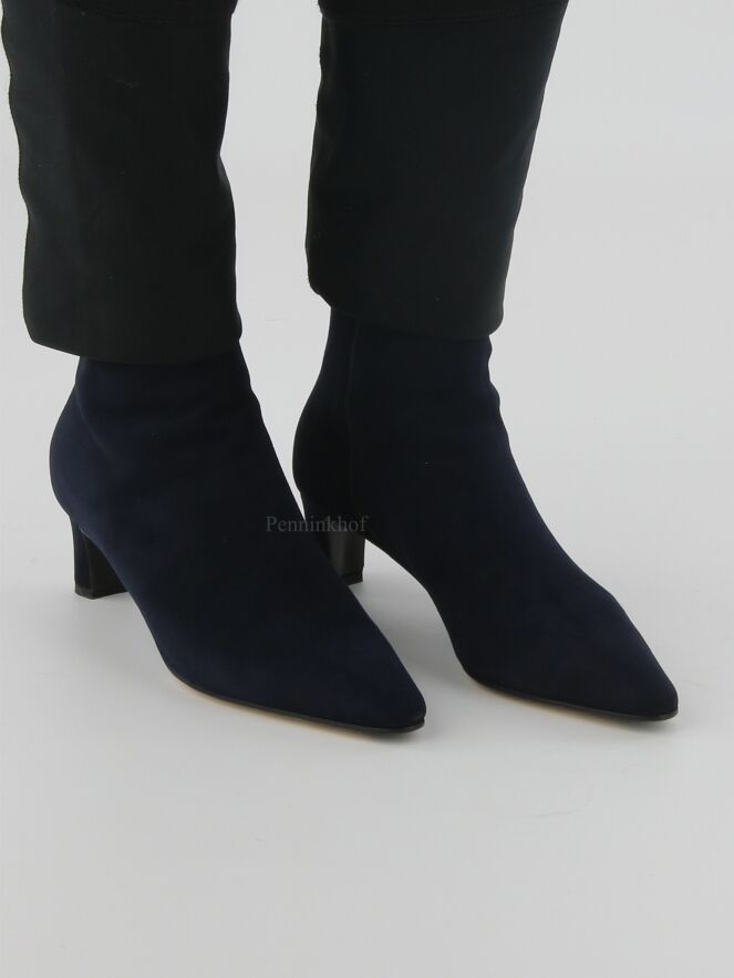 A short boot from the brand Panara in a soft camoscio suede in the color navy blue. The forefoot has a slim cut toe. There is a zipper on the inside of the shaft. The boot is lined with leather on the inside.