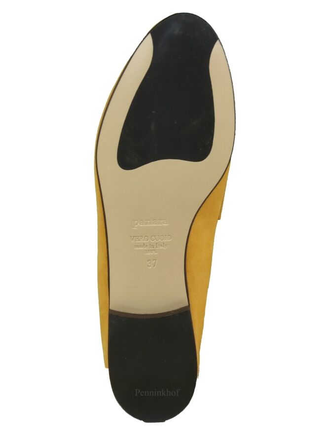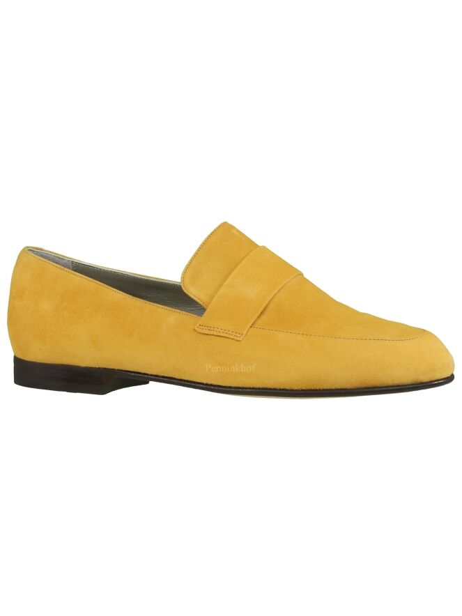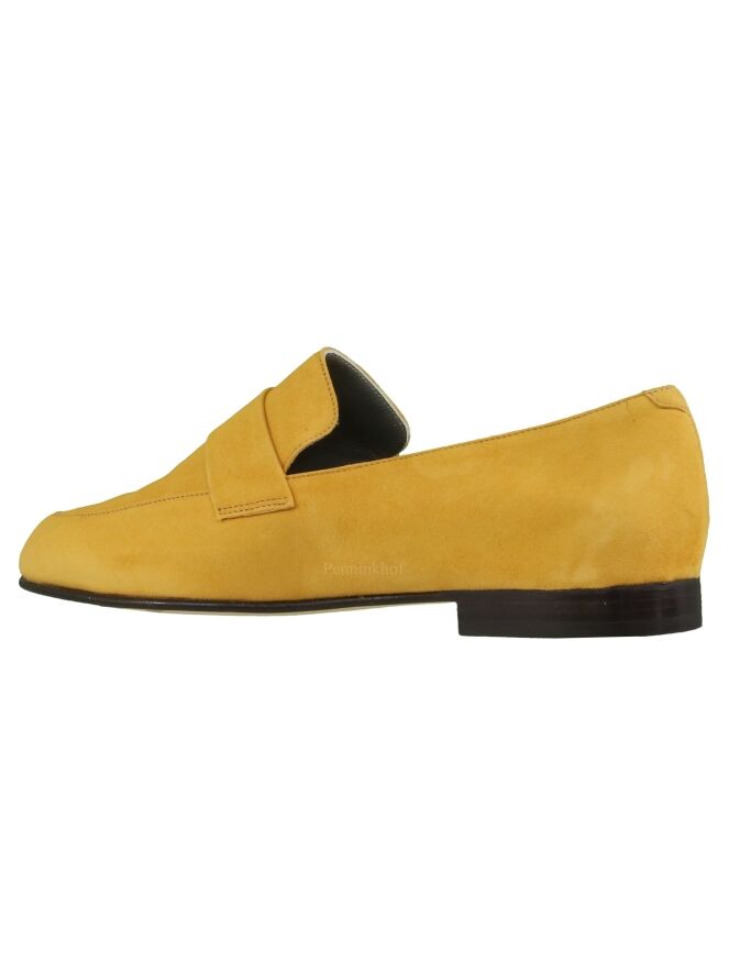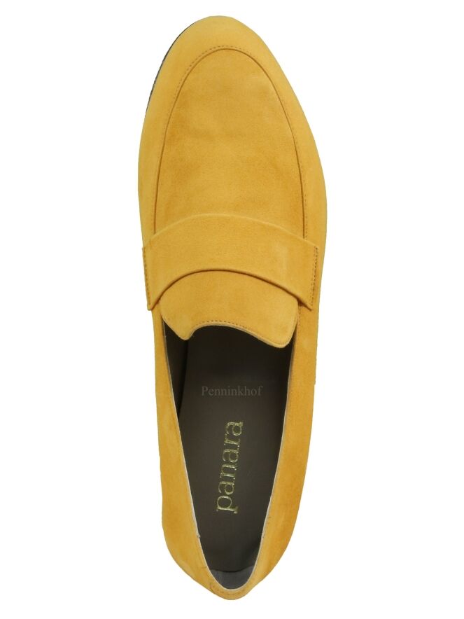 A Panara loafer in the color ocher yellow. About the forefoot with a round toe is a narrow band in the same material as the slip-on. The loafer is lined with leather on the inside.