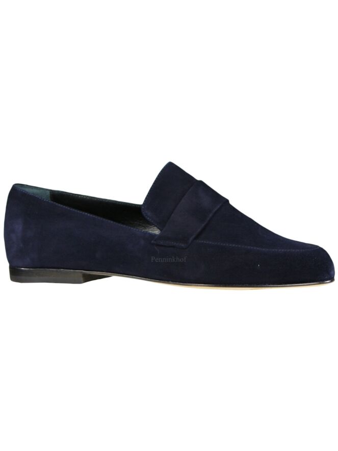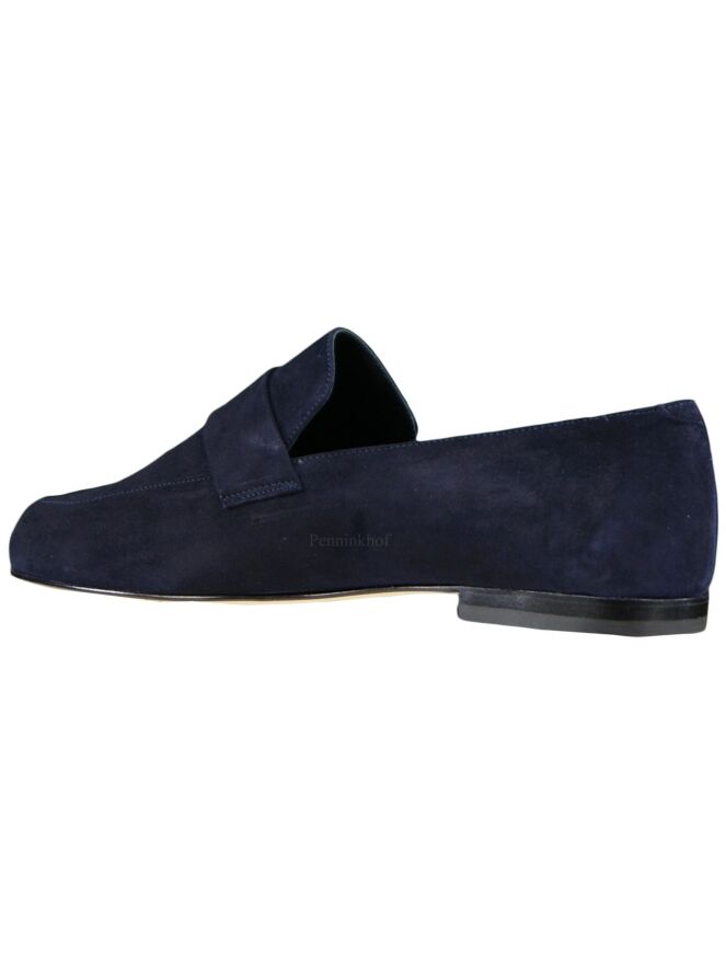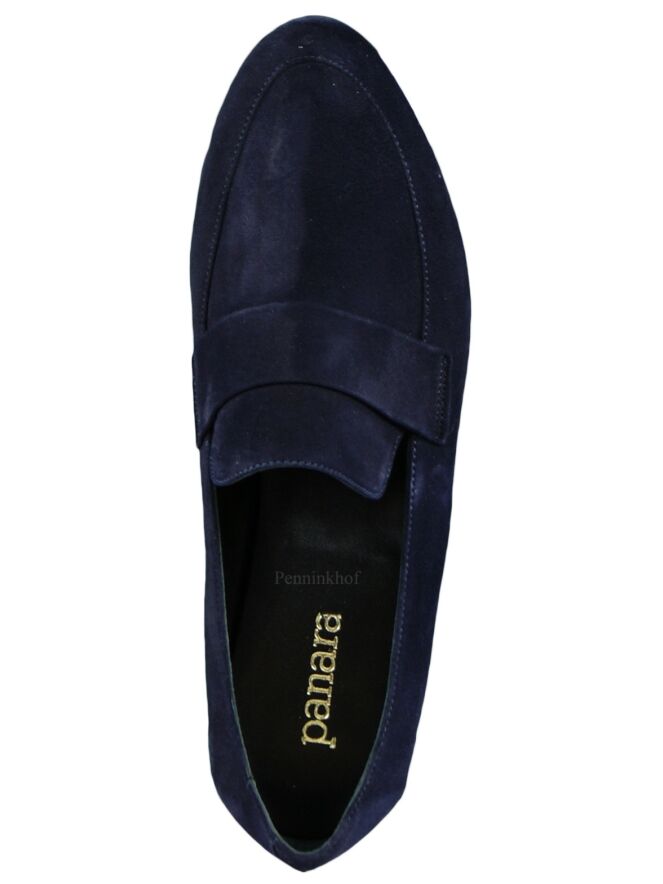 A loafer of the brand Panara in the color marine. On the front foot with a round toe is a narrow band in the same material as the slip-on. The loafer is on the inside with leather lined.