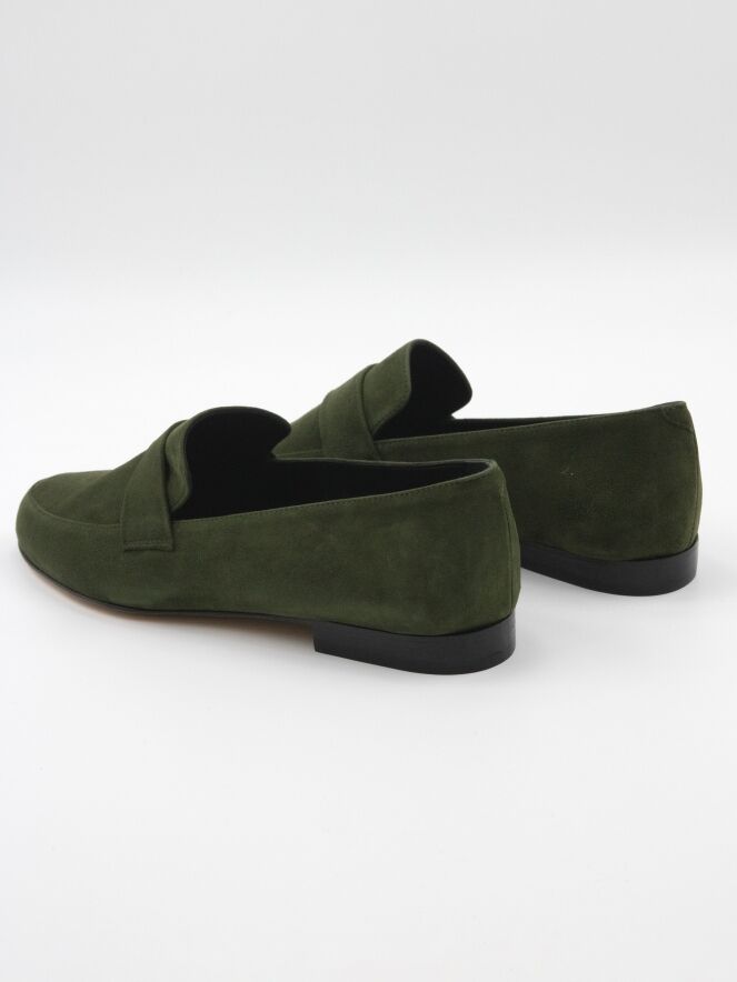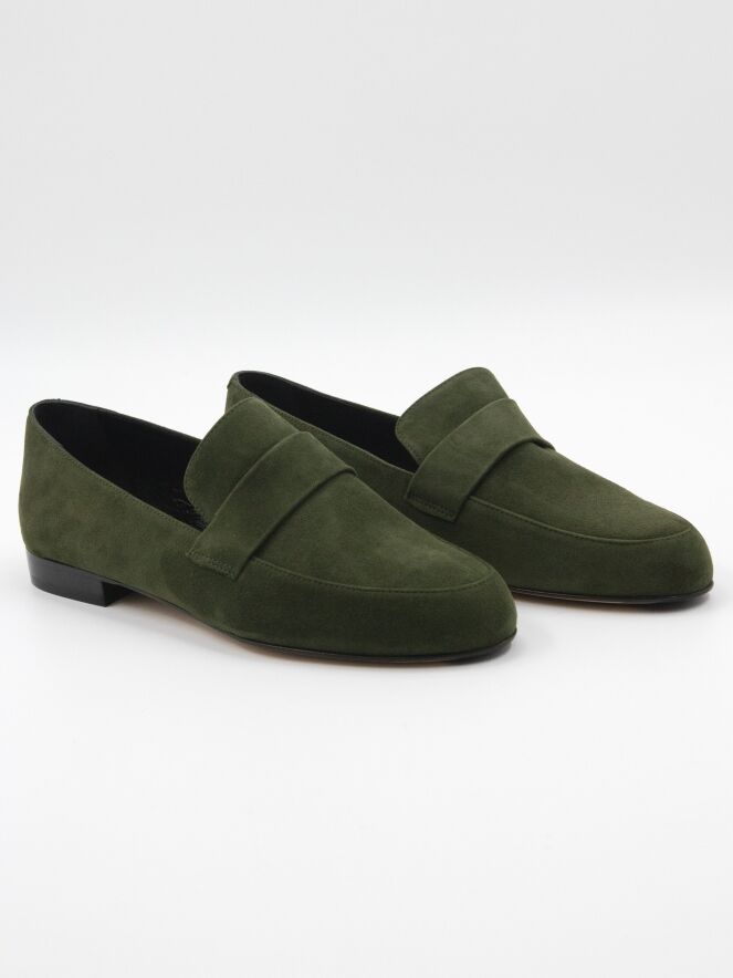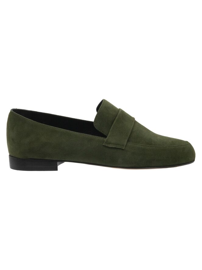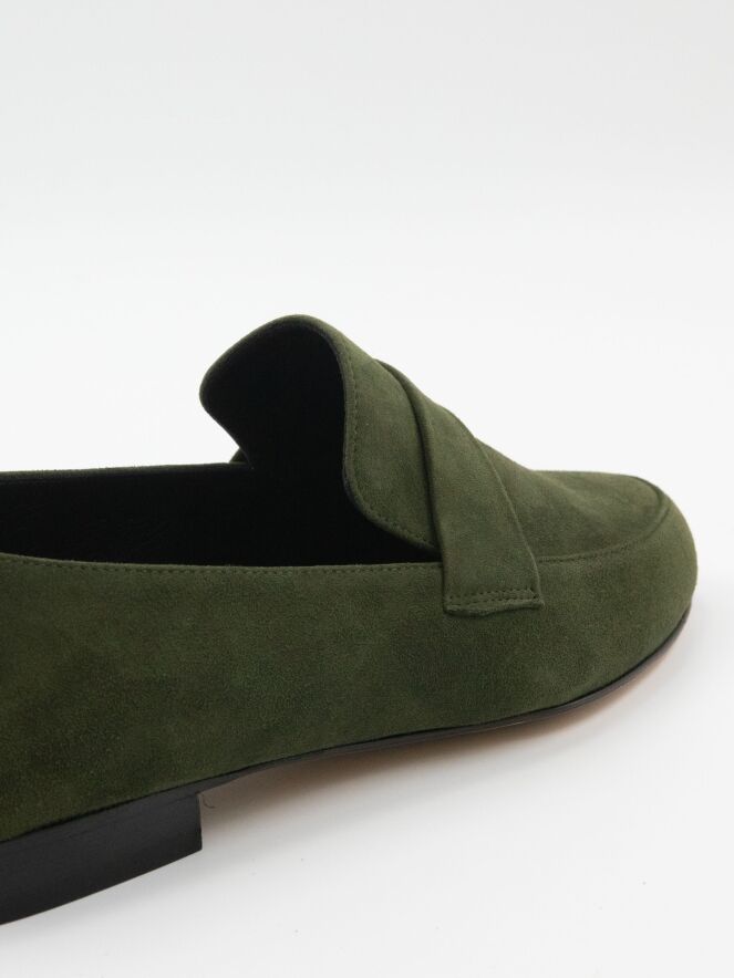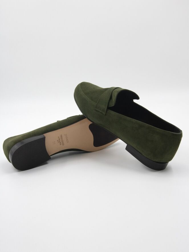 A slip-on shoe by Panara in olive green. Across the rounded toe runs a narrow strap made of the same material as the shoe. The interior is lined with leather.