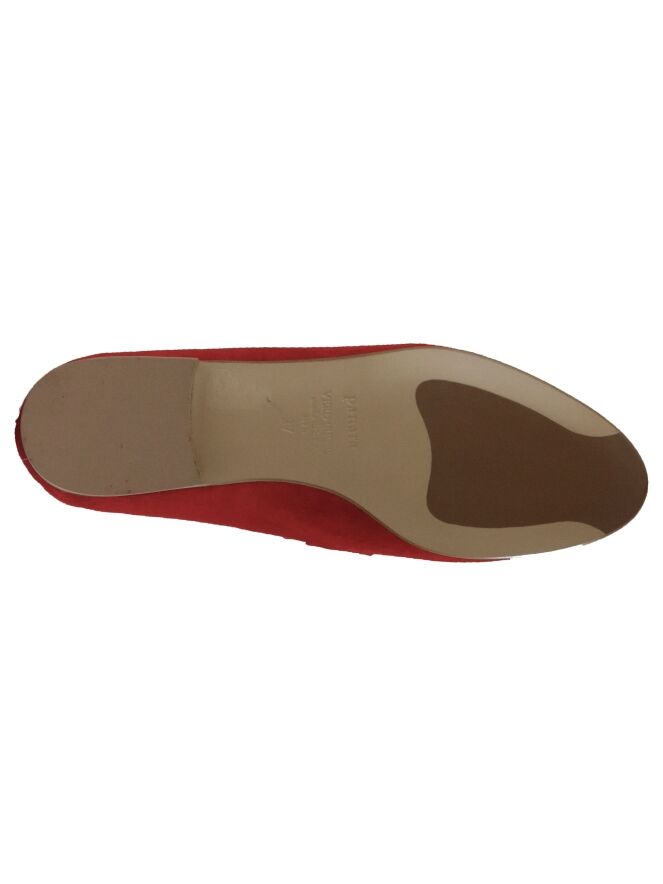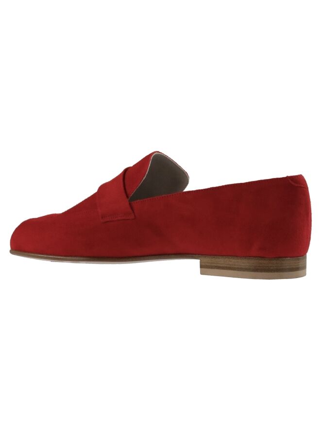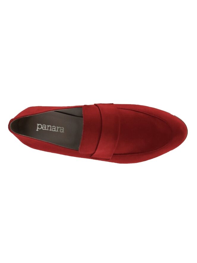 A slip-on from Panara in the color red. Over the forefoot with a round toe is a narrow band in the same material as the slip-on. The slip-on is lined with leather on the inside.