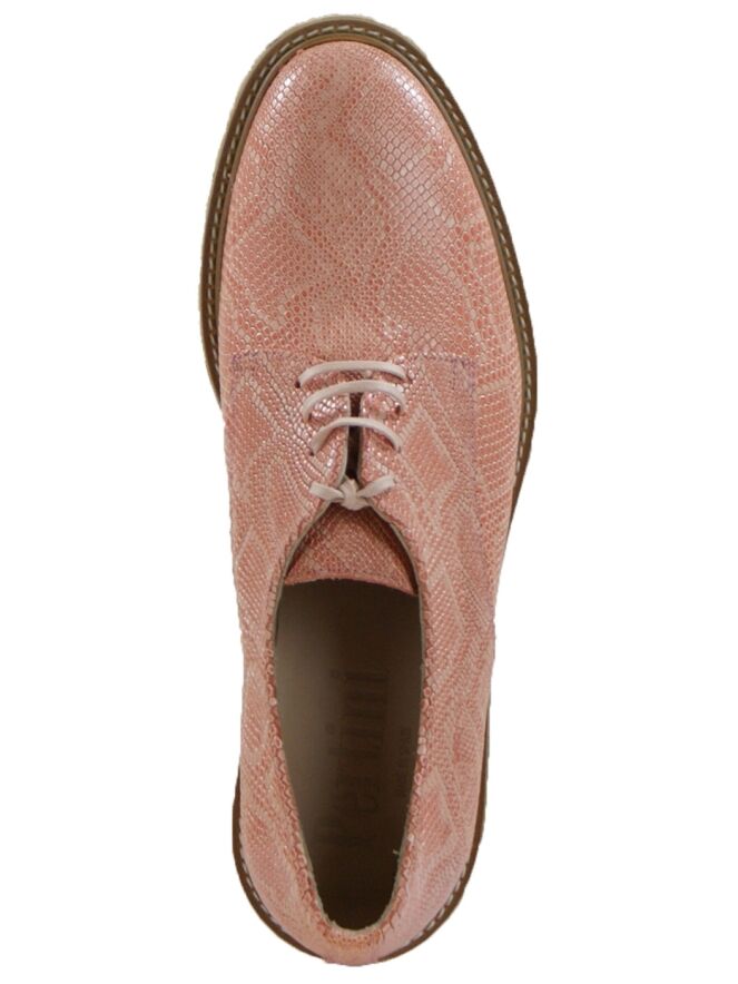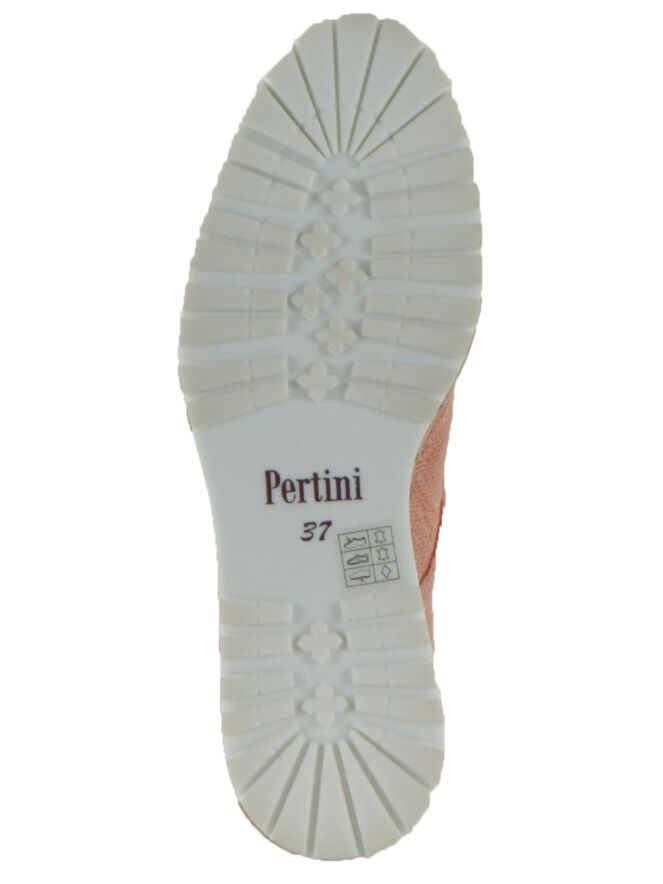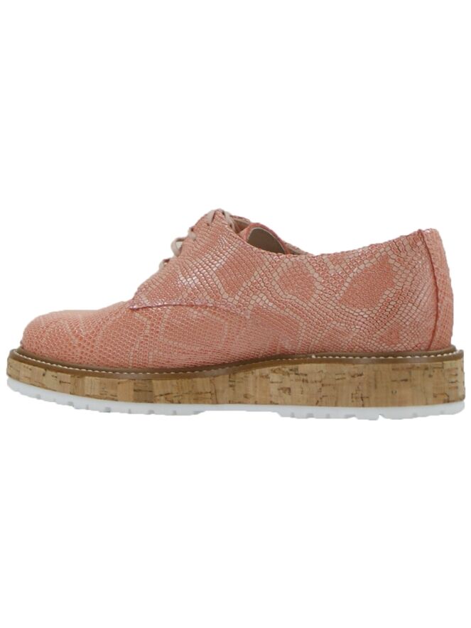 A lace-up shoe by the brand Pertini in a reptile print with multiple colors red. The sole is made up of Cork with imitation rubber with a wide quilted band. This lace-up shoe is leather lined on the inside.