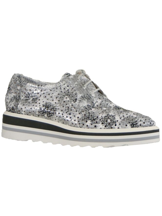 A lace-up shoe by the brand Pertini in a reptile print with multiple colors grey and white. The leather of the shoe is perforated. The sole is made in 3 colors. This lace-up shoe is leather lined on the inside.