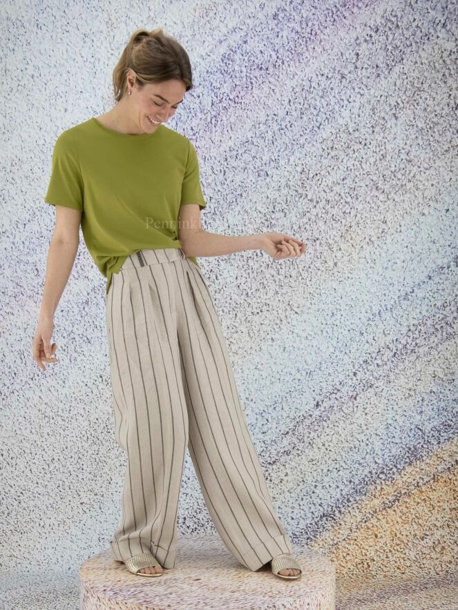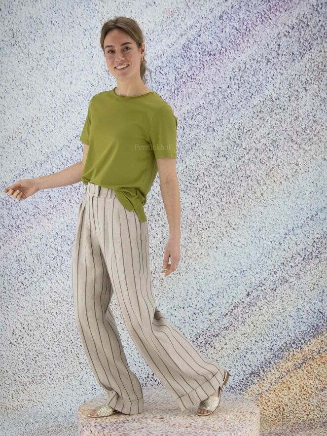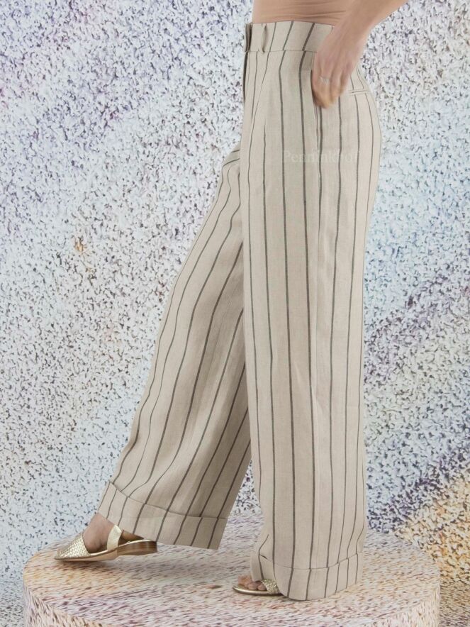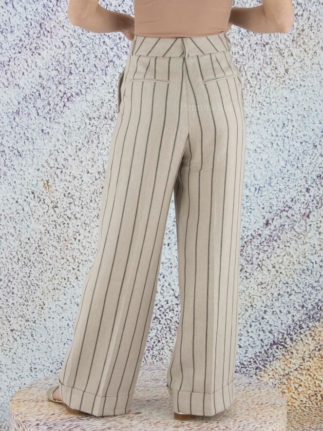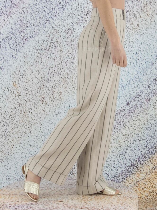 Wide pants by Peserico in a pinstripe with the colors dark gray and beige. There are some pleats from the waist. At the bottom of the wide legs is a wide cover. The pants have side pockets and can be washed by hand.