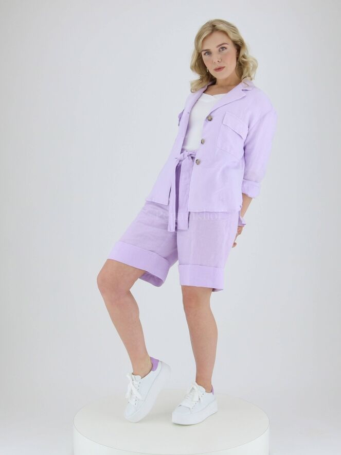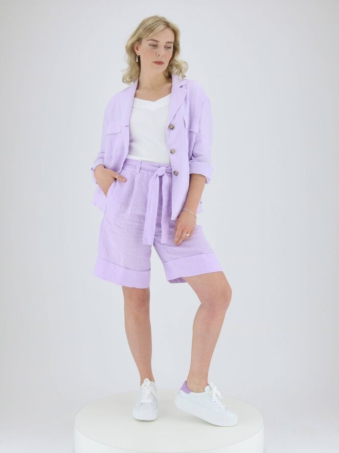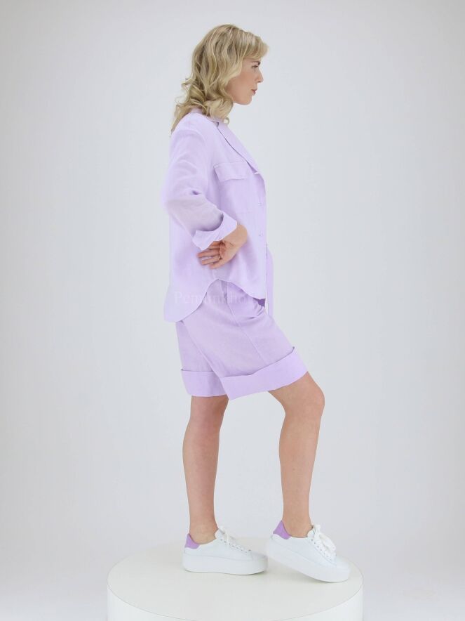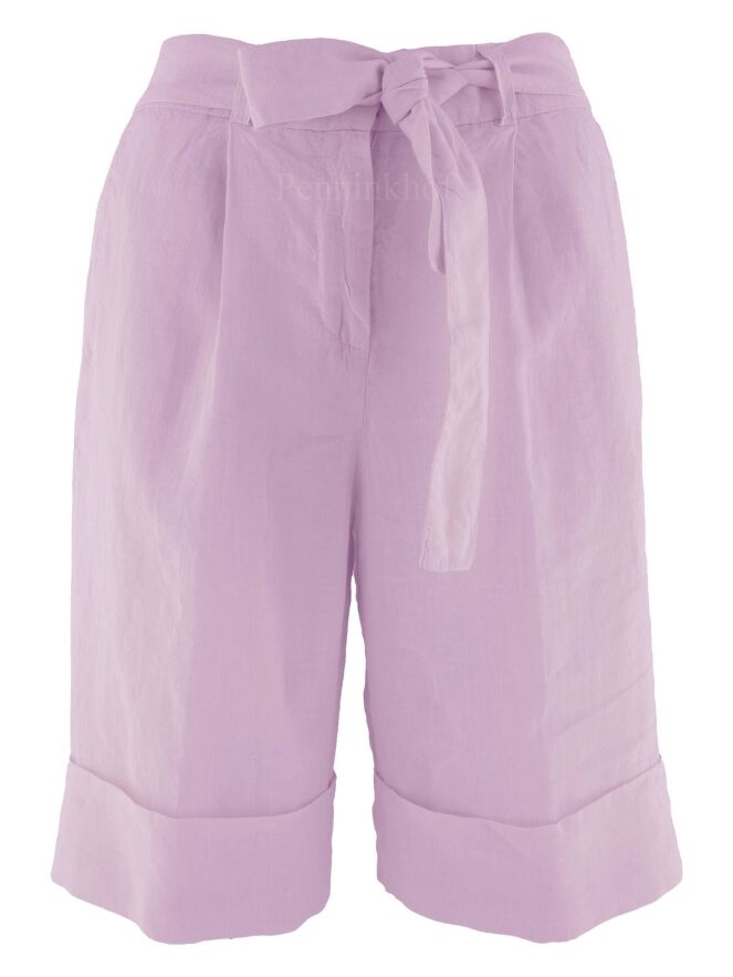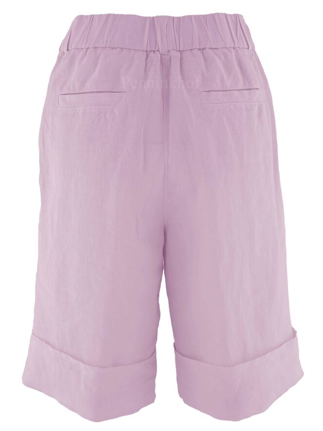 Bermuda shorts from Peserico in a lilac color. In the waist at the back is a finely pleated elastic band. The Bermuda has a belt in the same fabric as the Bermuda itself. There are side pockets below the waistband and a wide turn-up at the bottom of the legs. these Bermuda shorts can be washed at 30 degrees.